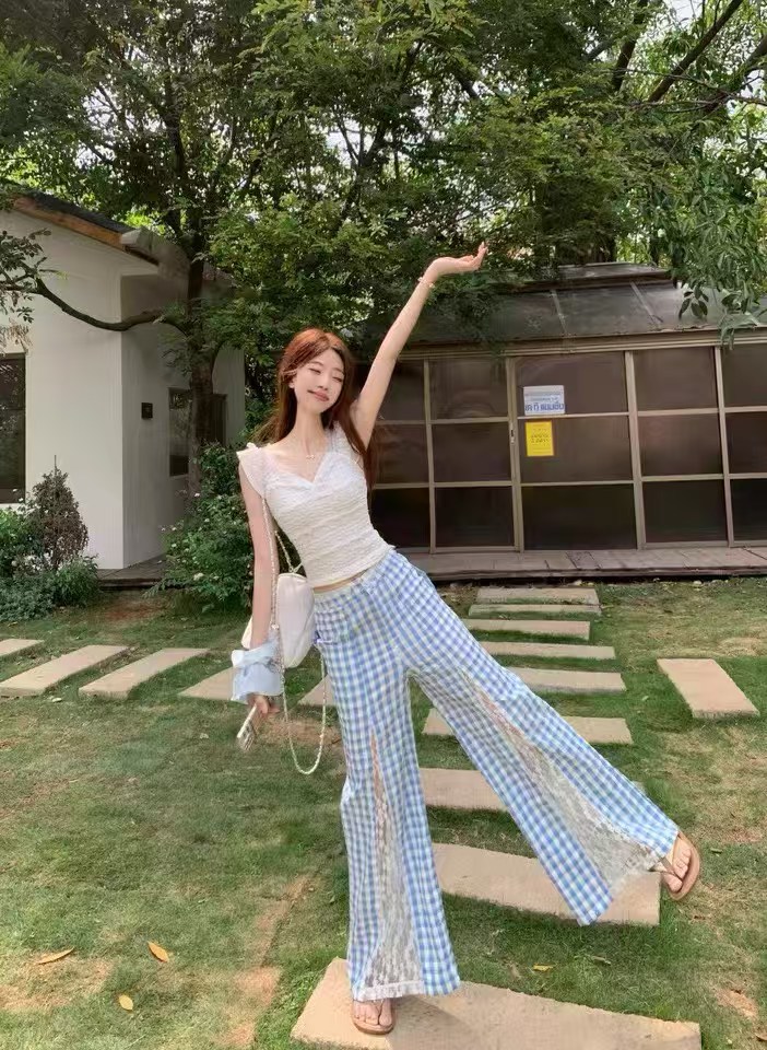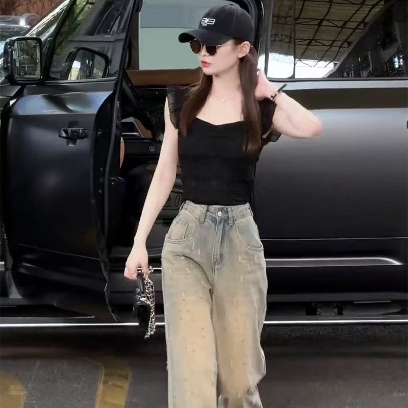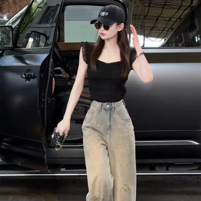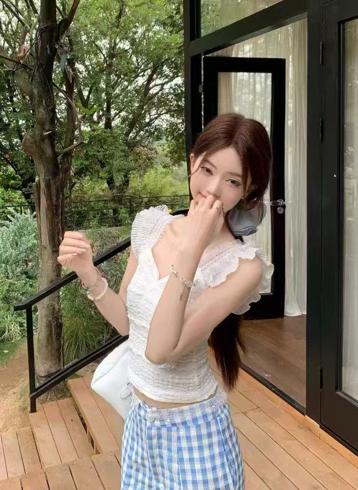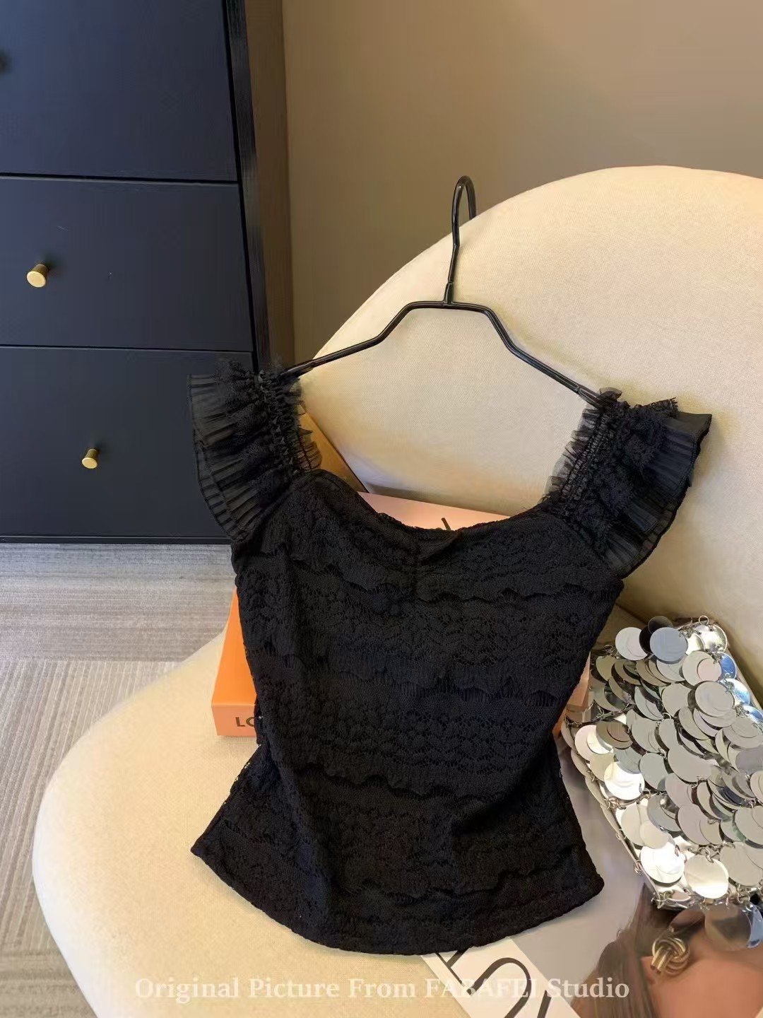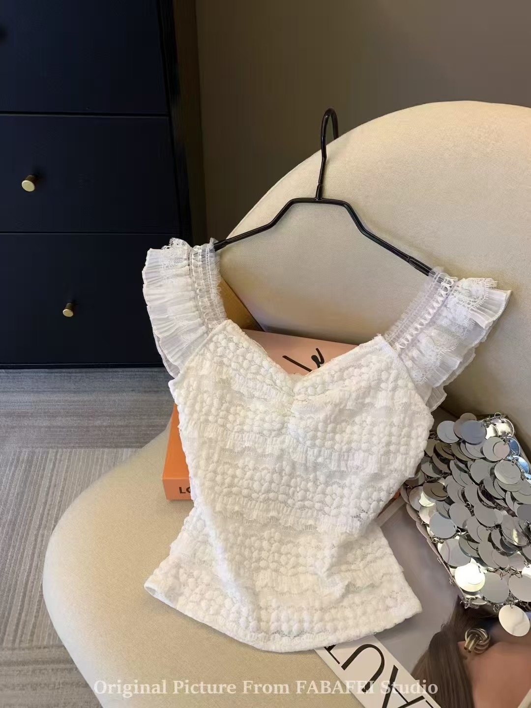 Pure Desire 작은 플라잉 슬리브 레이스 캐미솔 여성 여름 디자인 기질 작은 셔츠 뜨거운 소녀 핀치 허리 세련된 작은 탑스토어 가기