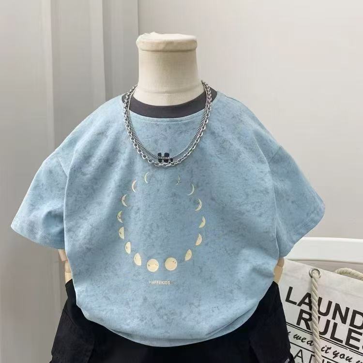 100% 면 아동용 남성 및 여성 2025 여름 새로운 한국식 타이 염색 프린트 라운드 넥 반팔 티셔츠 탑