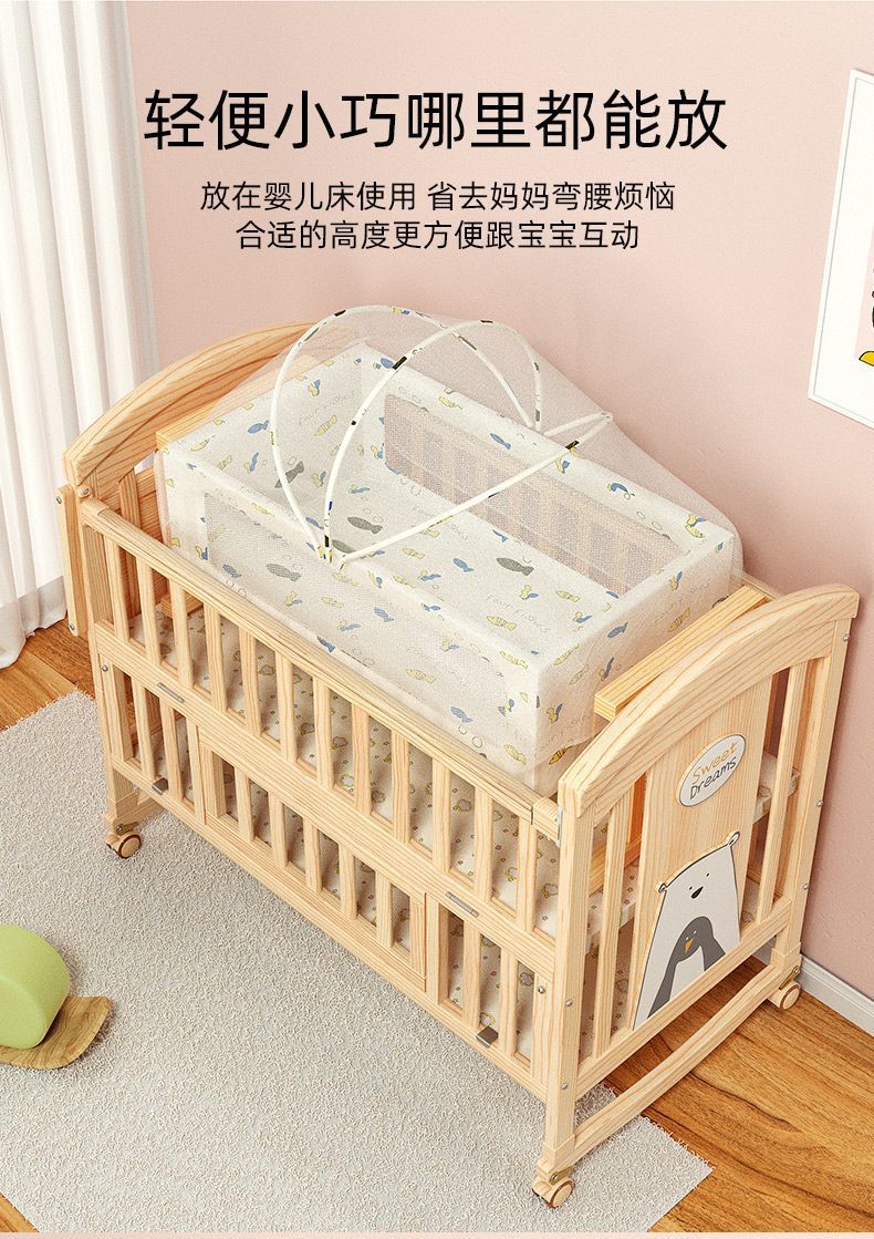 • 페인트가 없는 단순한 단단한 나무 요람 + 바퀴 + 모기장