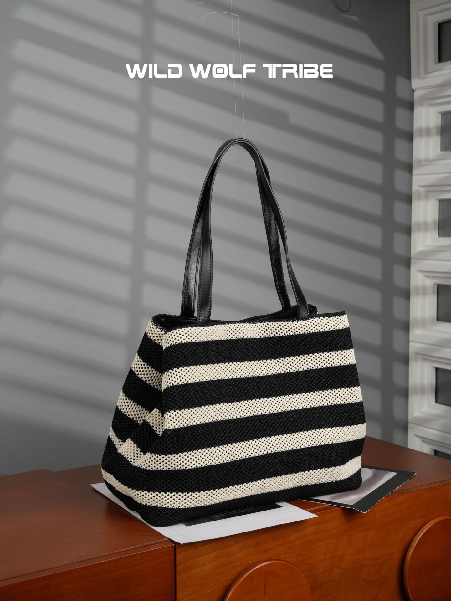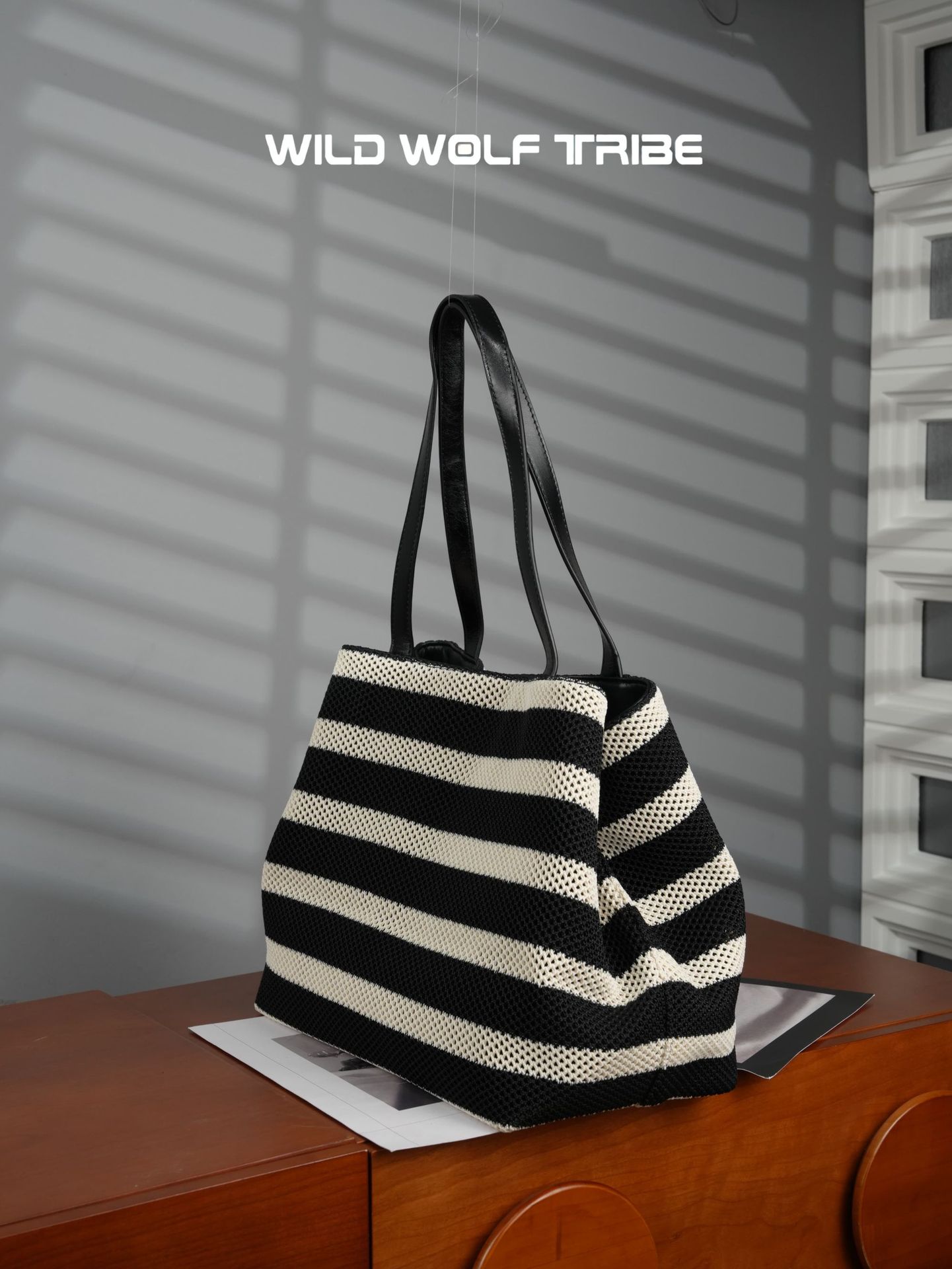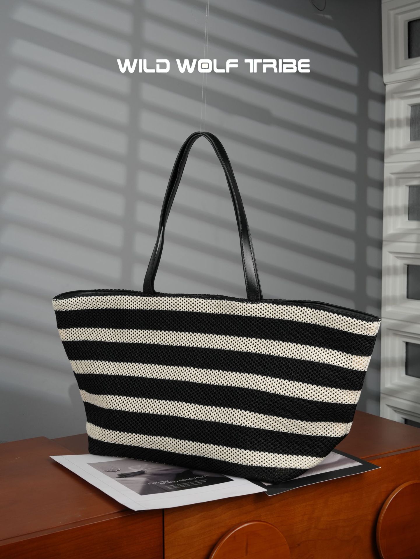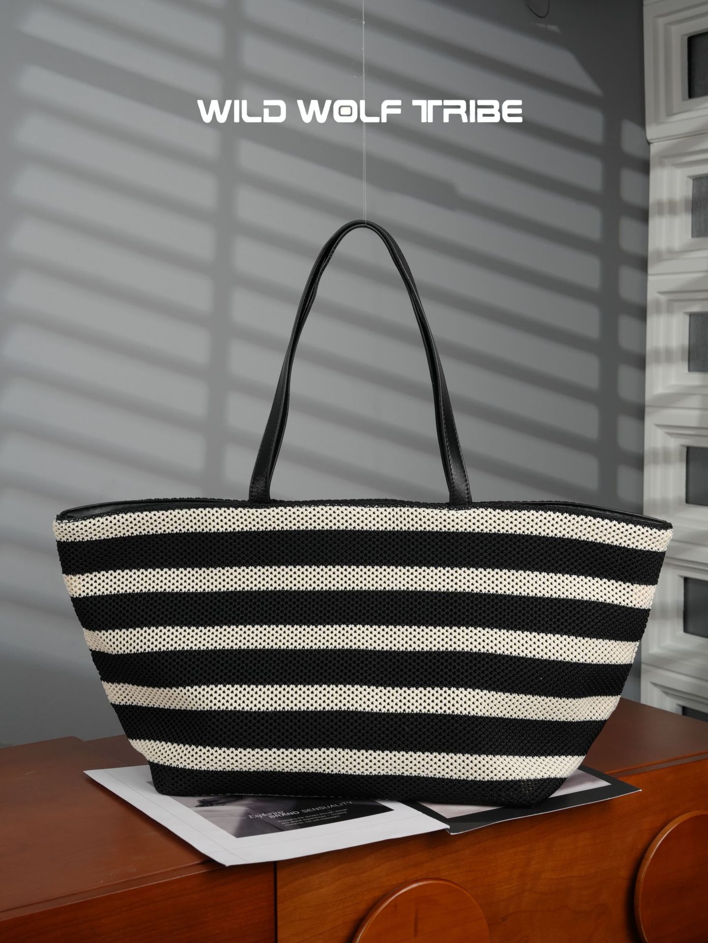 고급 흑백 줄무늬 토트 백 짠 대용량 숄더백 여성용 게으른 스타일 경량 휴가 가방 쇼핑백