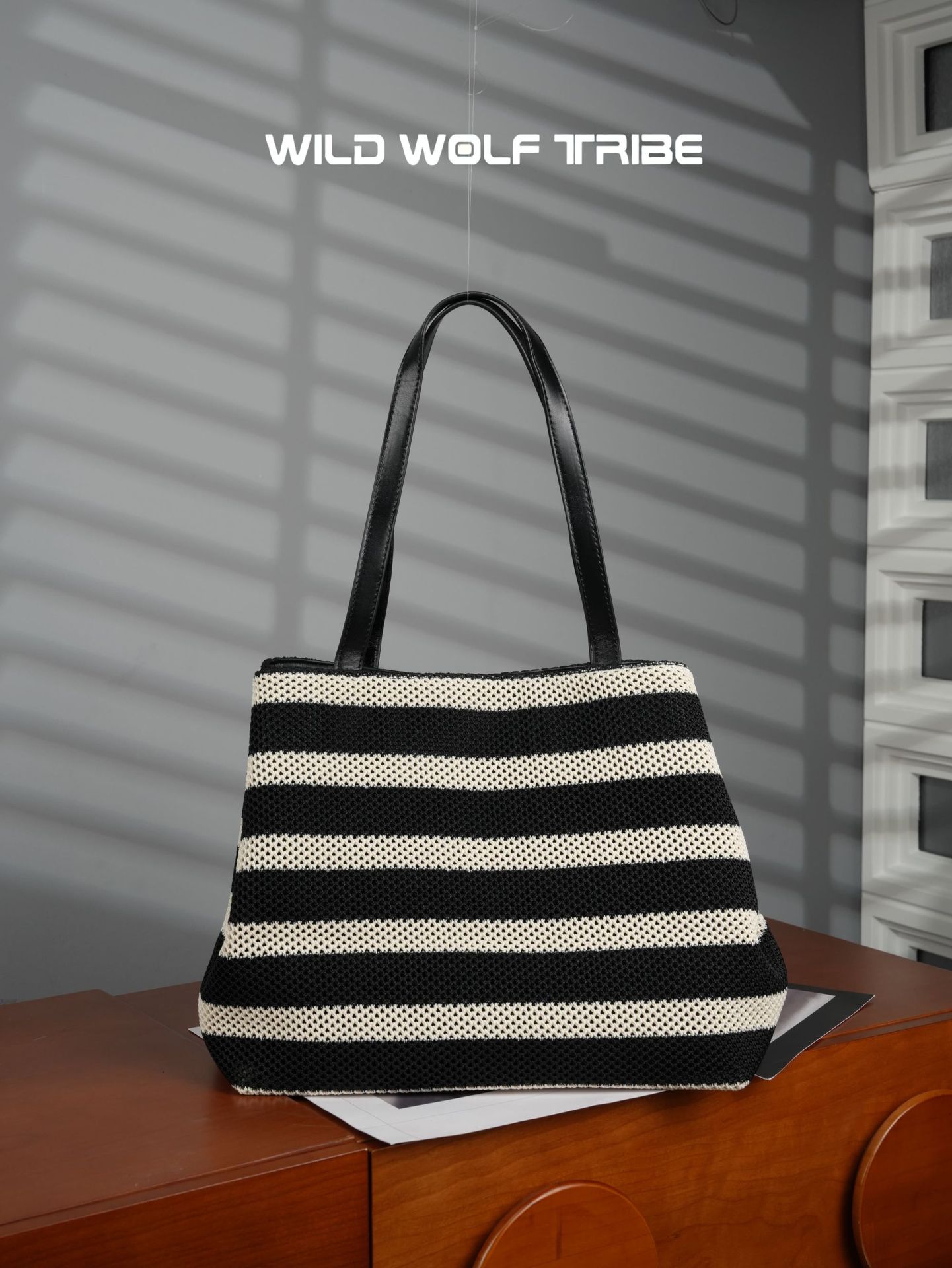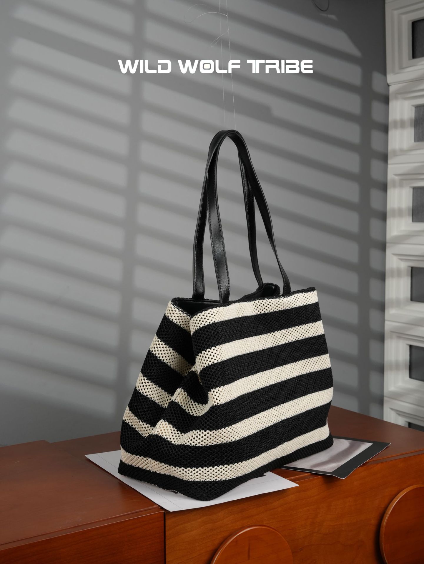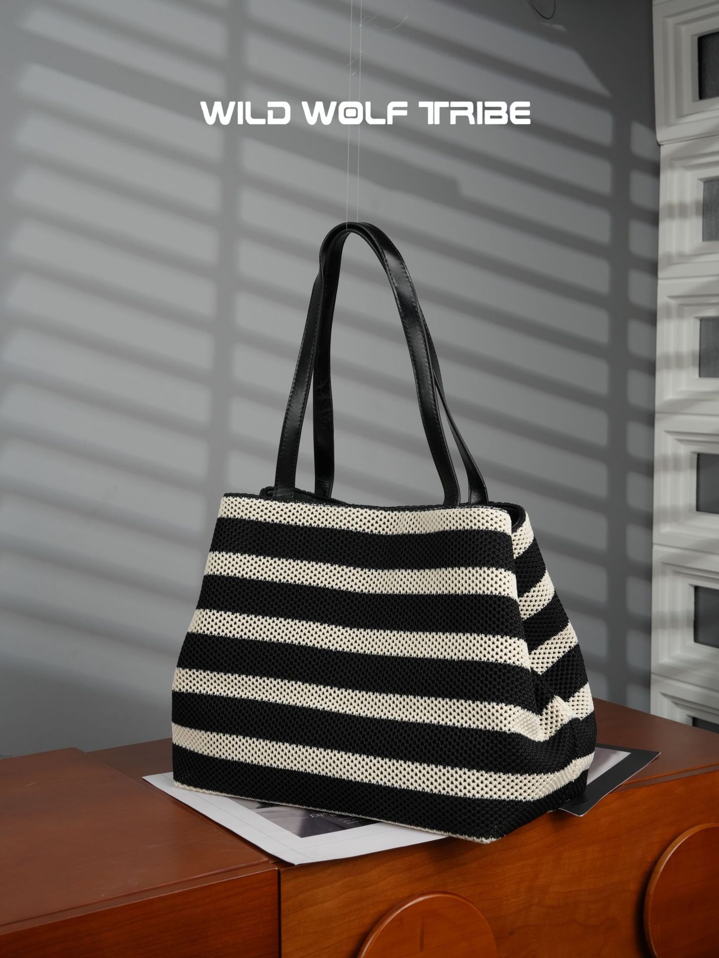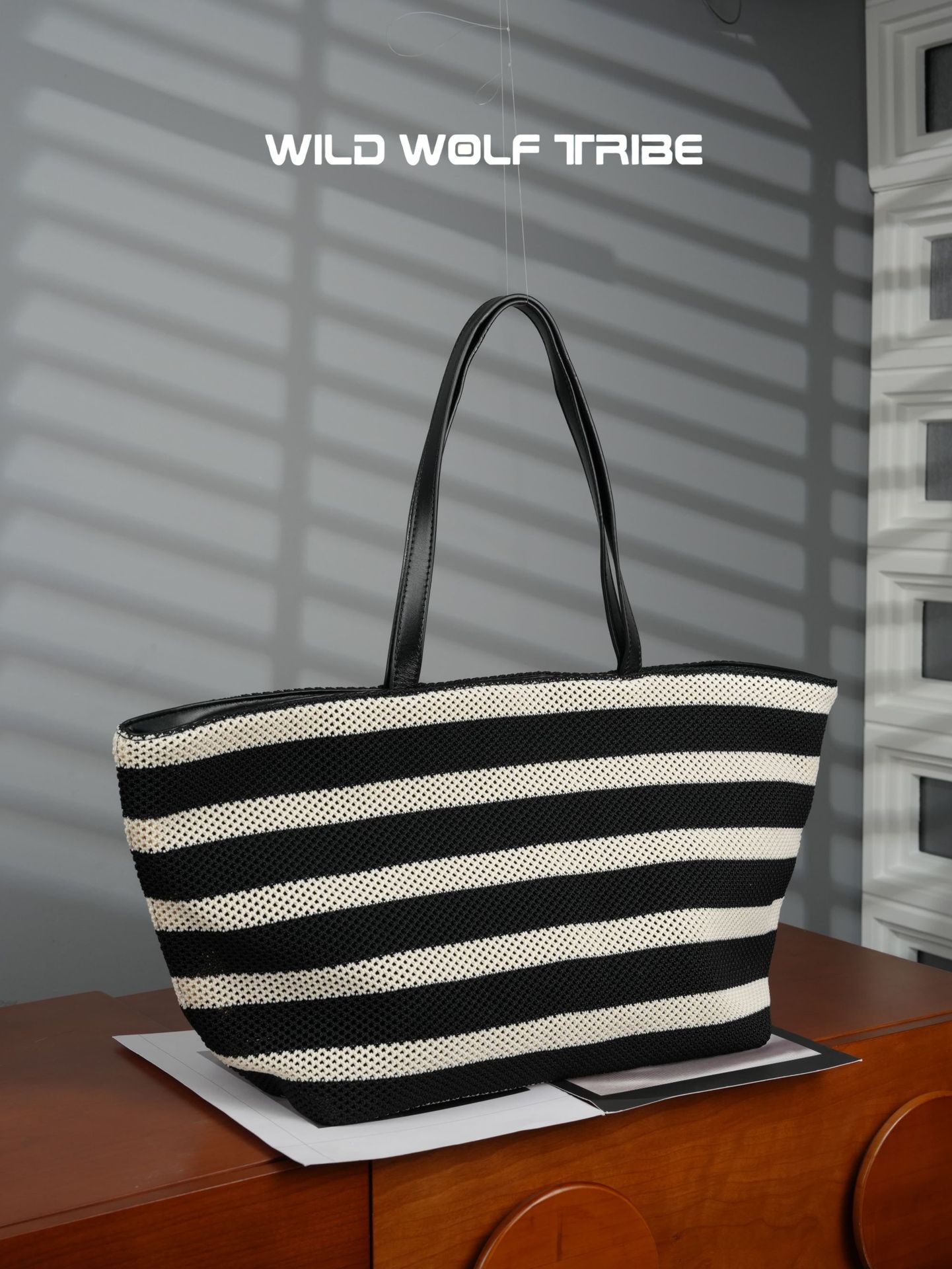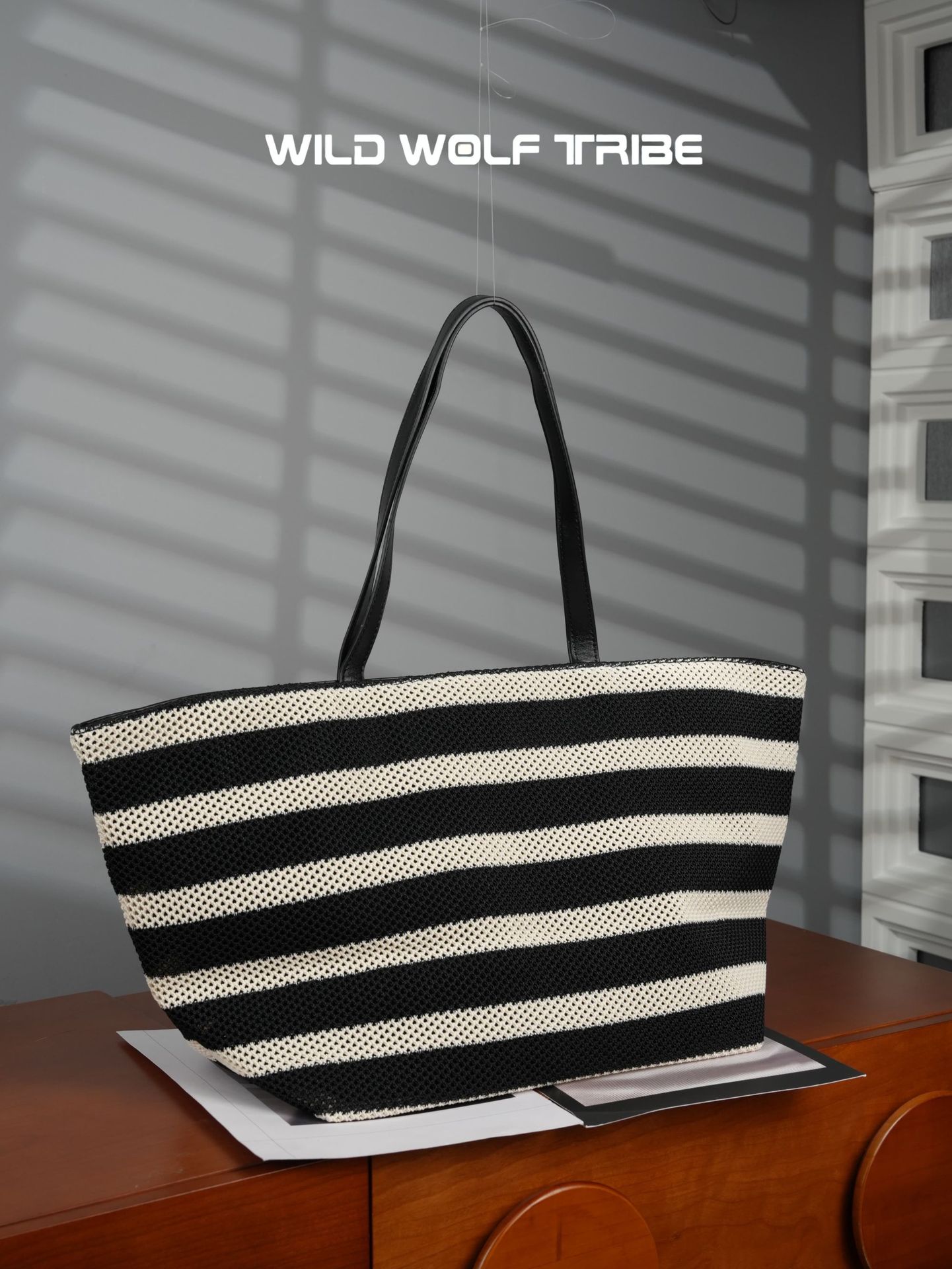 고급 흑백 줄무늬 토트 백 짠 대용량 숄더백 여성용 게으른 스타일 경량 휴가 가방 쇼핑백