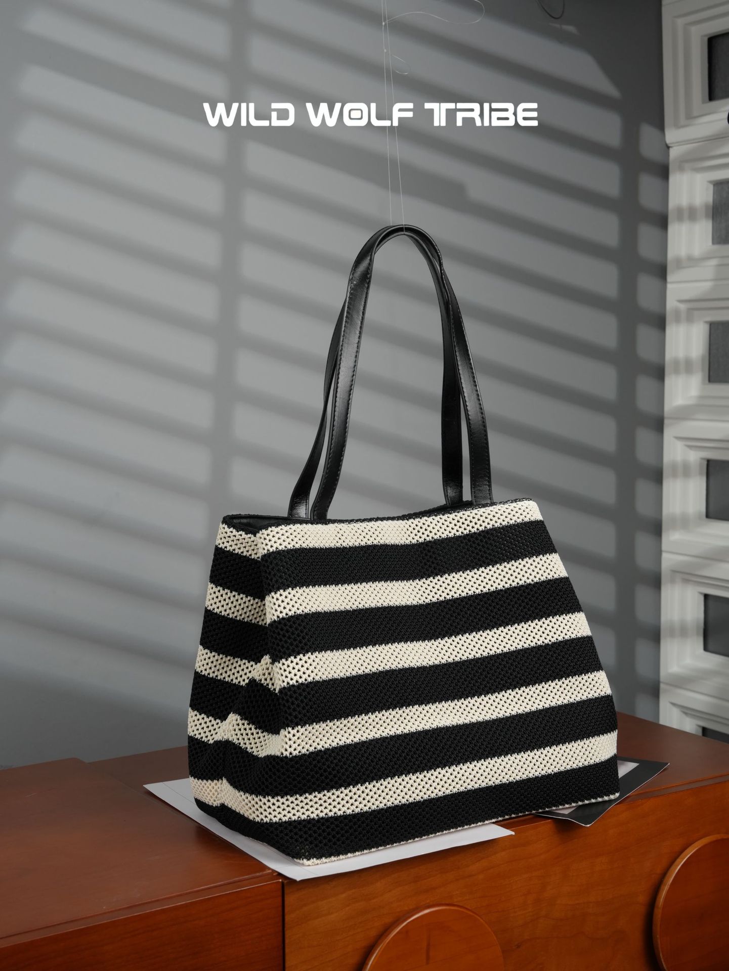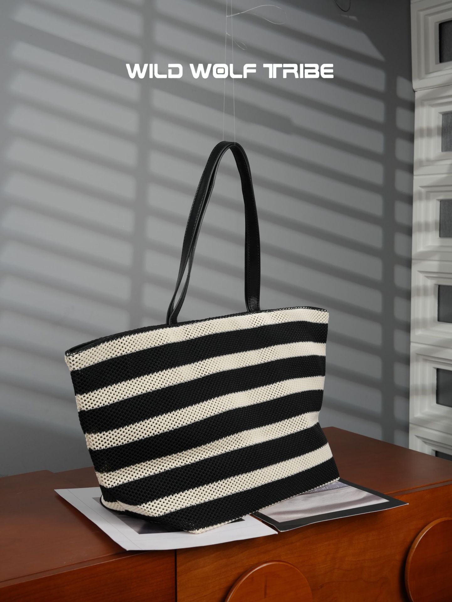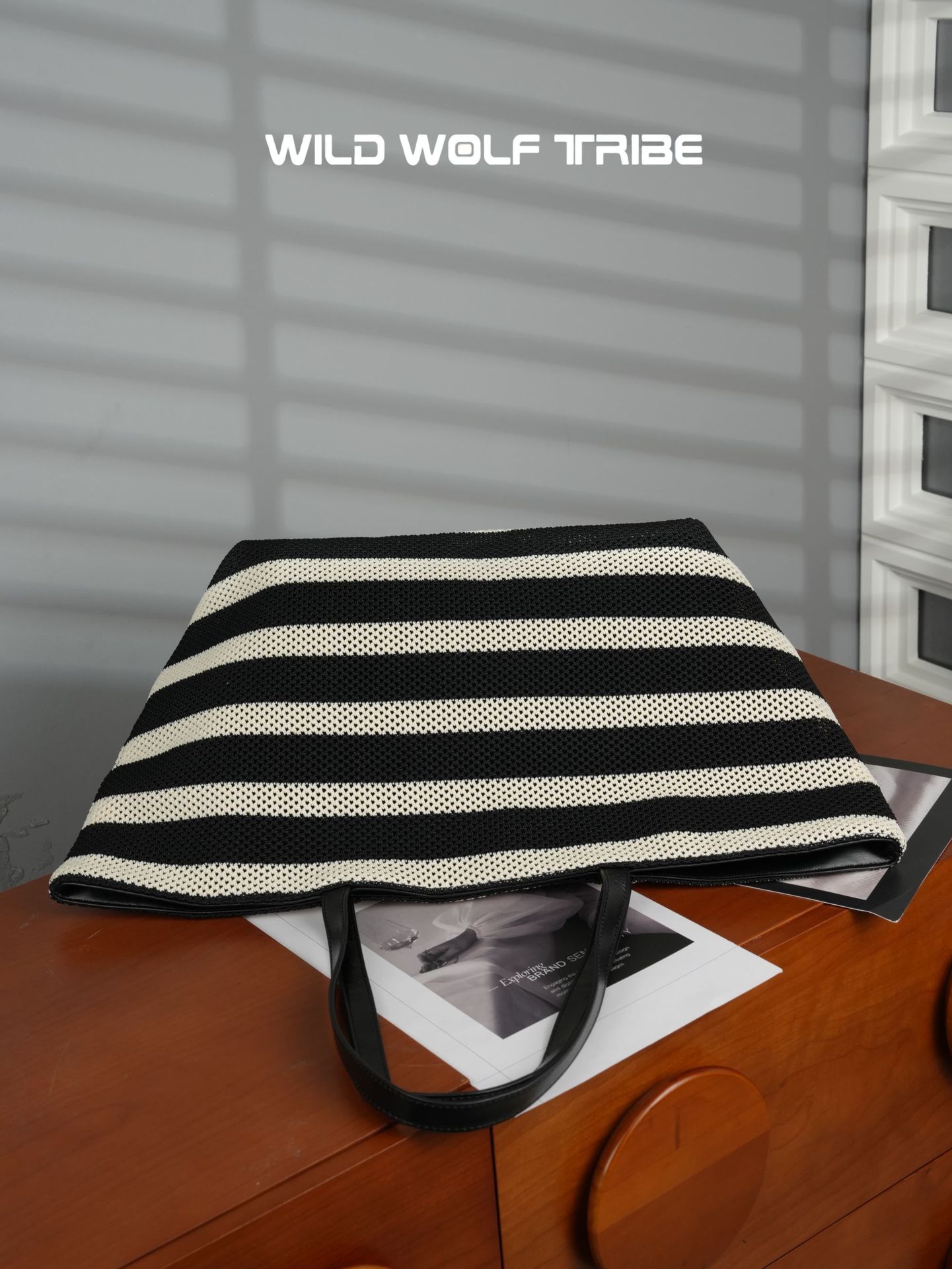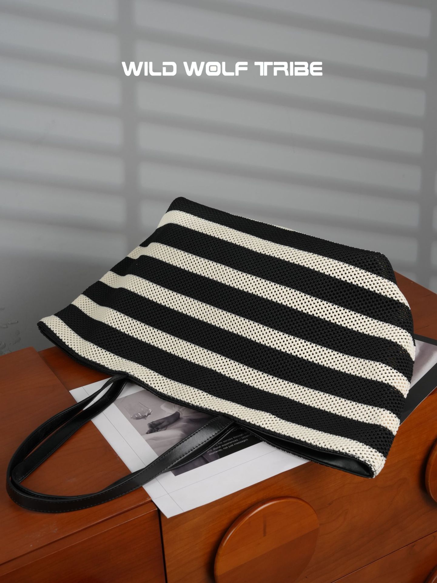고급 흑백 줄무늬 토트 백 짠 대용량 숄더백 여성용 게으른 스타일 경량 휴가 가방 쇼핑백