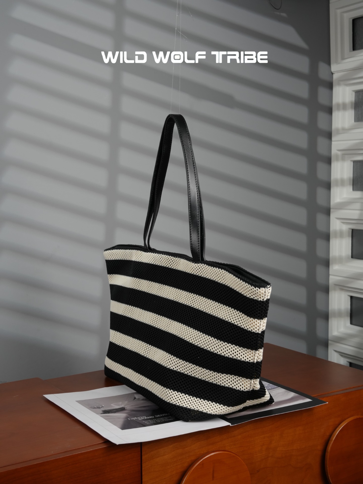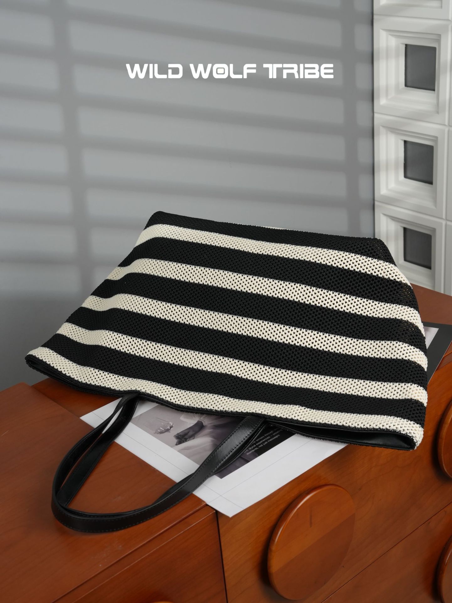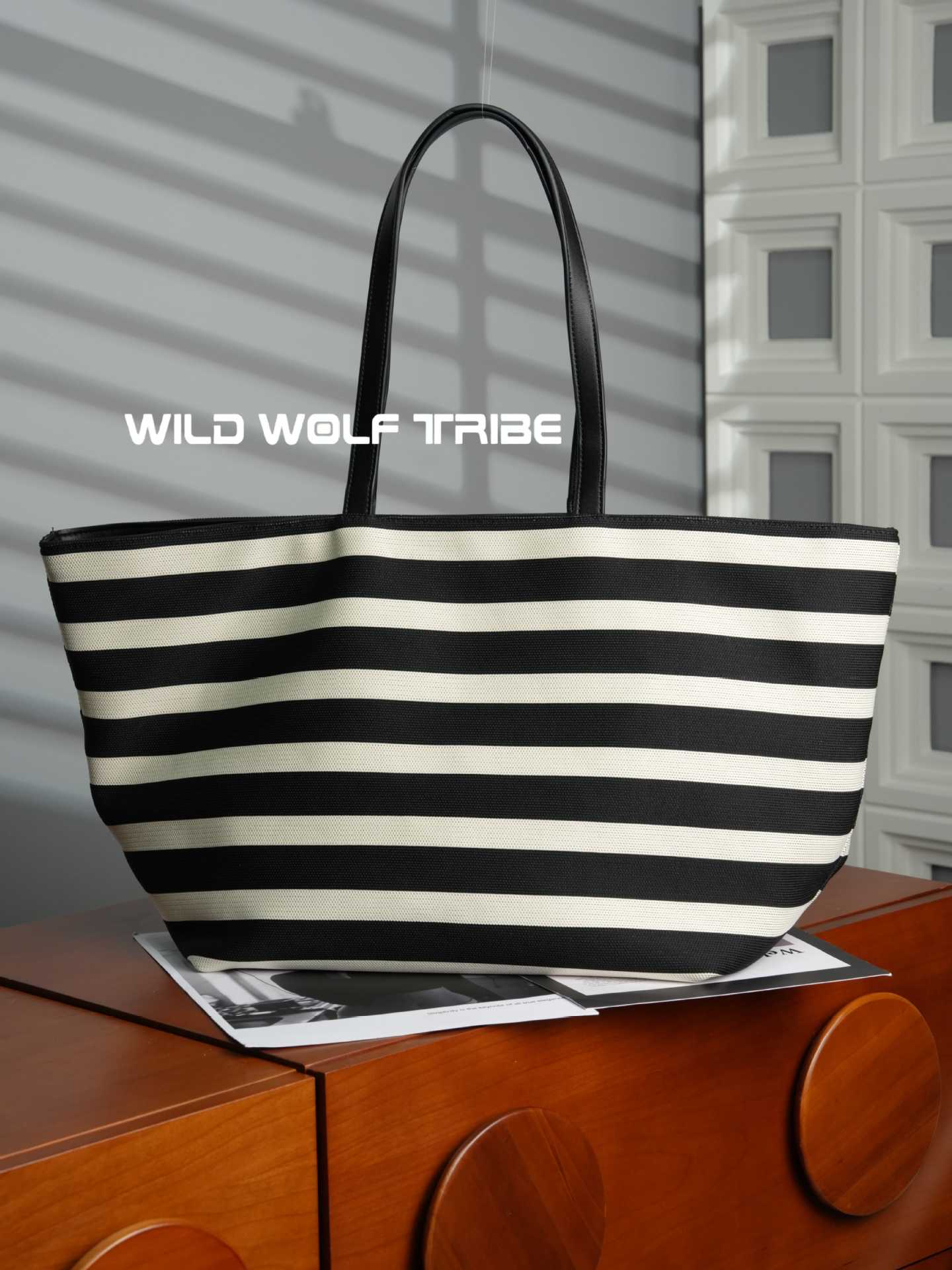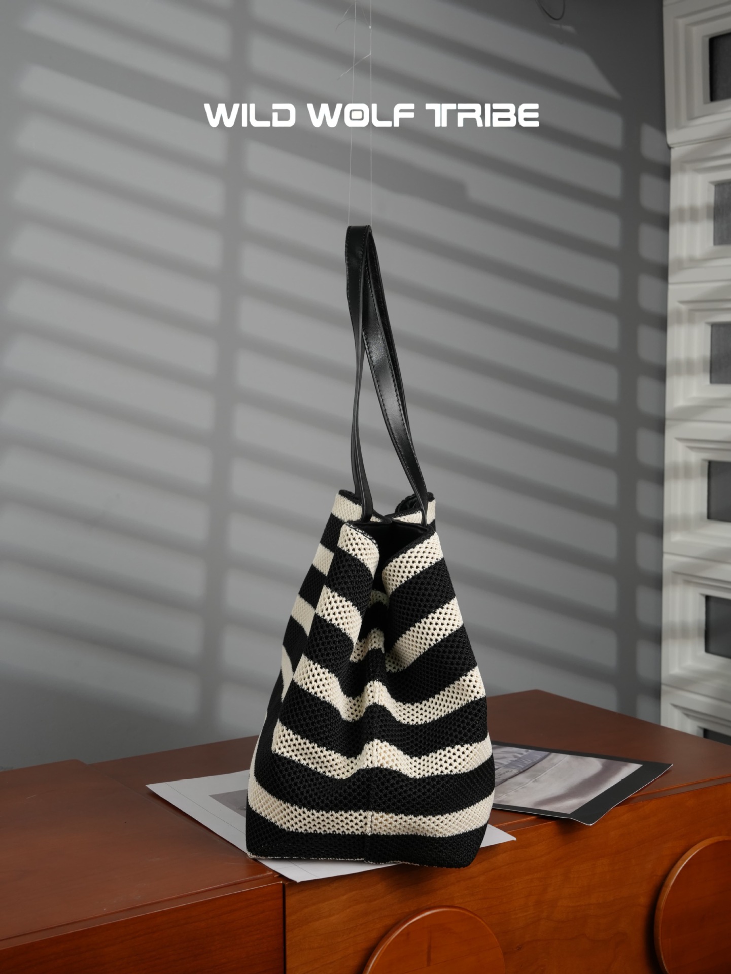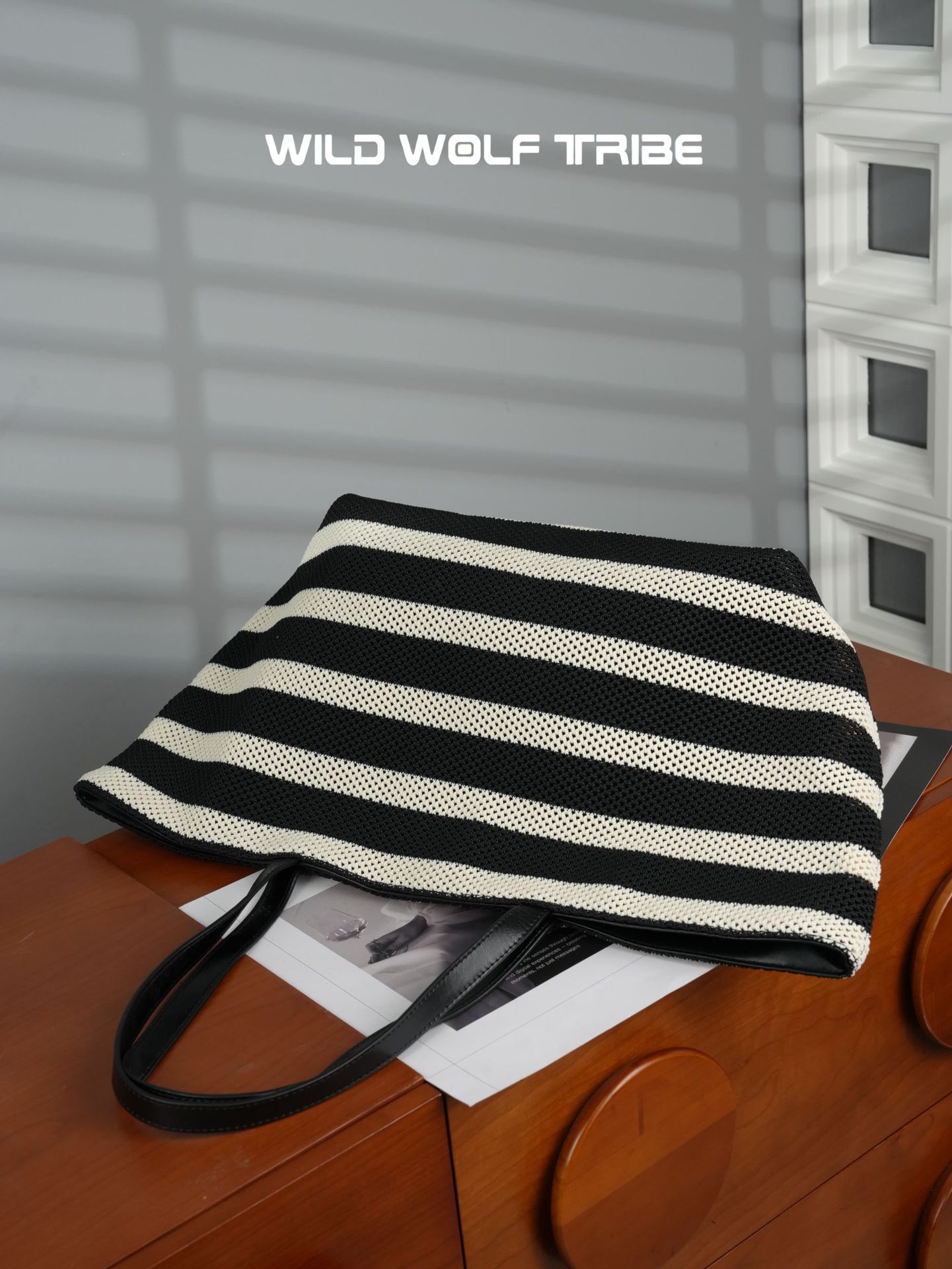 고급 흑백 줄무늬 토트 백 짠 대용량 숄더백 여성용 게으른 스타일 경량 휴가 가방 쇼핑백
