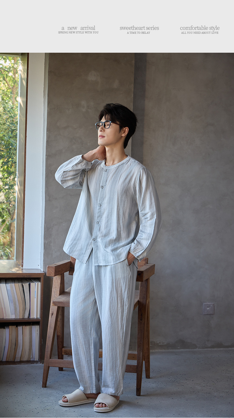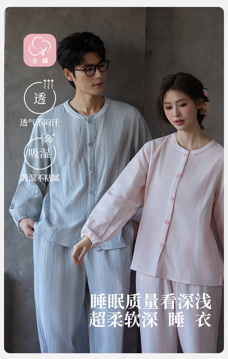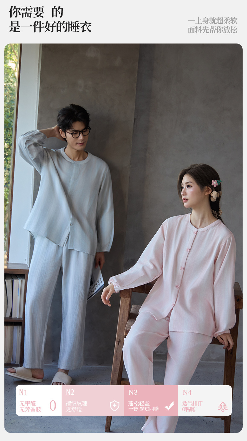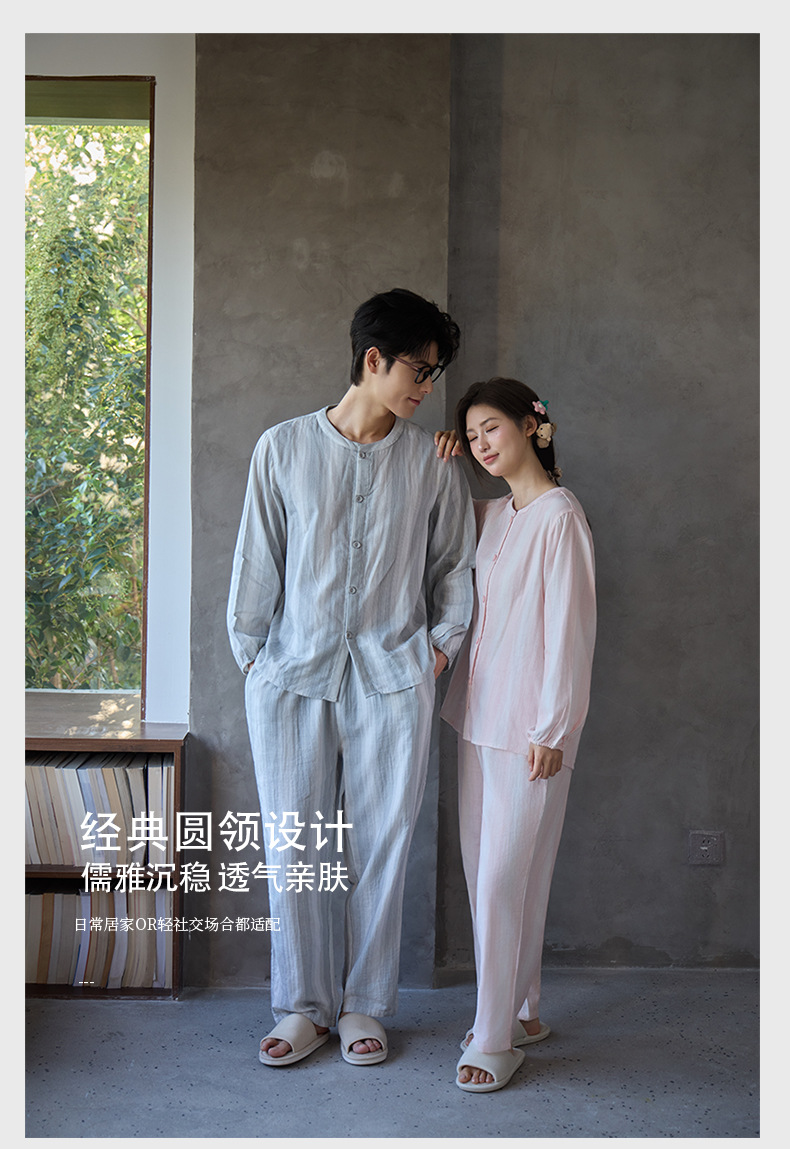 무인쇄 스타일 새로운 그라데이션 스트라이프 순면 잠옷 더블 레이어 거즈 봄, 가을, 여름 남성과 여성 커플 홈웨어 세트스토어 가기