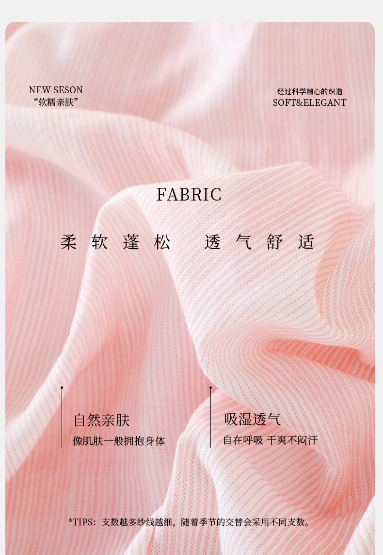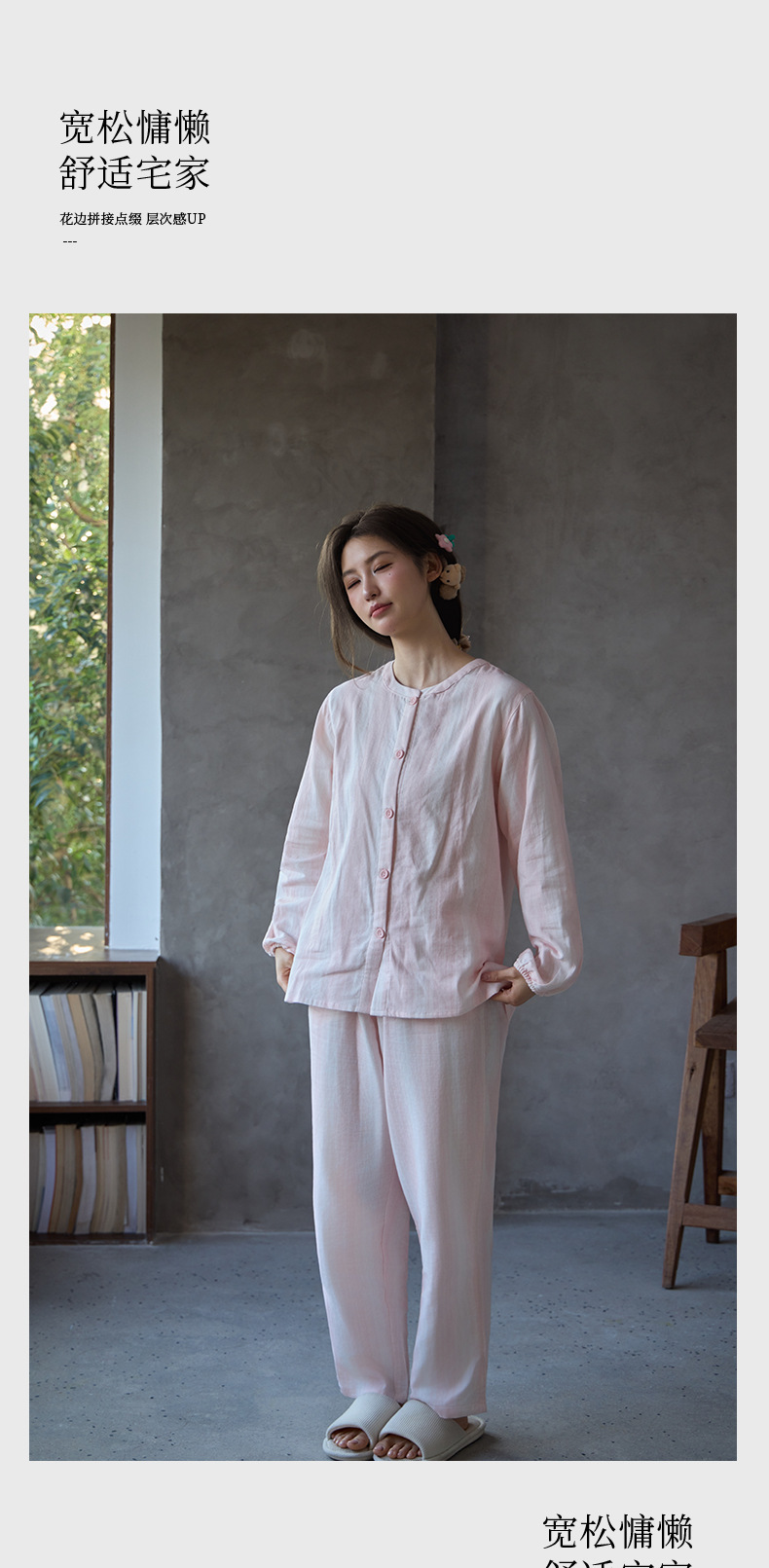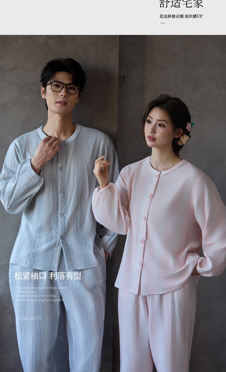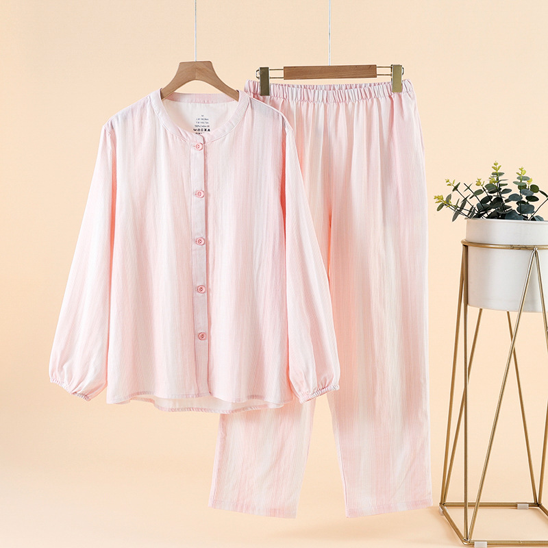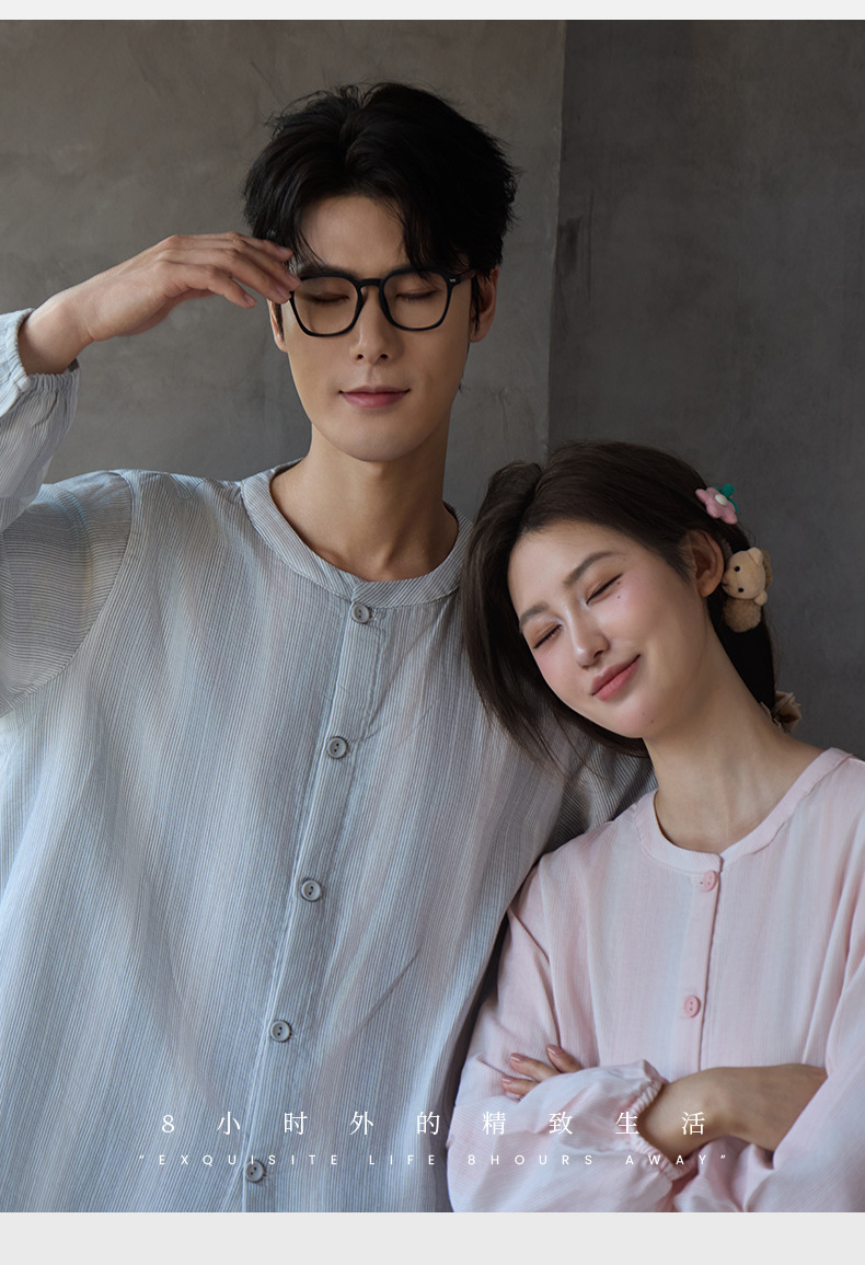 무인쇄 스타일 새로운 그라데이션 스트라이프 순면 잠옷 더블 레이어 거즈 봄, 가을, 여름 남성과 여성 커플 홈웨어 세트스토어 가기