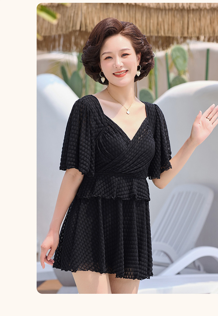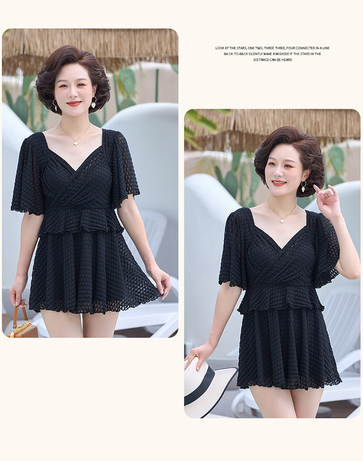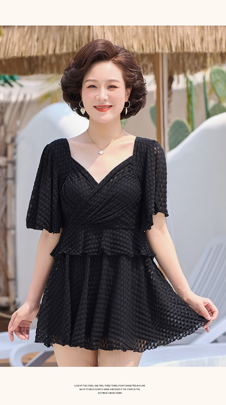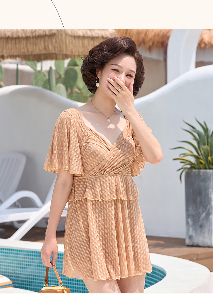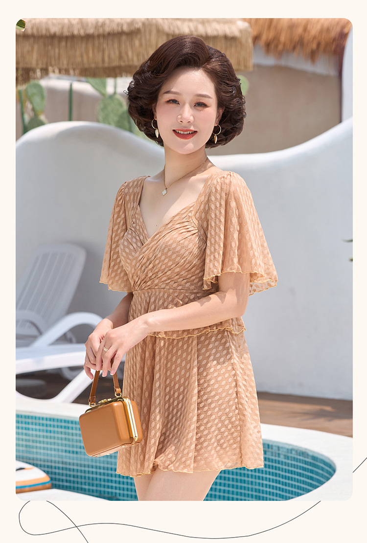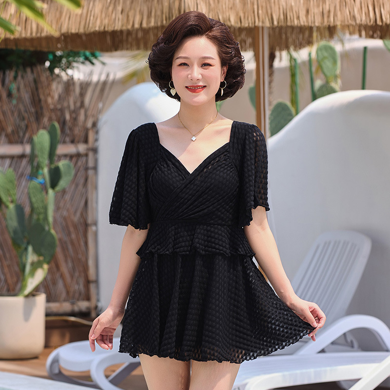 2025 엄마 스타일 반팔 배 커버 스커트 원피스 수영복 여성 엄마 스타일 뚱뚱한 100kg 가슴 패드가있는 복서 팬티스토어 가기
