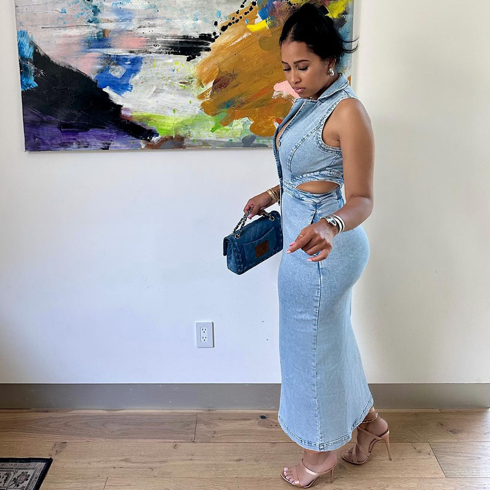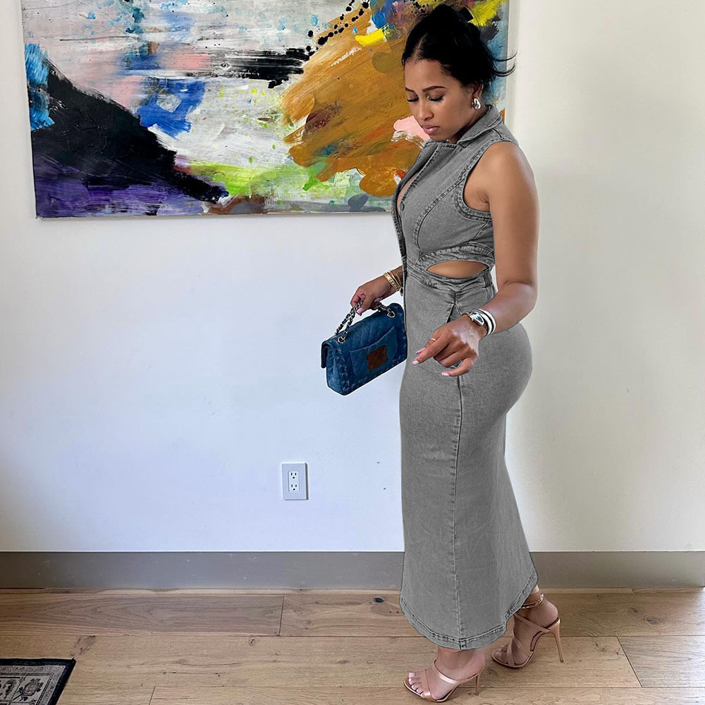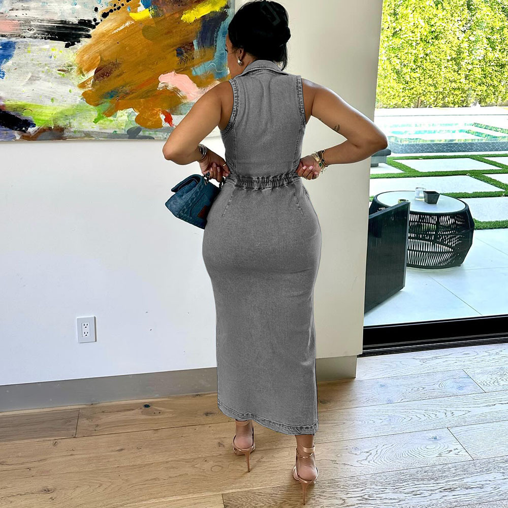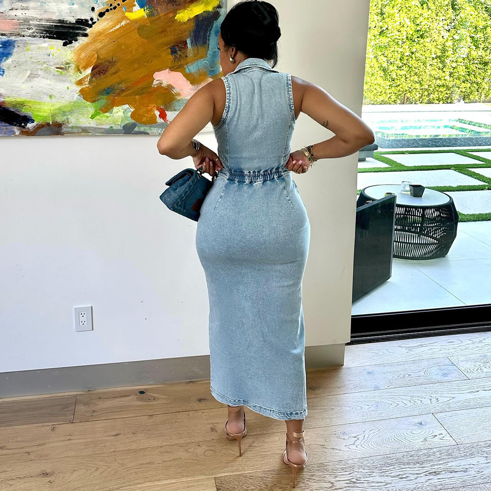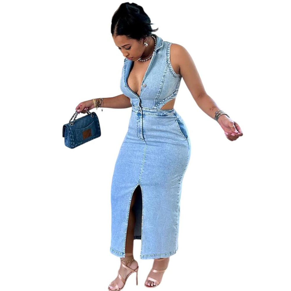 유럽과 미국 여성 데님 드레스 아마존 국경 간 여성 패션 섹시한 민소매 옷깃 슬릿 드레스스토어 가기