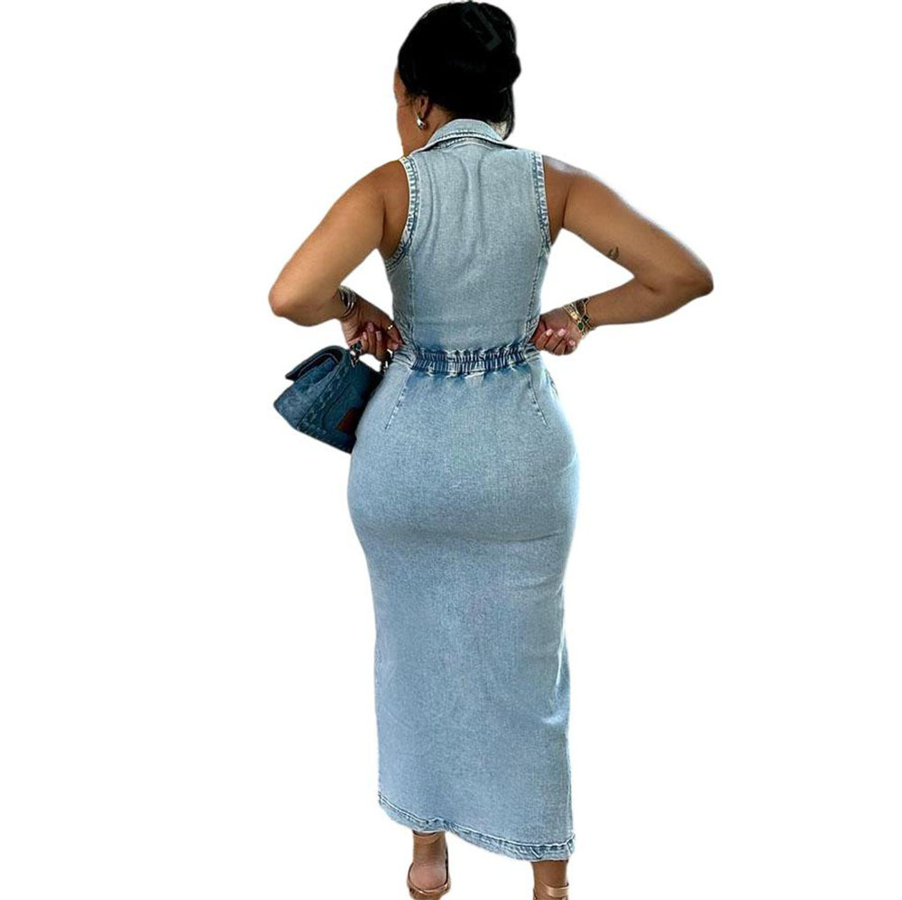 유럽과 미국 여성 데님 드레스 아마존 국경 간 여성 패션 섹시한 민소매 옷깃 슬릿 드레스
