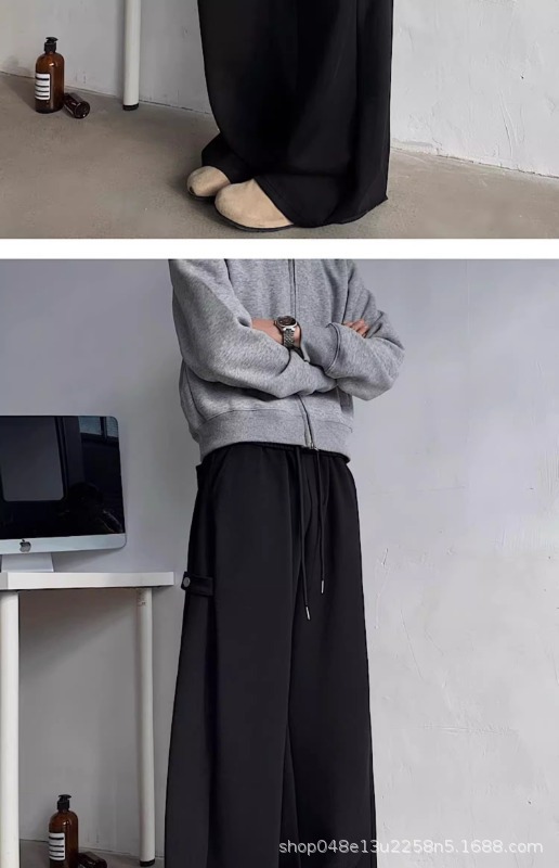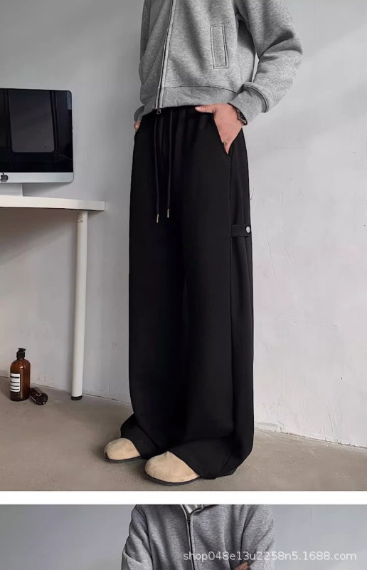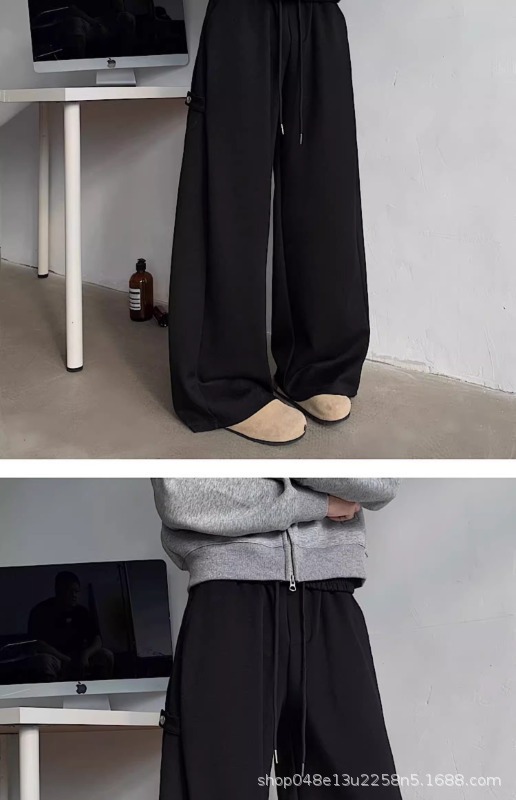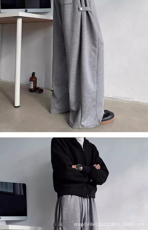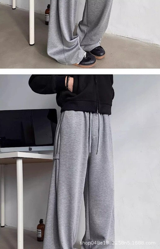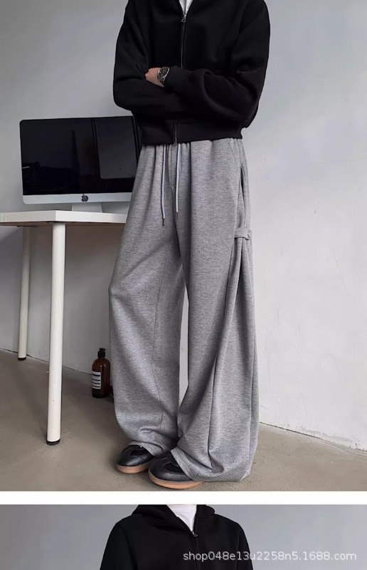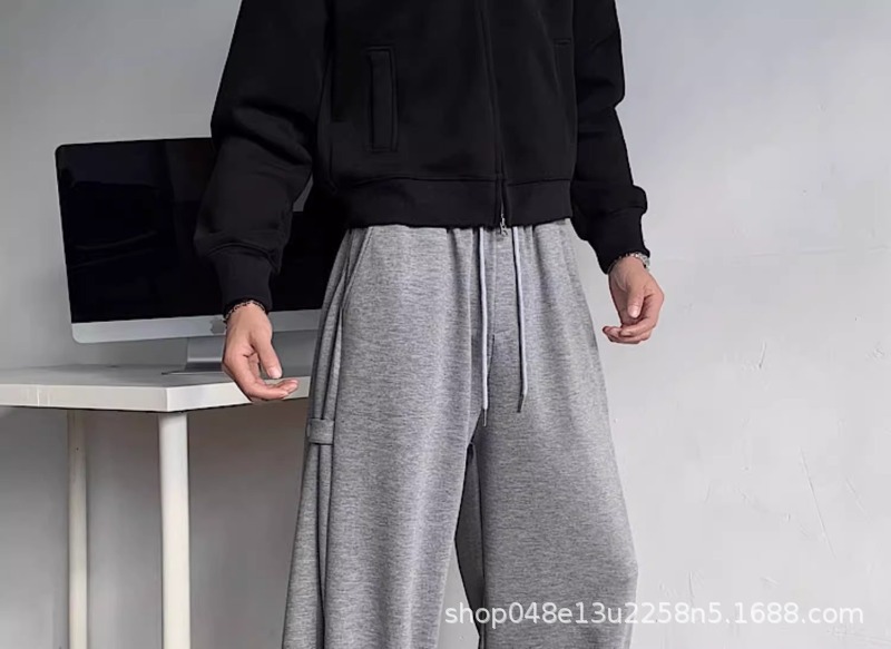 스트랩 디자인이 돋보이는 남성용 고급 그레이 헤비급 와이드 레그 스포츠 팬츠, 캐주얼 팬츠, 루즈한 드레이프 바닥 길이 팬츠스토어 가기