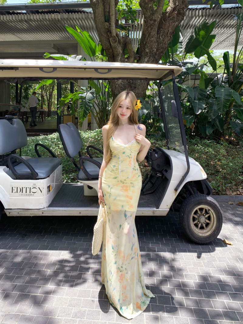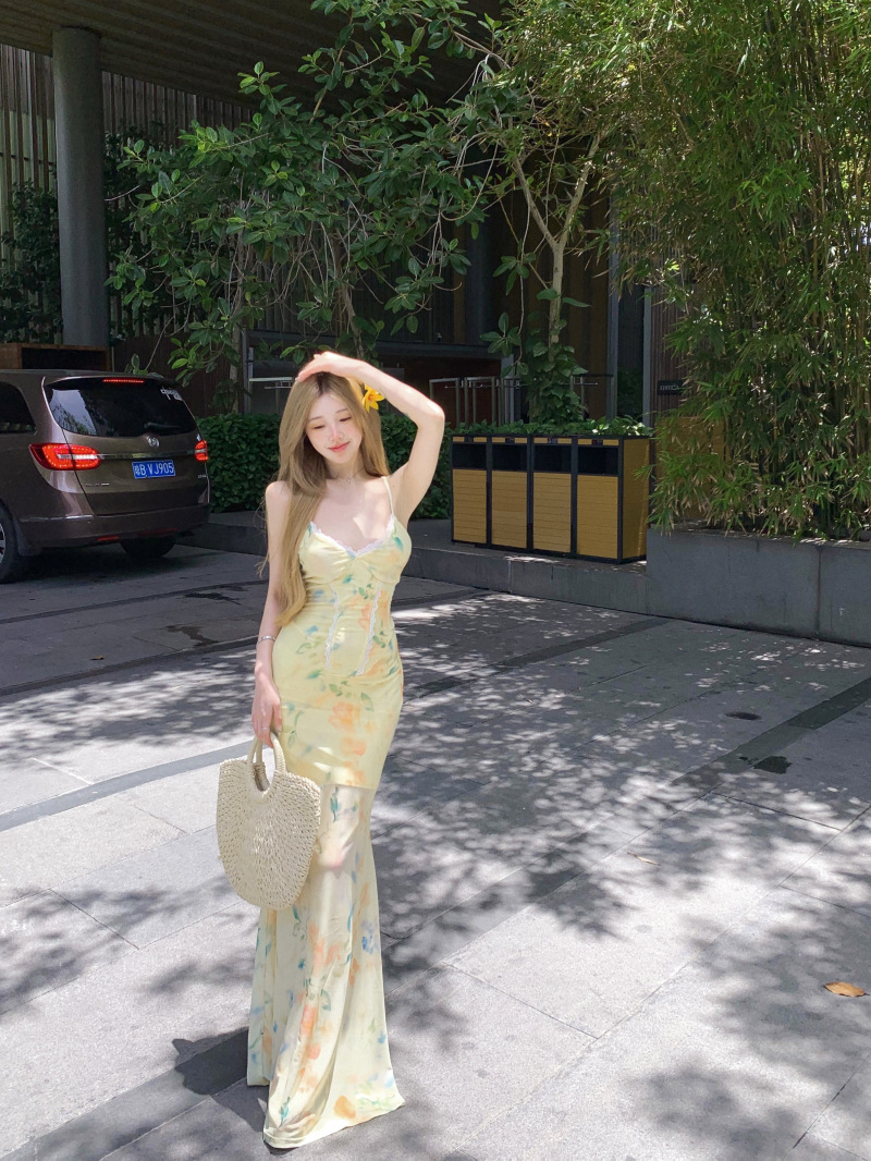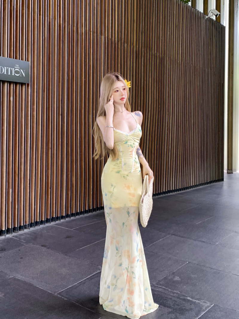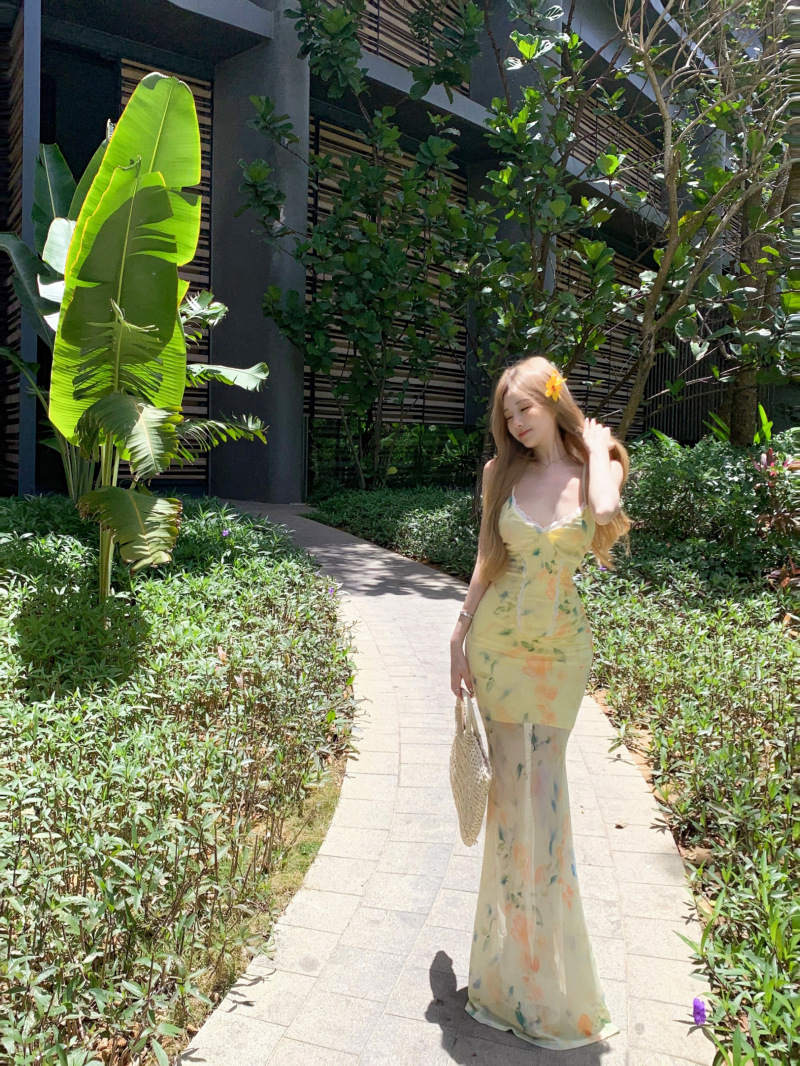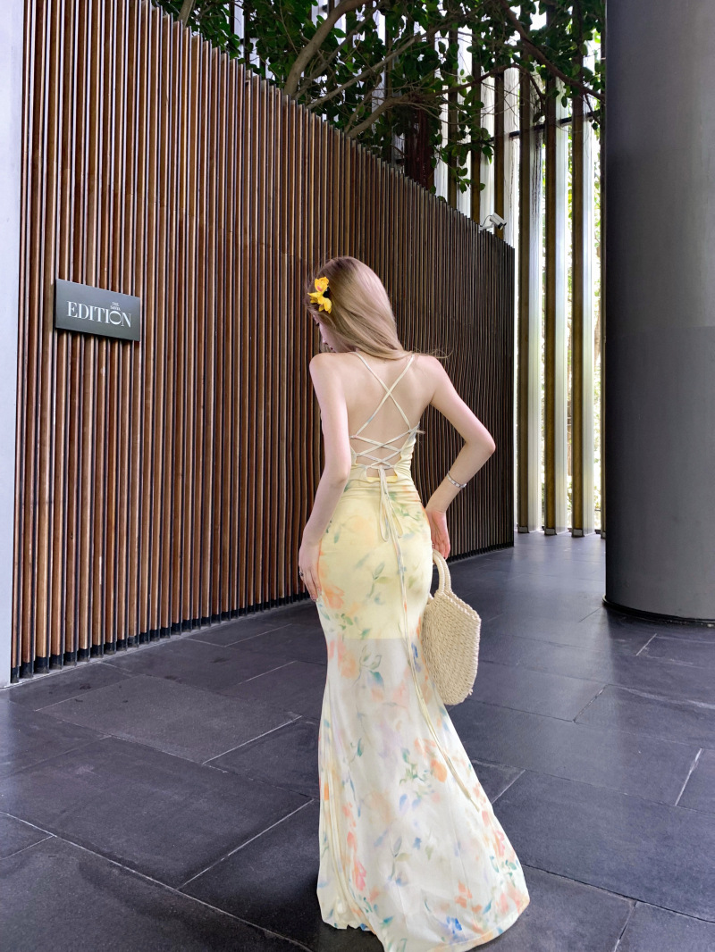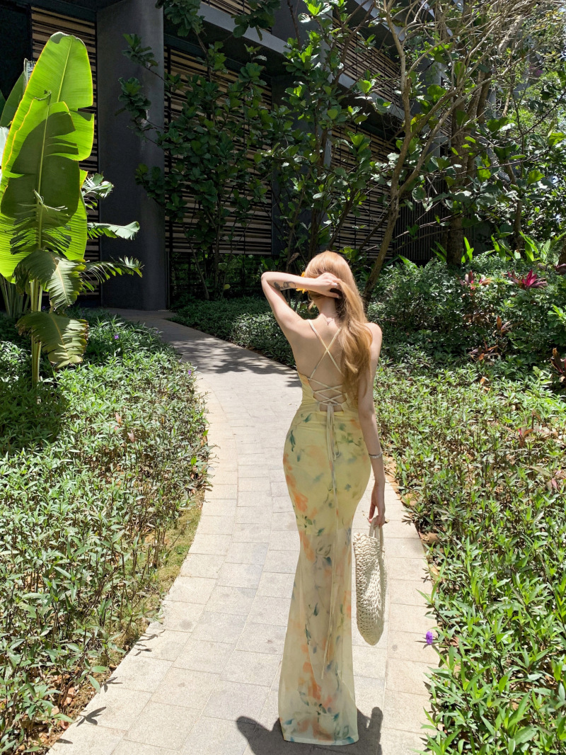여름 여성용 리조트 스타일 백리스 서스펜더 드레스, 여름 꽃무늬 스커트, 핫걸 허리 피쉬테일 스커트, 힙 커버 롱 스커트스토어 가기