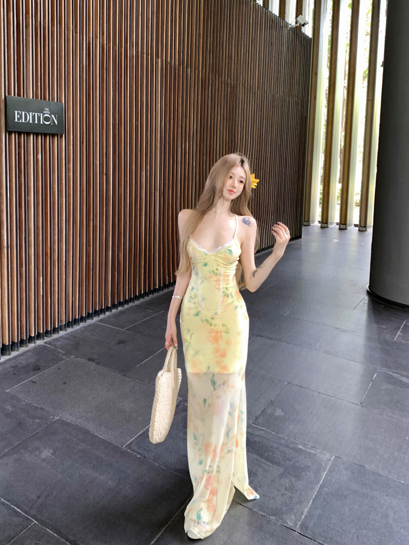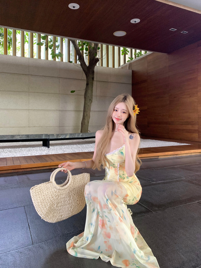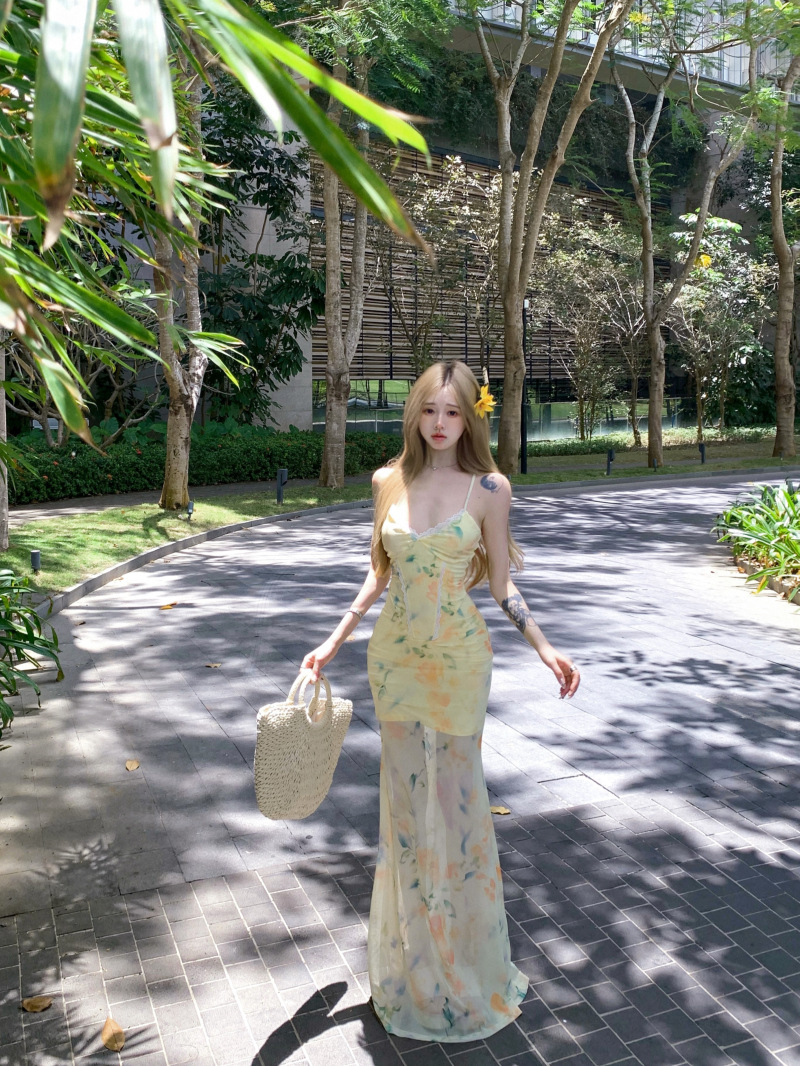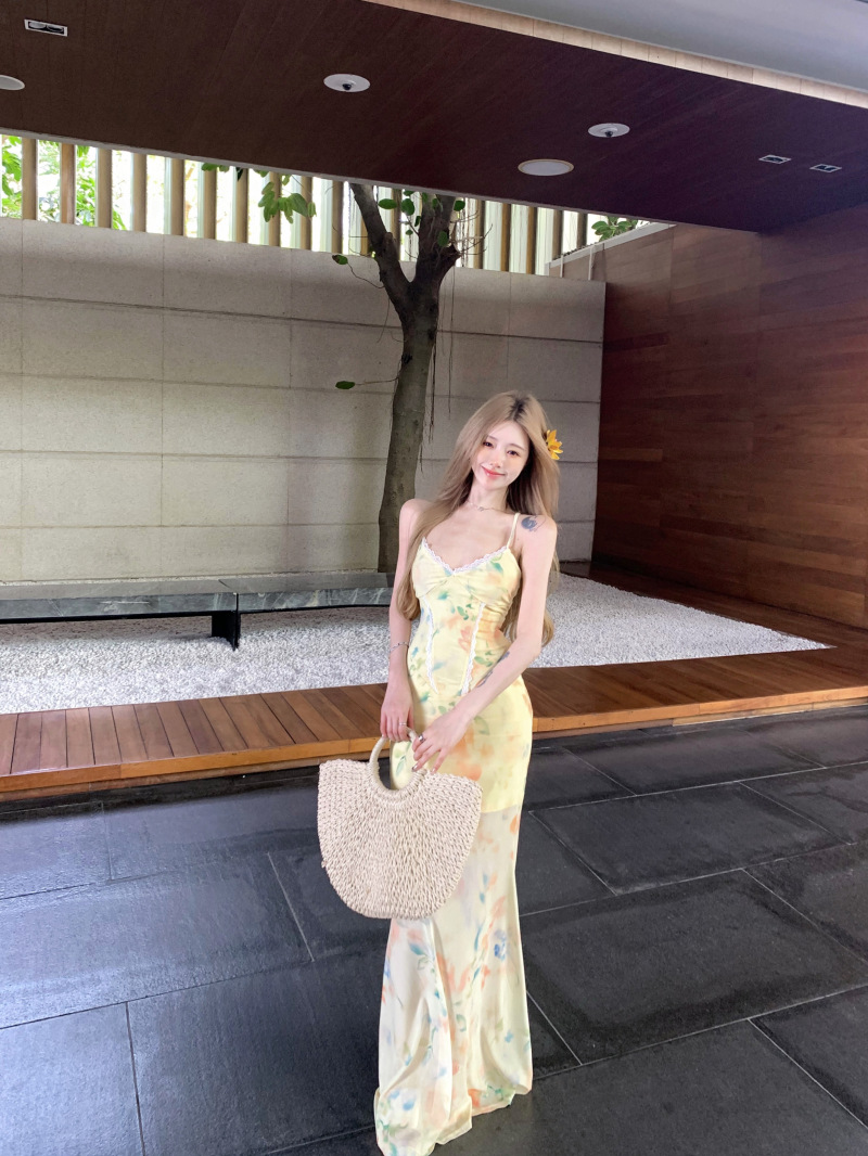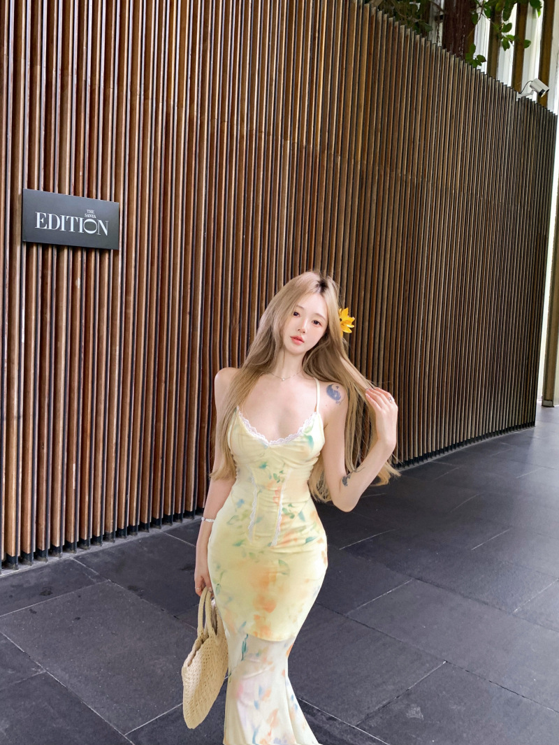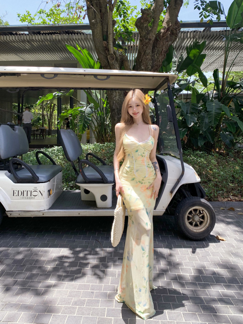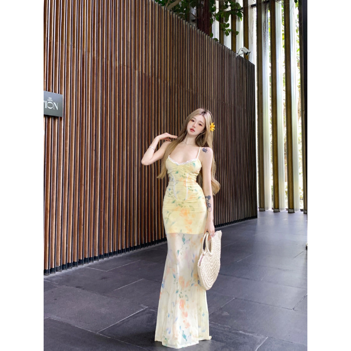 여름 여성용 리조트 스타일 백리스 서스펜더 드레스, 여름 꽃무늬 스커트, 핫걸 허리 피쉬테일 스커트, 힙 커버 롱 스커트스토어 가기