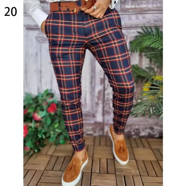 유럽과 미국의 크로스보더 가을 겨울 신작 남성 프린트 캐주얼 패션 스트라이프 미드 웨이스트 펜슬 팬츠 슬림 트렌디 바지스토어 가기