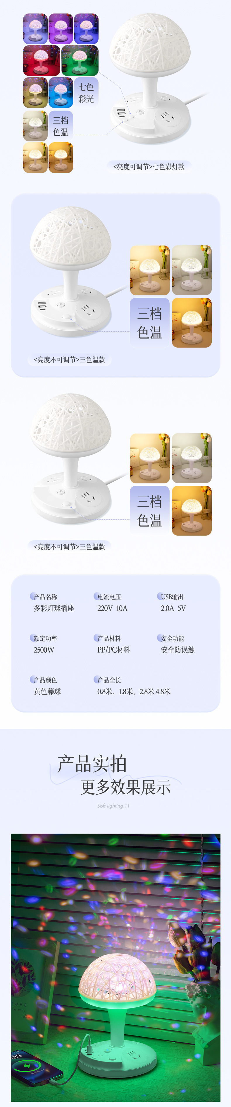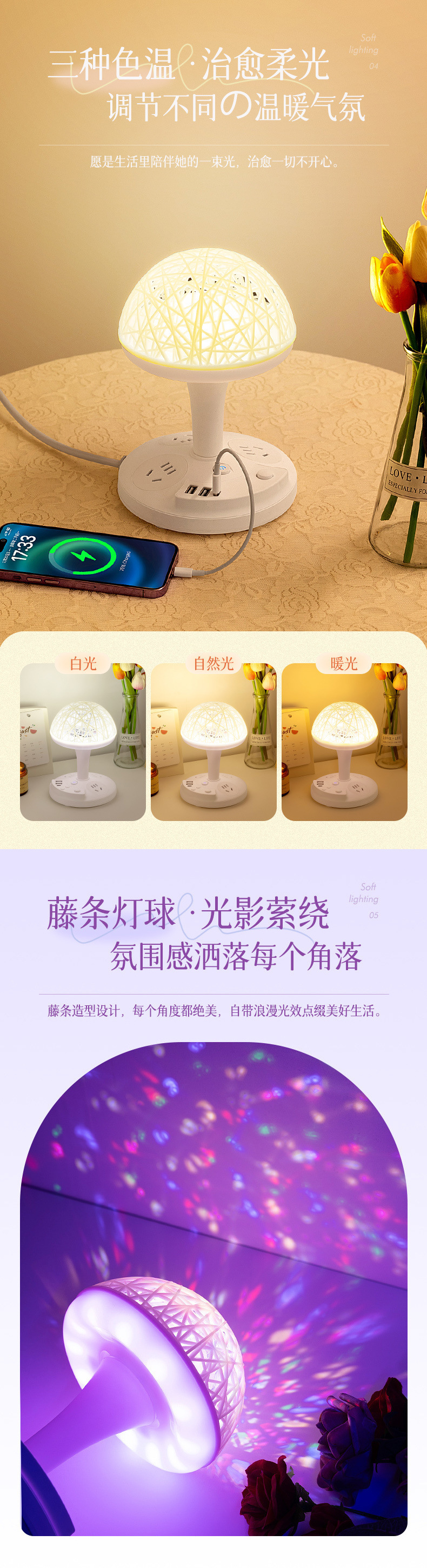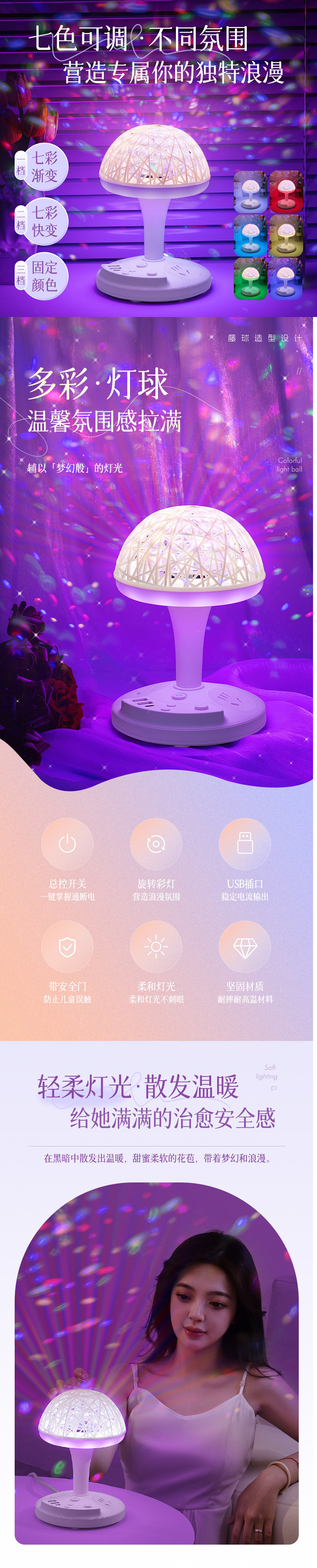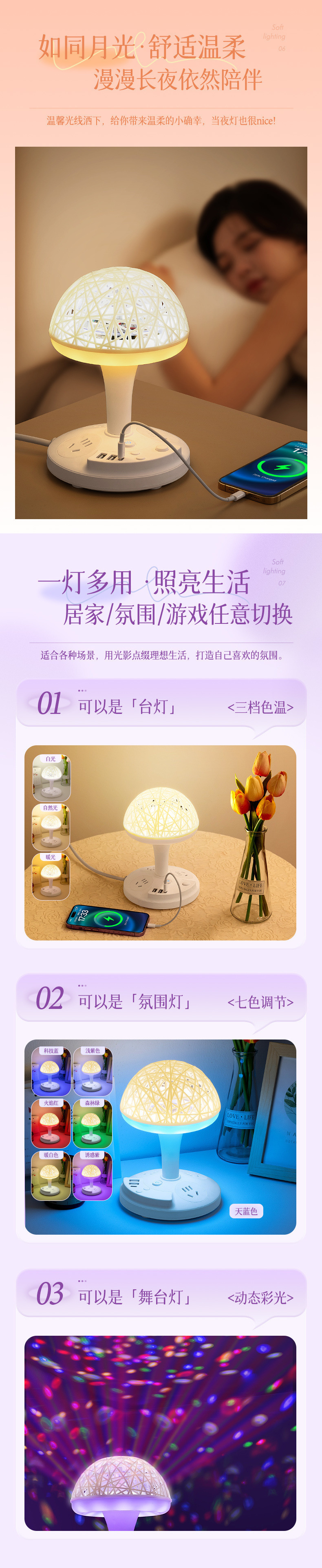• W02 [3단계 따뜻한 조명 + 다채로운 색상 변경 + USB] 밝기 조절 가능
