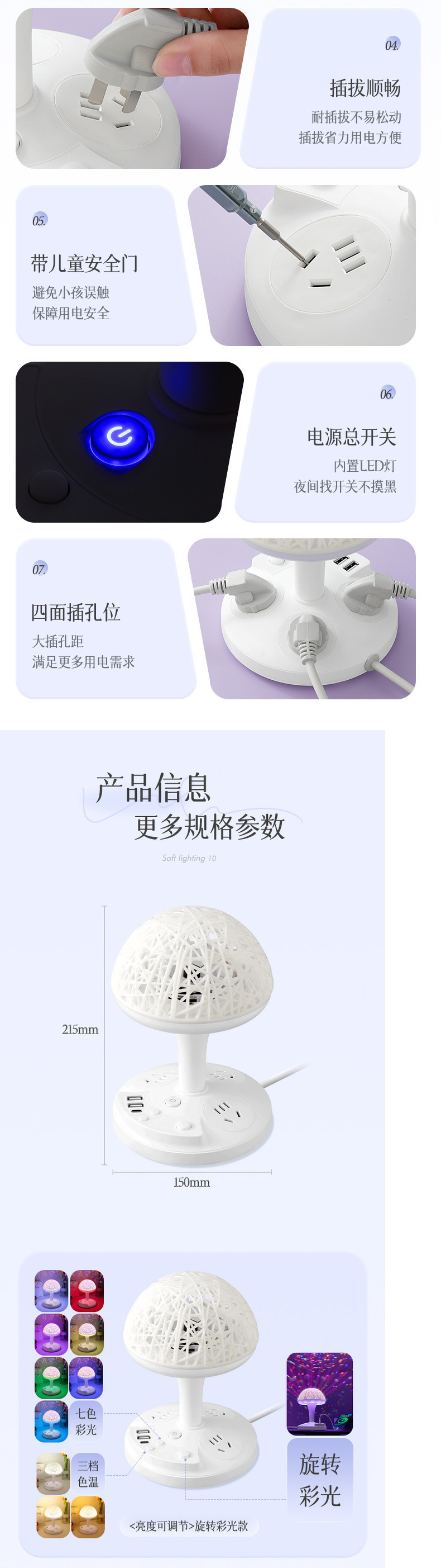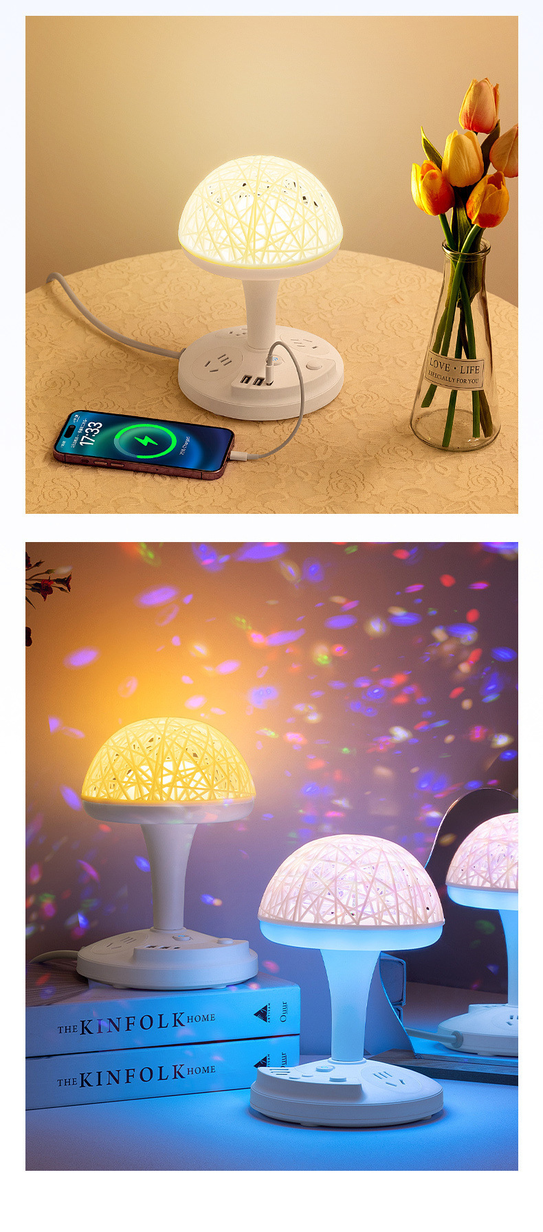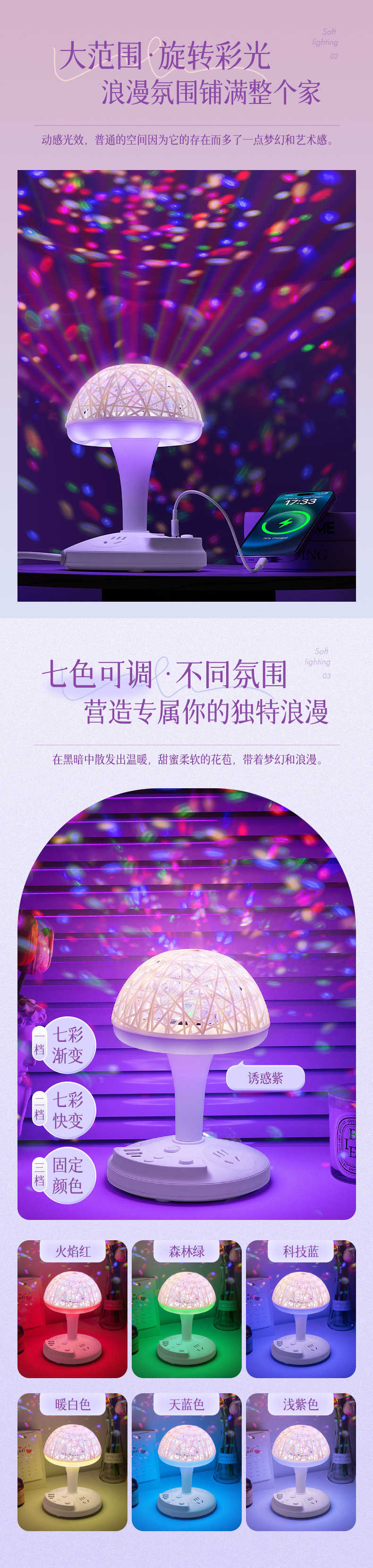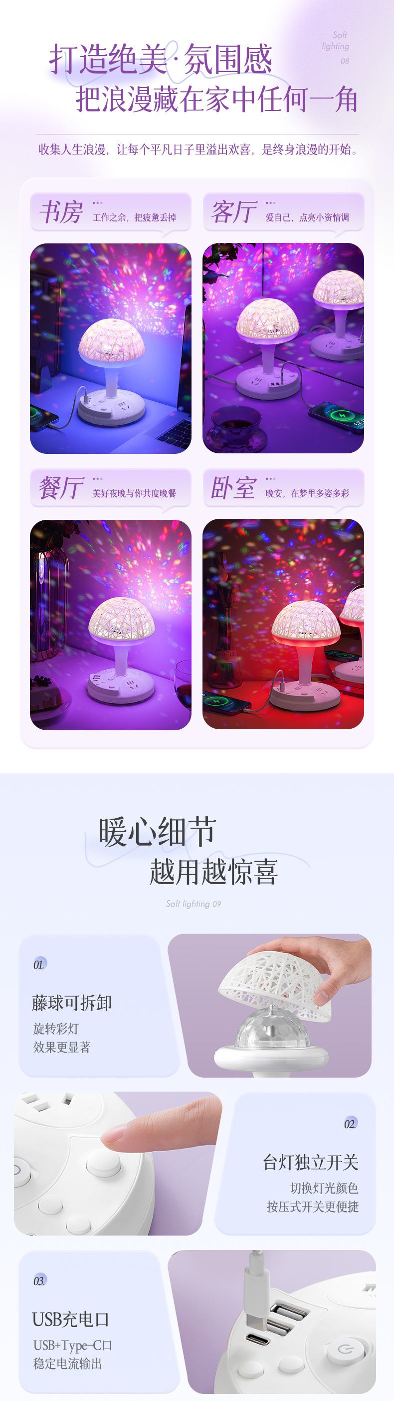 • W01 [회전 무대 조명 + 3단계 따뜻한 조명 + 다채로운 색상 변경 + USB] 밝기 조절 가능