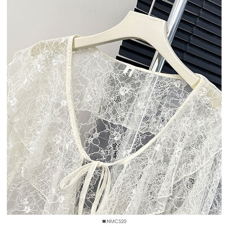 여성을위한 러플 레이스 업 짧은 레이스 카디건 여름 얇은 플레어 긴팔 쉬폰 코트 숄 탑