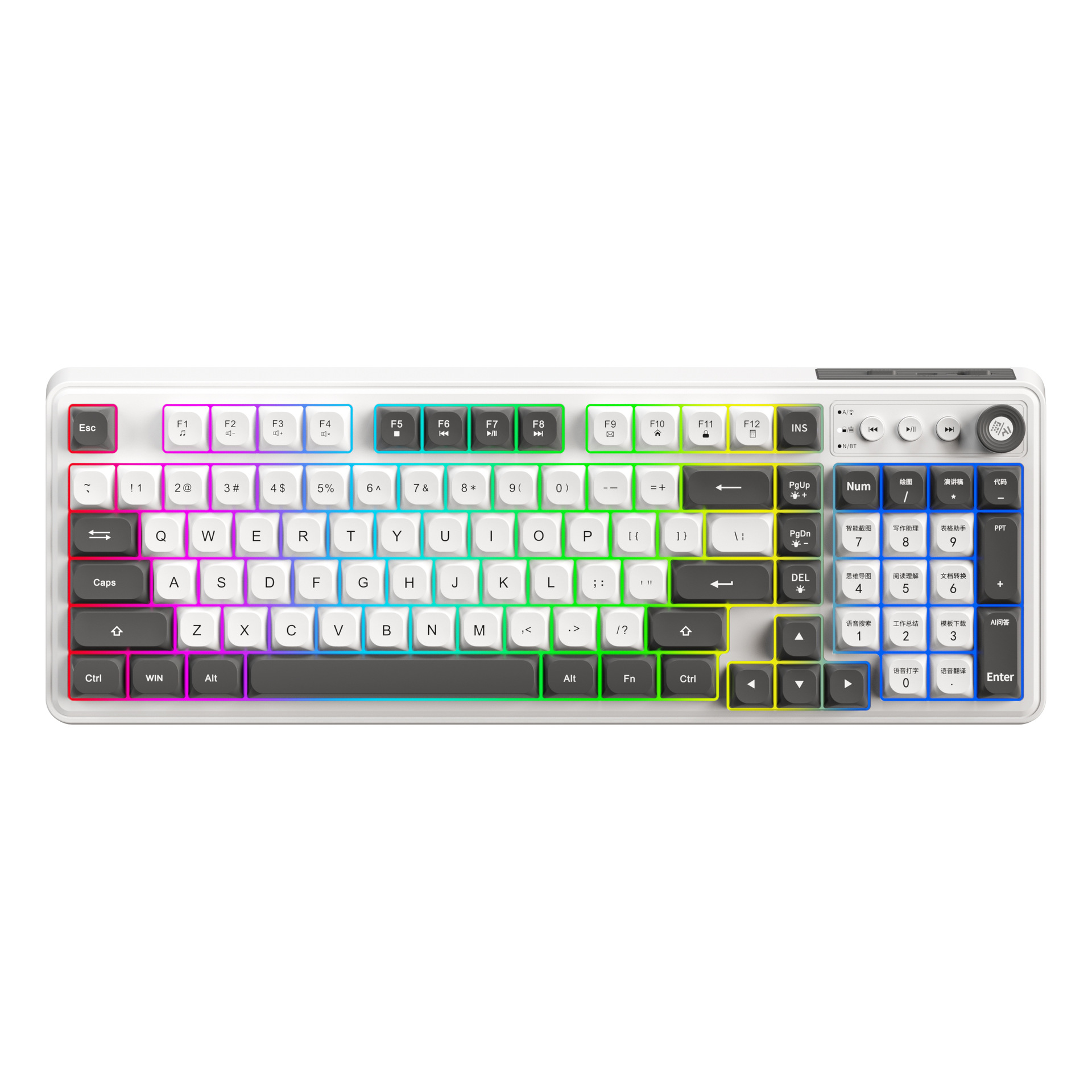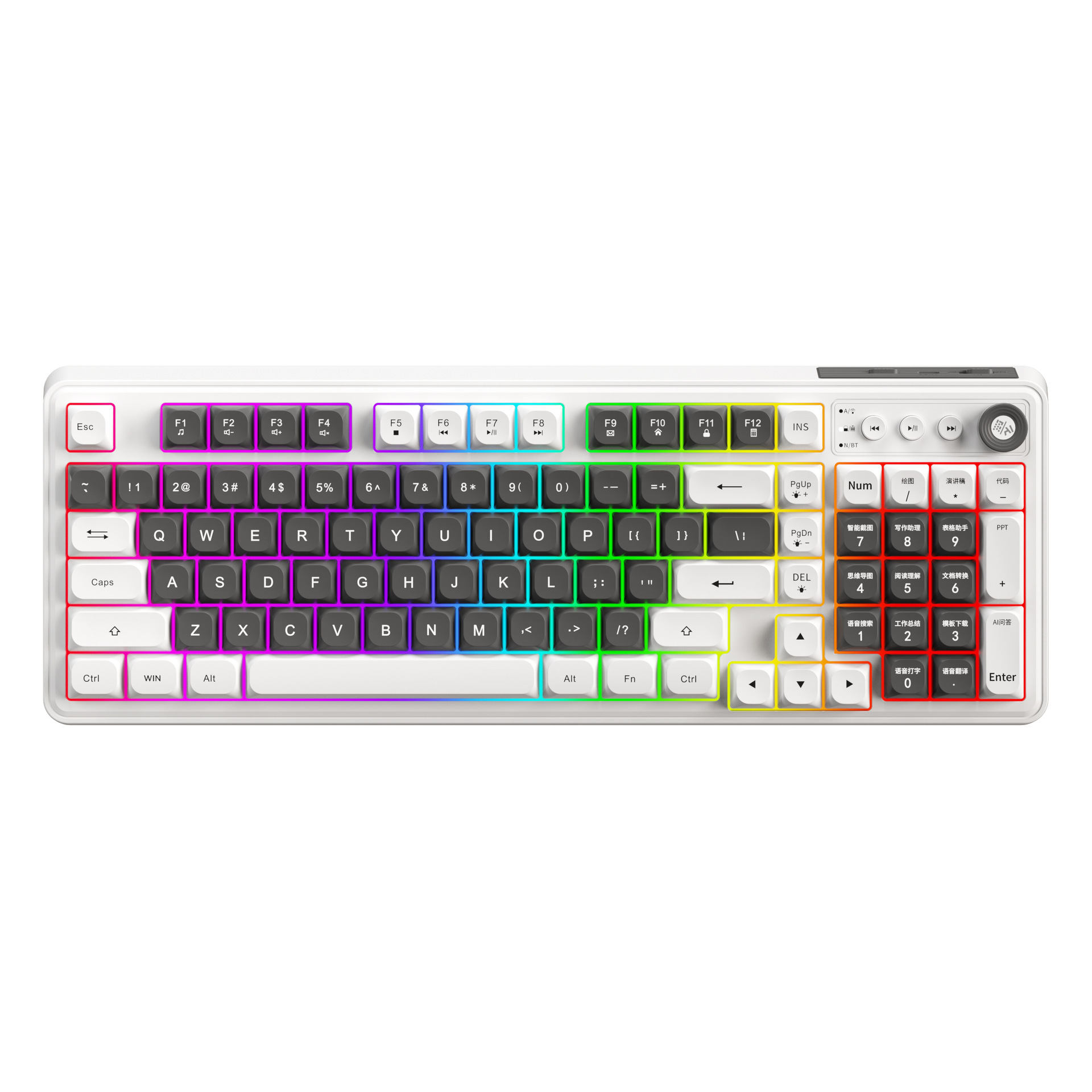 把模式切换到BT模式下,N/BT白灯快闪,长按:FN+1/2/3/4键N/BT白灯快闪对码,搜索蓝牙设备(K808-1/2/3/4),配对成功后指示灯熄灭 ,键盘正常使用;键盘1分钟对码不成功则自动关灯休眠,需要任意按键唤醒重新进入配对。 |