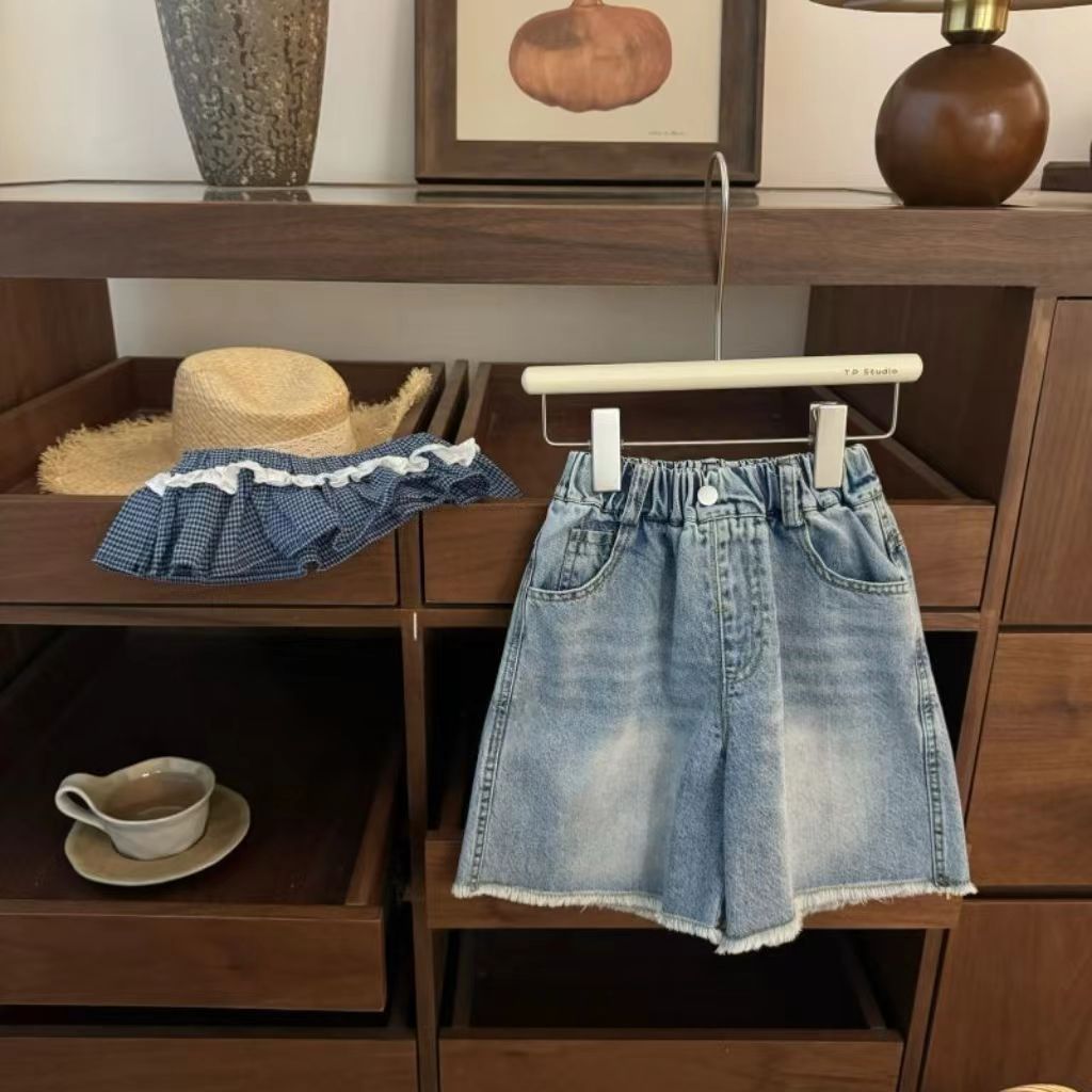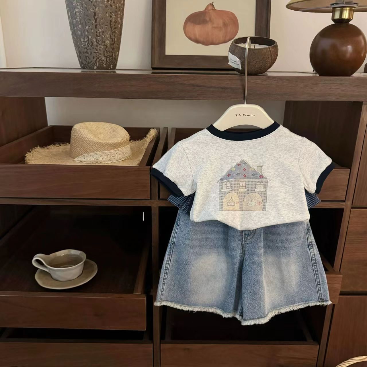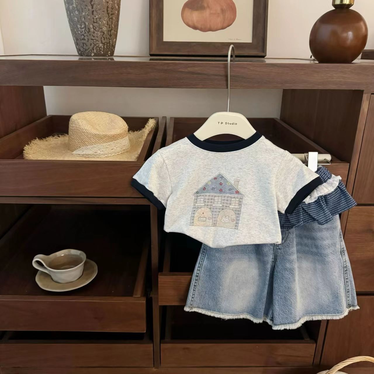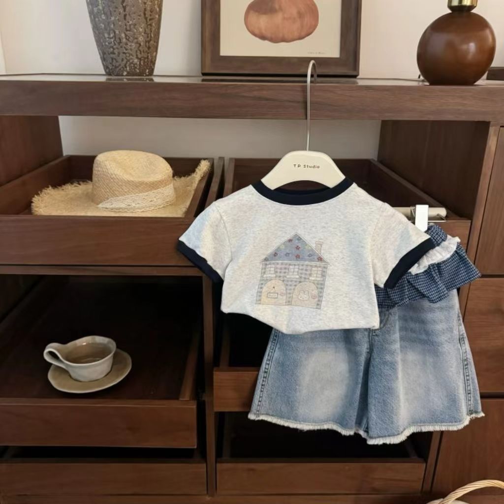 여자 정장 2025 여름 신작 어린이 한국 스타일 라운드 넥 반팔 티셔츠 얇은 데님 와이드 레그 팬츠 투피스 세트스토어 가기