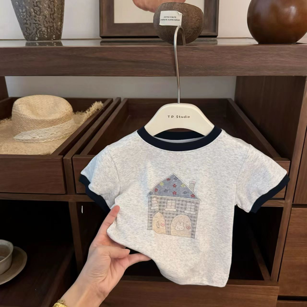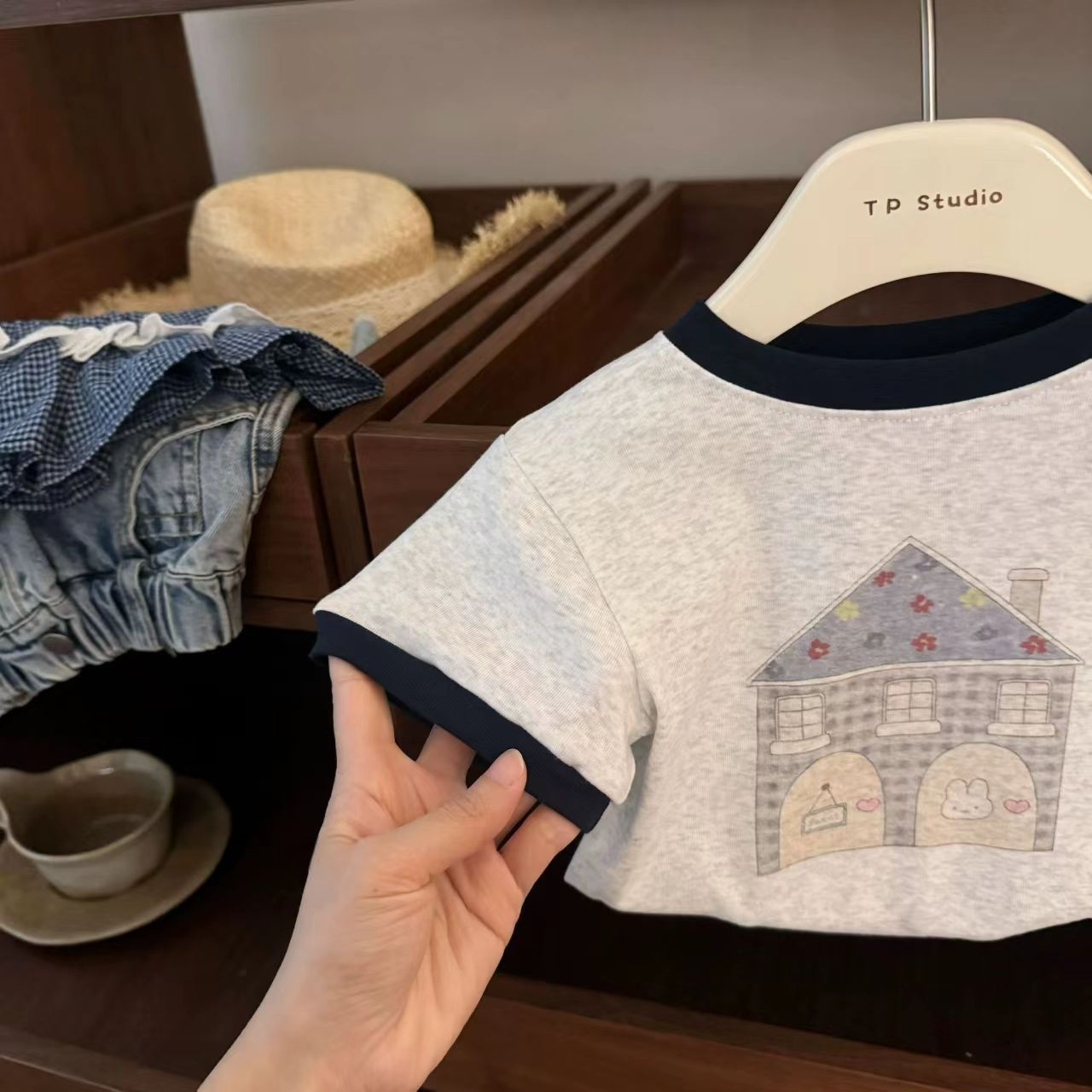 여자 정장 2025 여름 신작 어린이 한국 스타일 라운드 넥 반팔 티셔츠 얇은 데님 와이드 레그 팬츠 투피스 세트