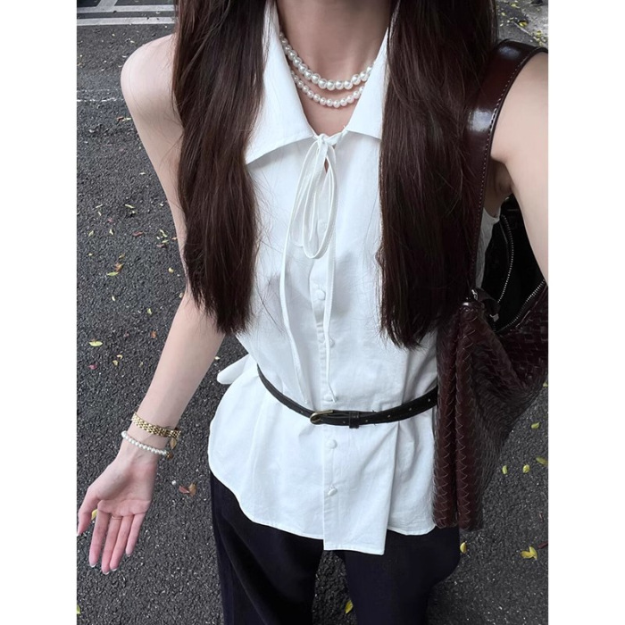 여름 여성용 브이넥 화이트 민소매 홀터넥 셔츠 루즈한 디자인 틈새 시크 프렌치 슬림핏 조끼 탑