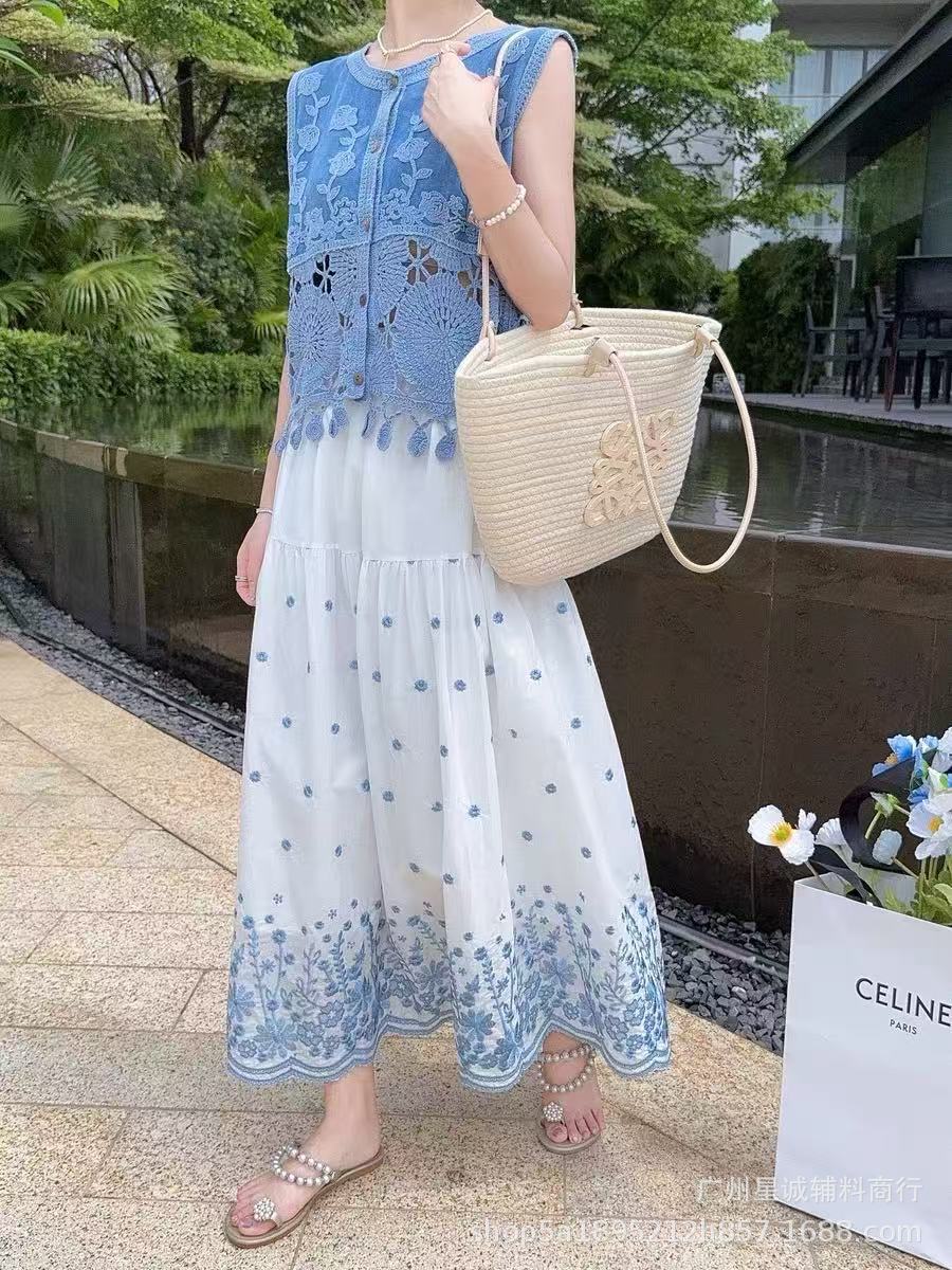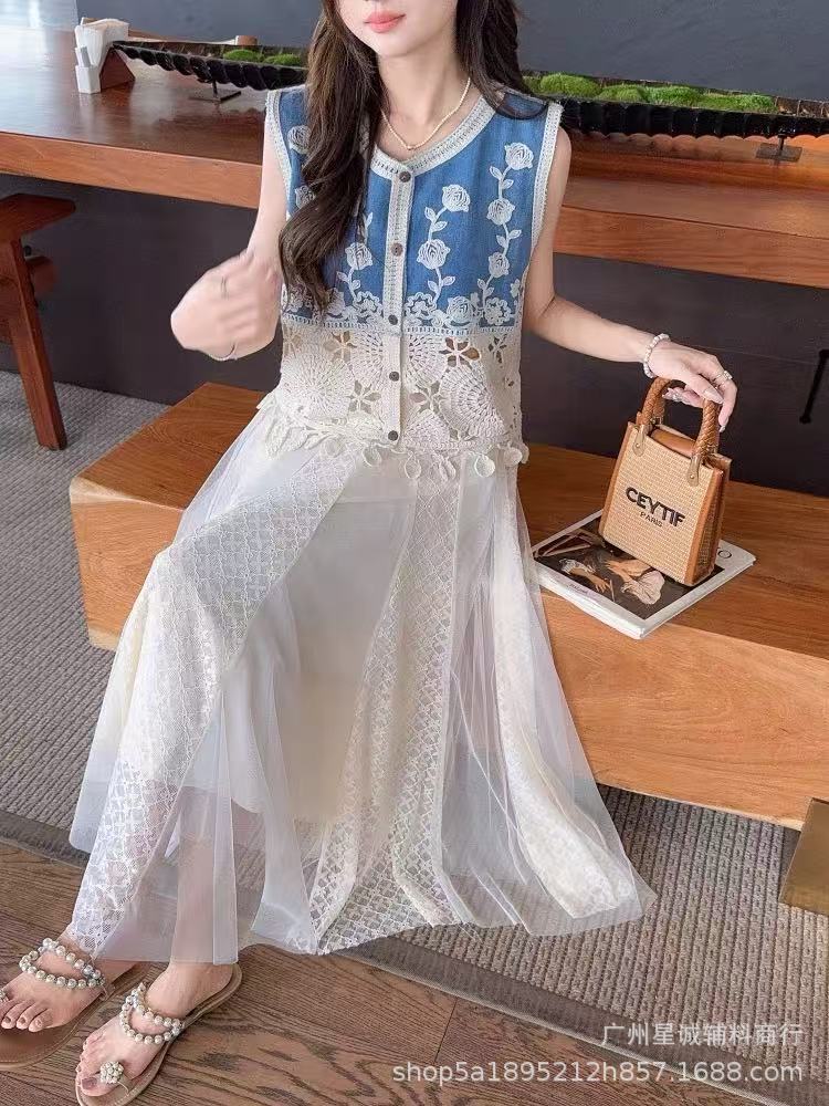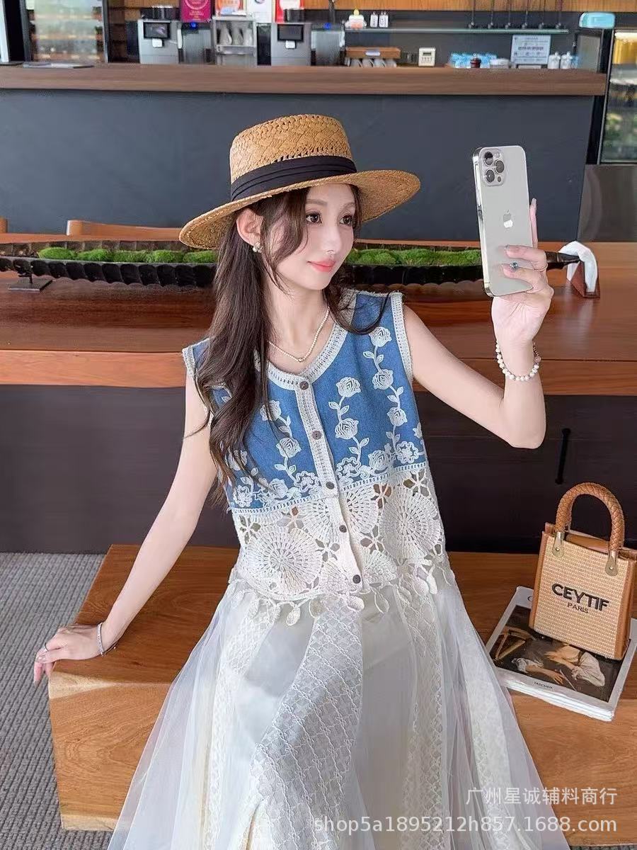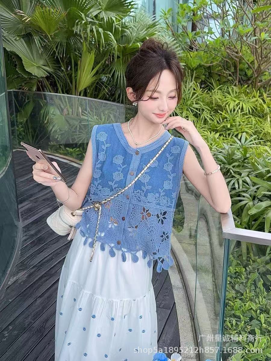 새로운 스타일의 헤비듀티 크로셰 자수 데님 조끼, 슬림하고 시크하며 매우 멋진 여성용 민소매 조끼스토어 가기