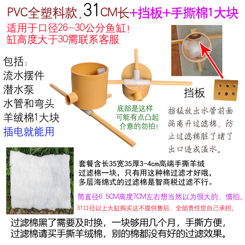 • PVC 일체형 모델, 길이 31cm, 펌프 및 튜브 포함 + 오버플로 방지 배플 + 손으로 찢은 면 1개