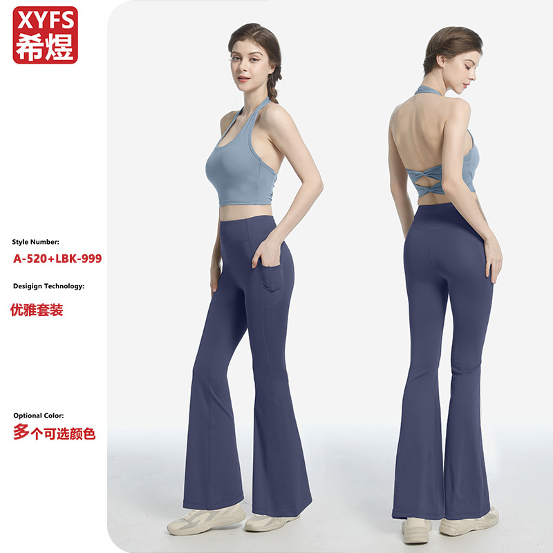 여성을위한 요가 의류 세트 새로운 전문 훈련 필라테스 피트니스 마이크로 플레어 바지 스포츠 러닝 타이트 홀터 브라스토어 가기