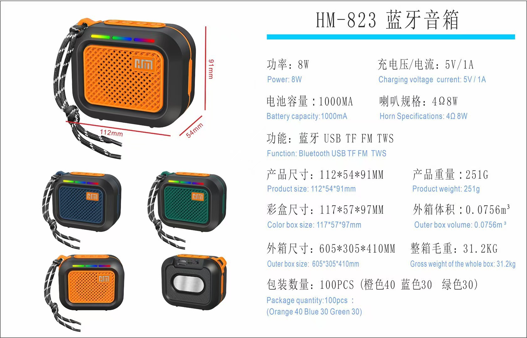 새로운 HM-823 무선 블루투스 오디오 야외 8W 서브 우퍼 휴대용 TWS 데스크탑 카드 LED 라이트 소형 스피커