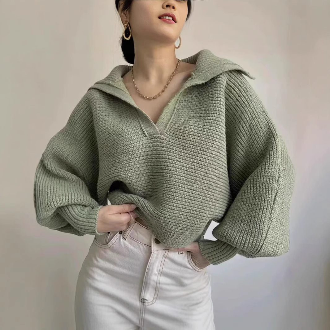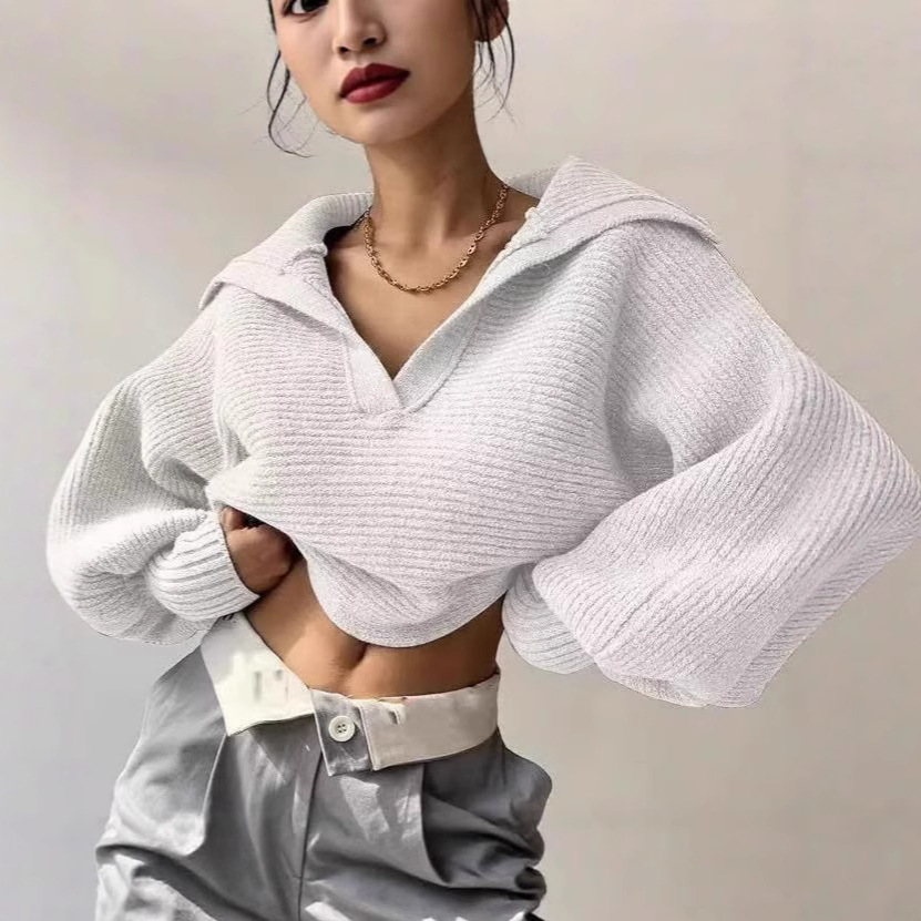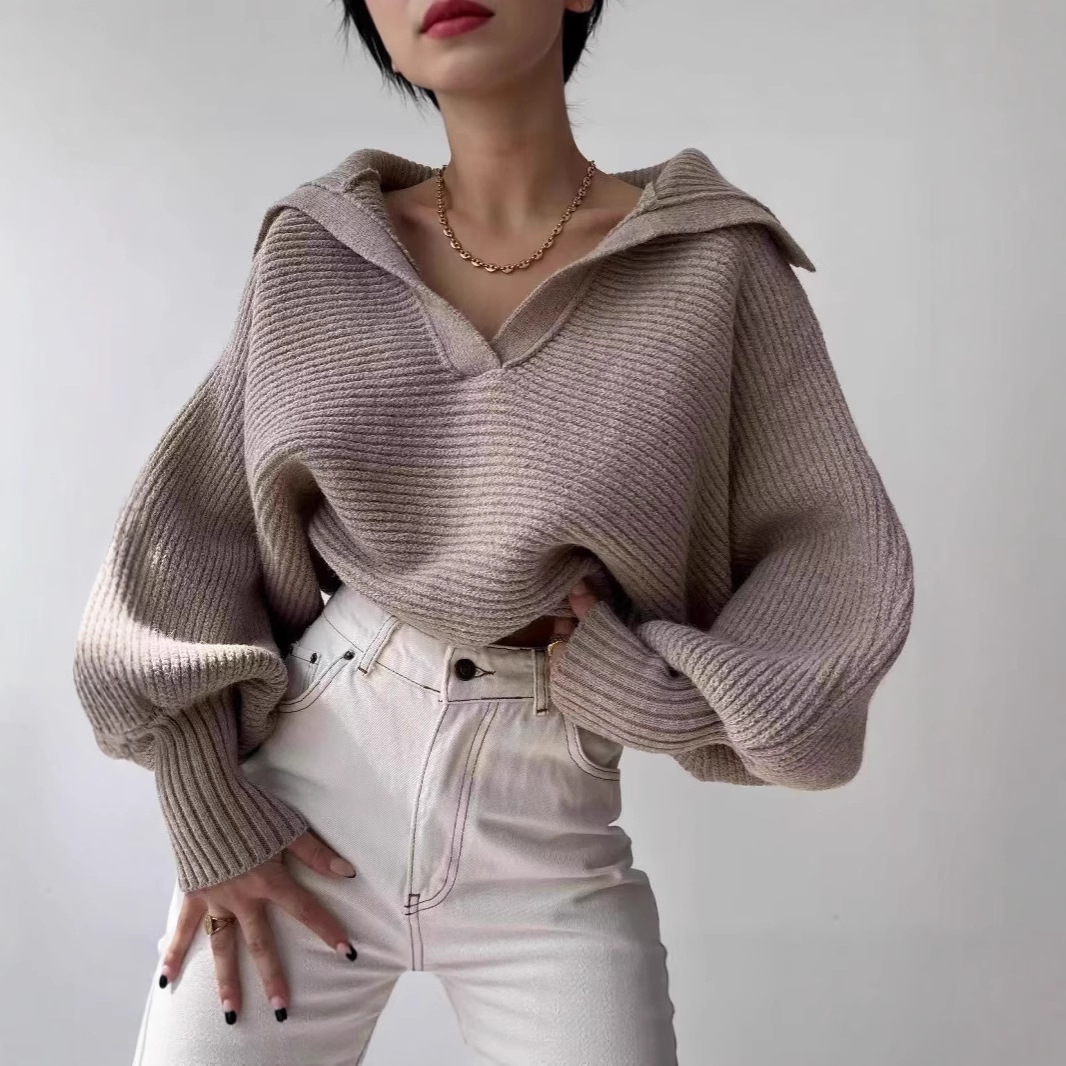 국경을 넘는 새로운 여성용 스웨터 유럽과 미국의 와플 복고풍 게으른 스타일 캐주얼 루즈 랜턴 슬리브 오픈 칼라 풀오버스토어 가기