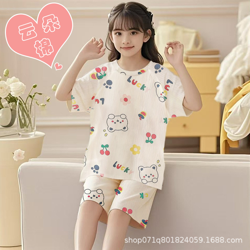 [Yunduo Cotton] 반팔 여아 잠옷 세트 여아 반바지 아기 얇은 아동 중대형 아동복 여성