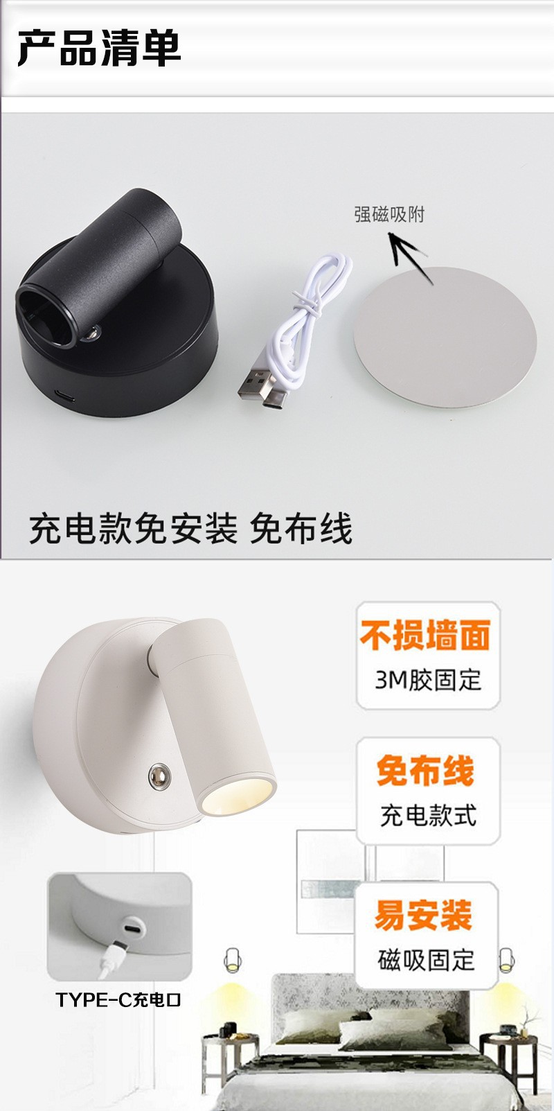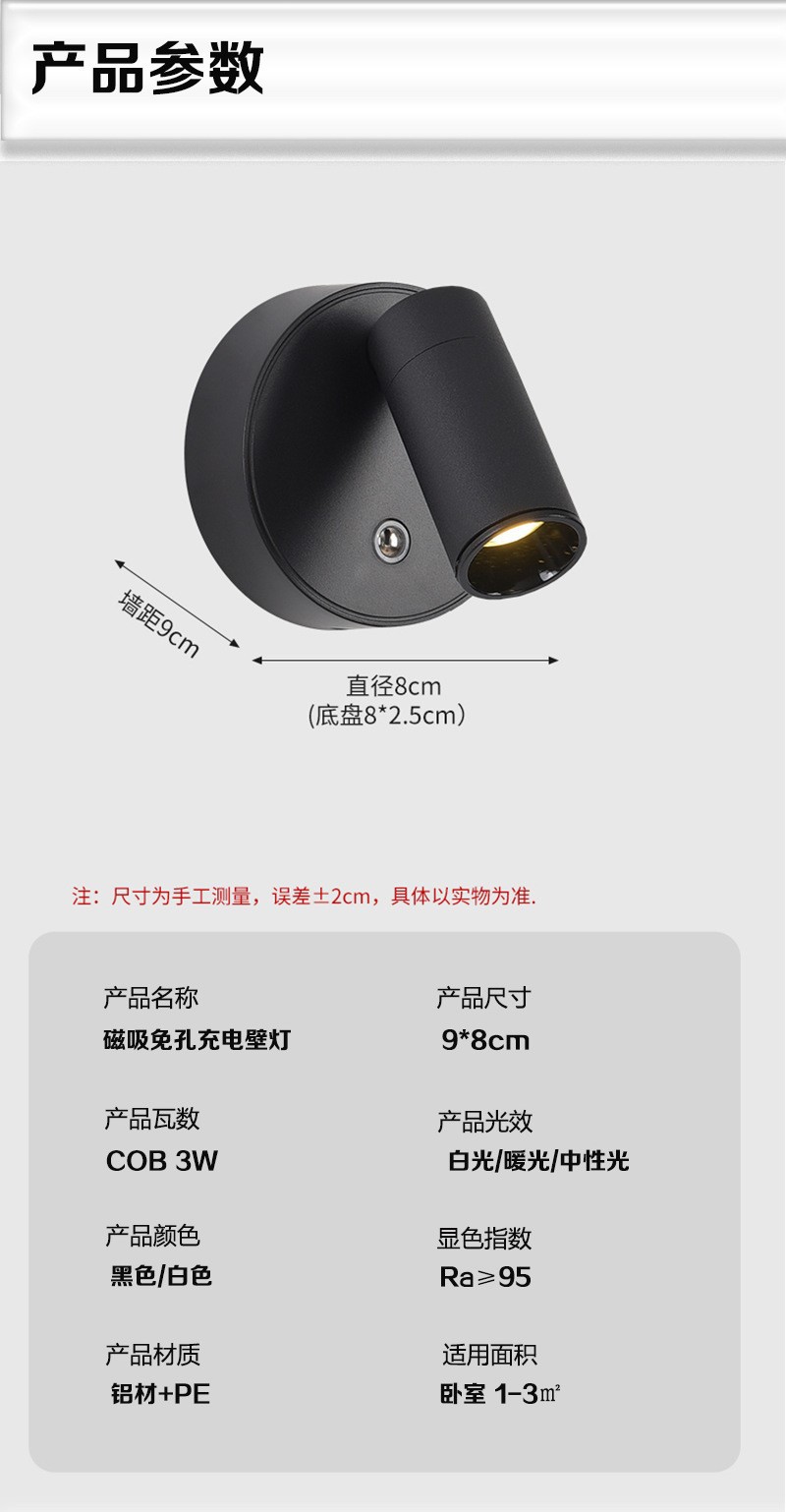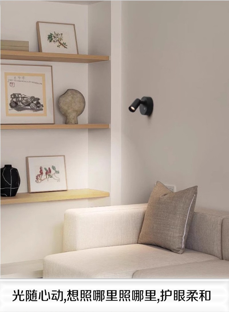 Led 벽 램프 자기 흡입 COB 스포트라이트 배선이 필요없는 충전식 벽 램프 usb 통 연구 침실 전면 장식 벽 램프