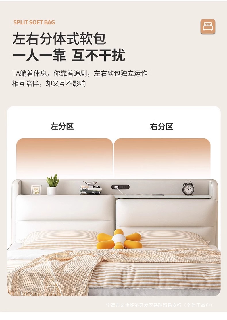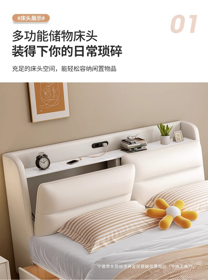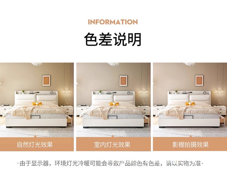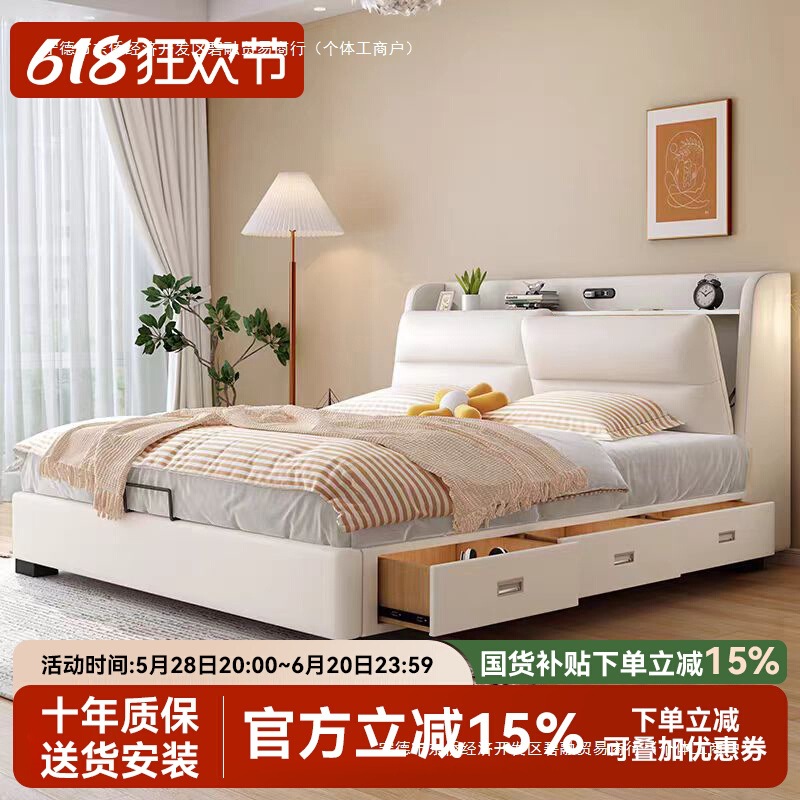 크림 스타일 가죽 침대 현대 미니멀리스트 침실 다기능 스토리지 침대 마스터 침실 1.8m 더블 소프트 팩 단단한 나무 웨딩 침대스토어 가기