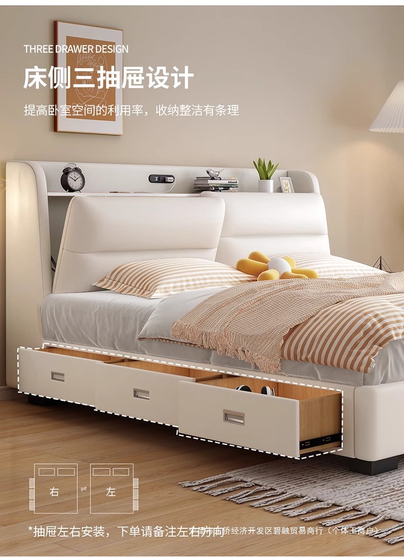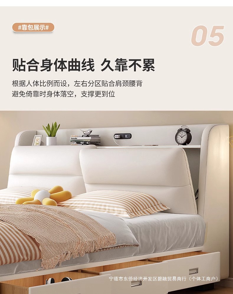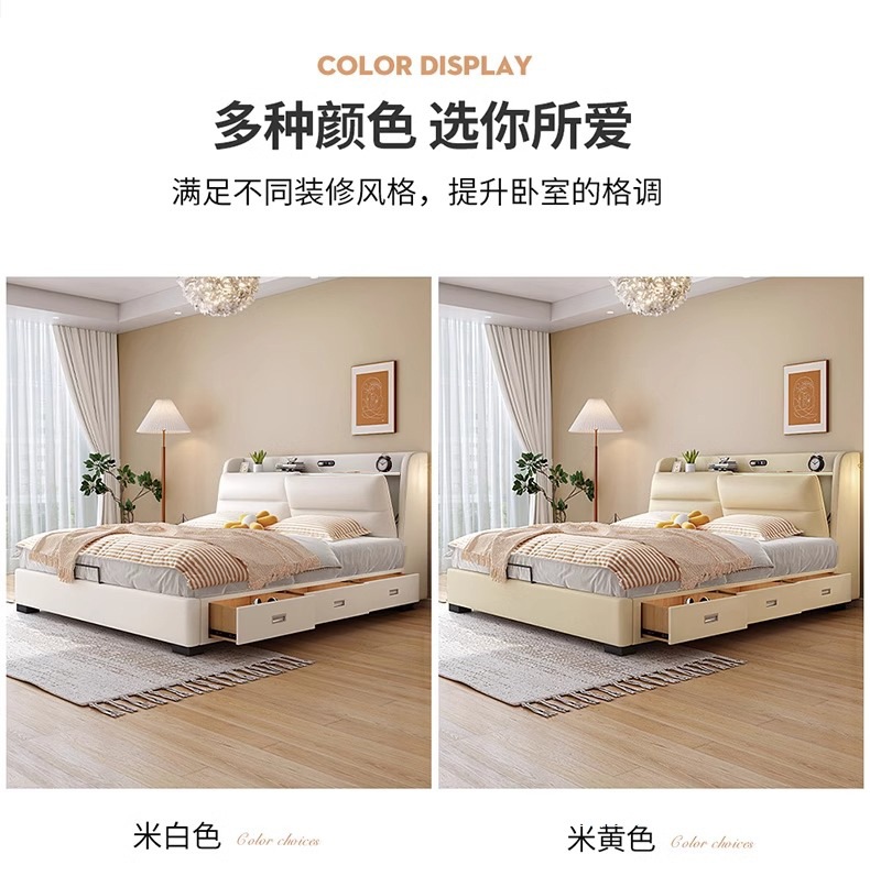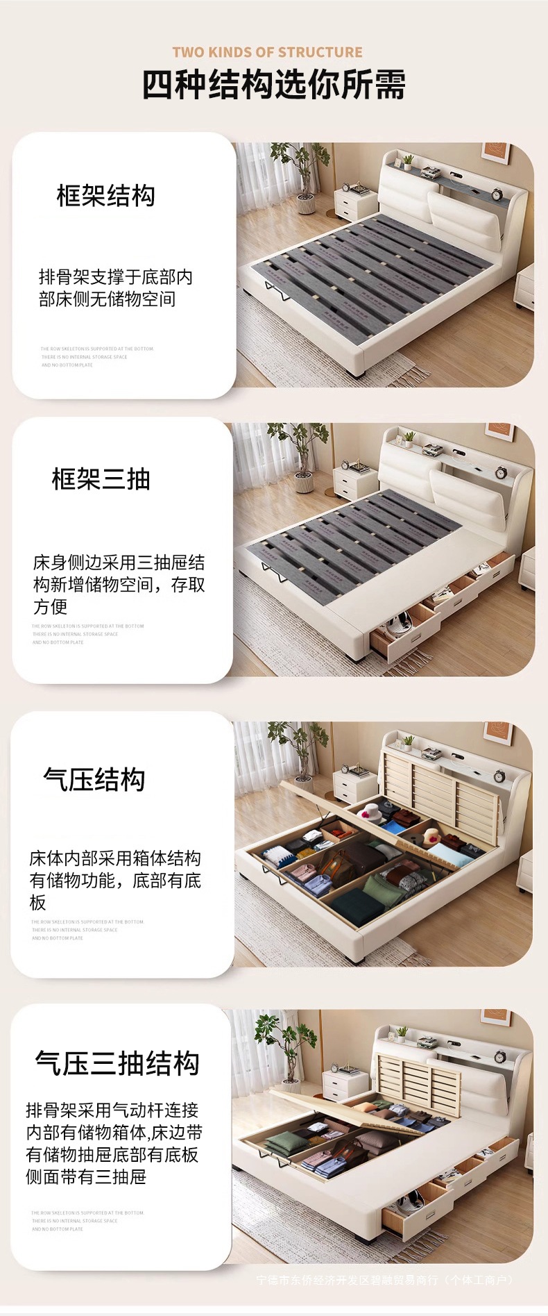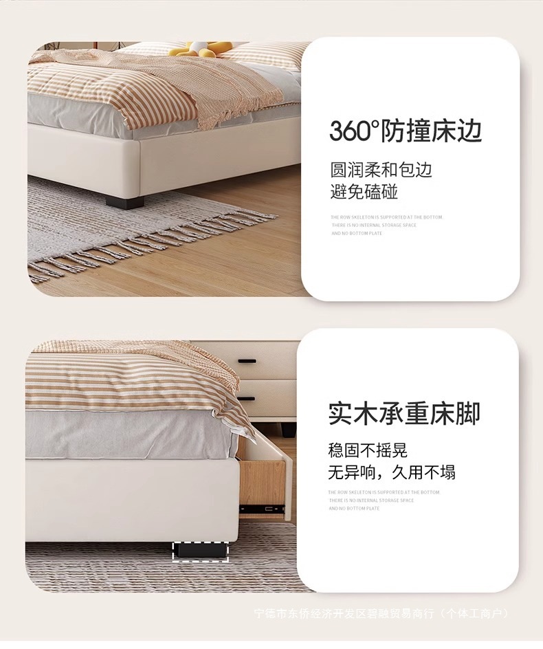 크림 스타일 가죽 침대 현대 미니멀리스트 침실 다기능 스토리지 침대 마스터 침실 1.8m 더블 소프트 팩 단단한 나무 웨딩 침대
