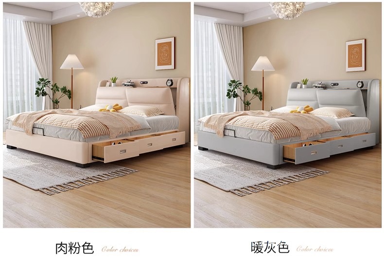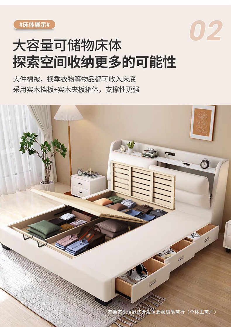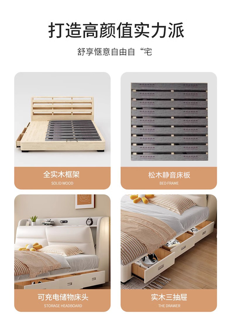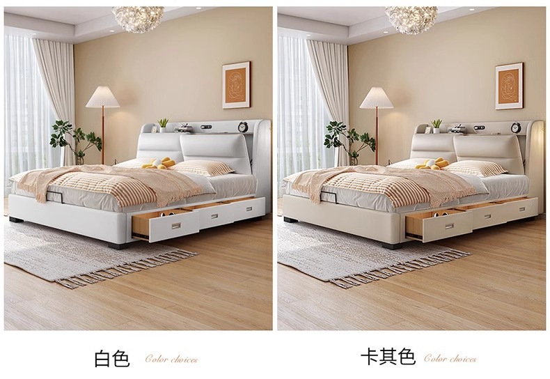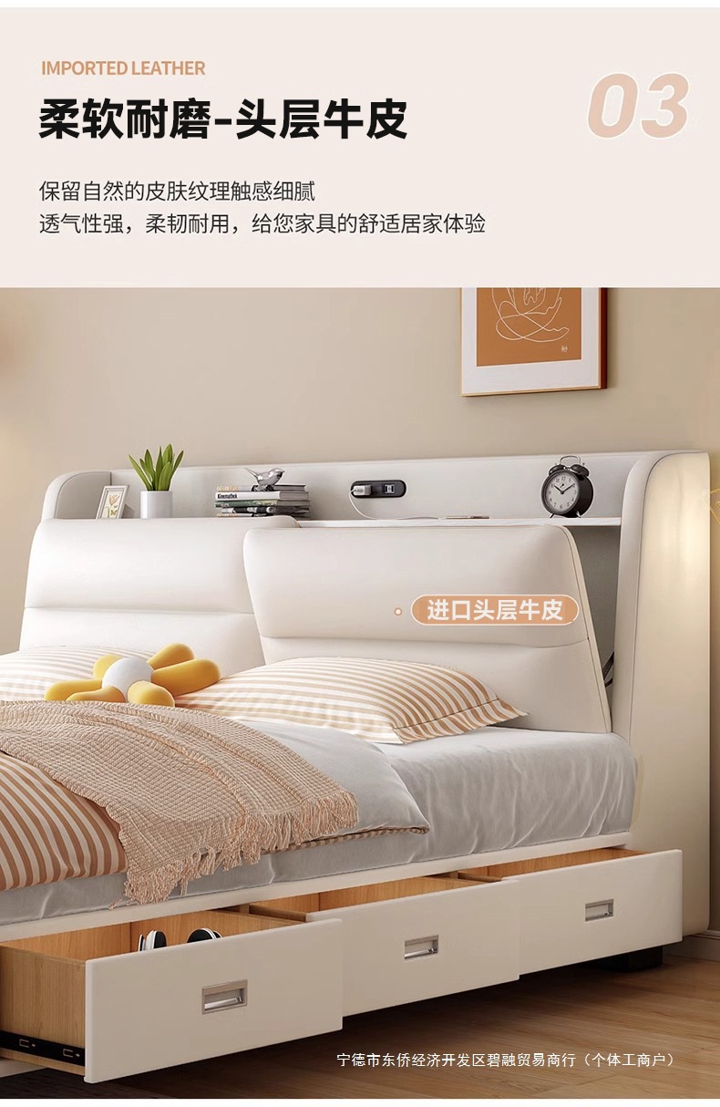 크림 스타일 가죽 침대 현대 미니멀리스트 침실 다기능 스토리지 침대 마스터 침실 1.8m 더블 소프트 팩 단단한 나무 웨딩 침대