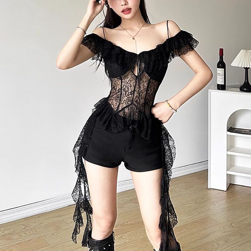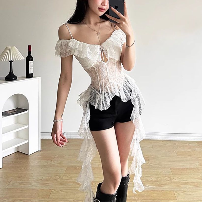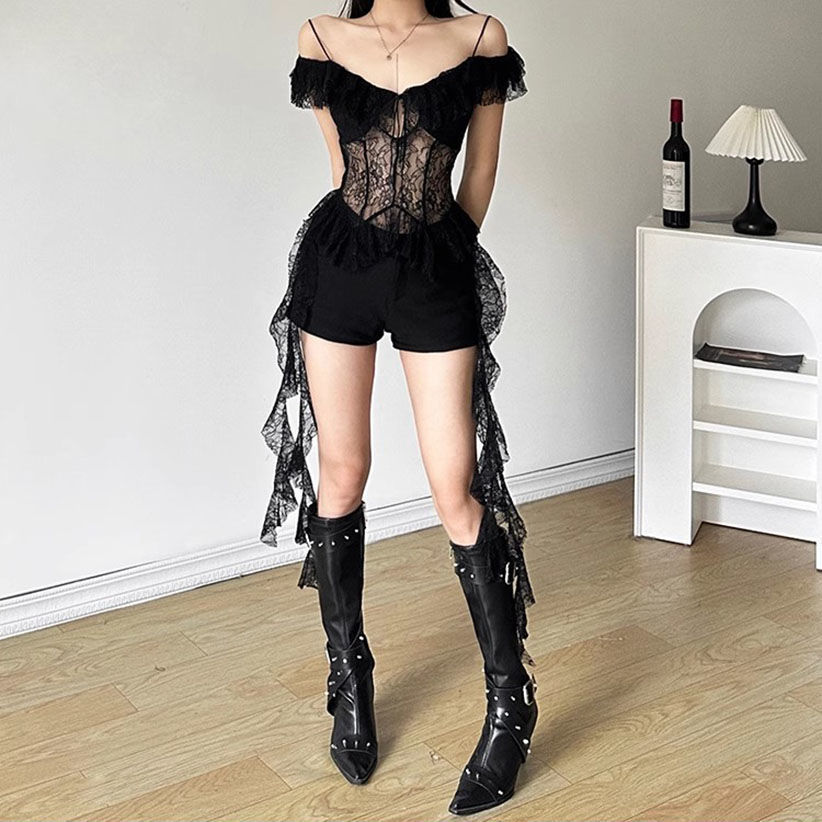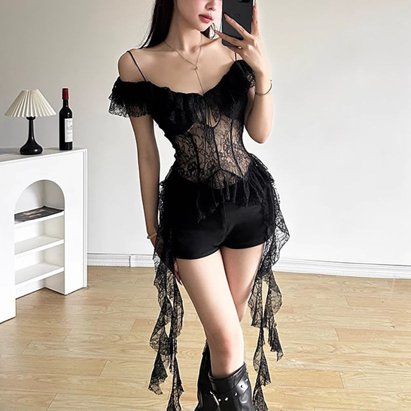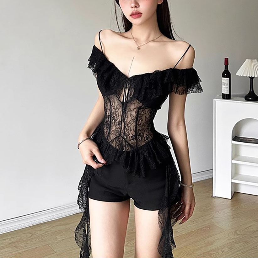 2025 새로운 여름 스타일 핫 소녀 스타일 순수한 욕망 레이스 스플 라이스 시스루 섹시한 캐미솔 버섯 레이스 짧은 탑스토어 가기