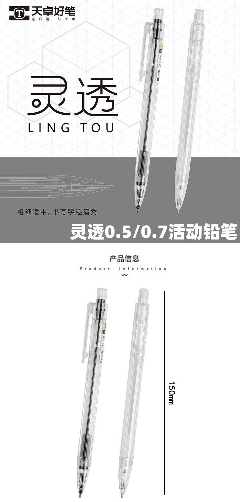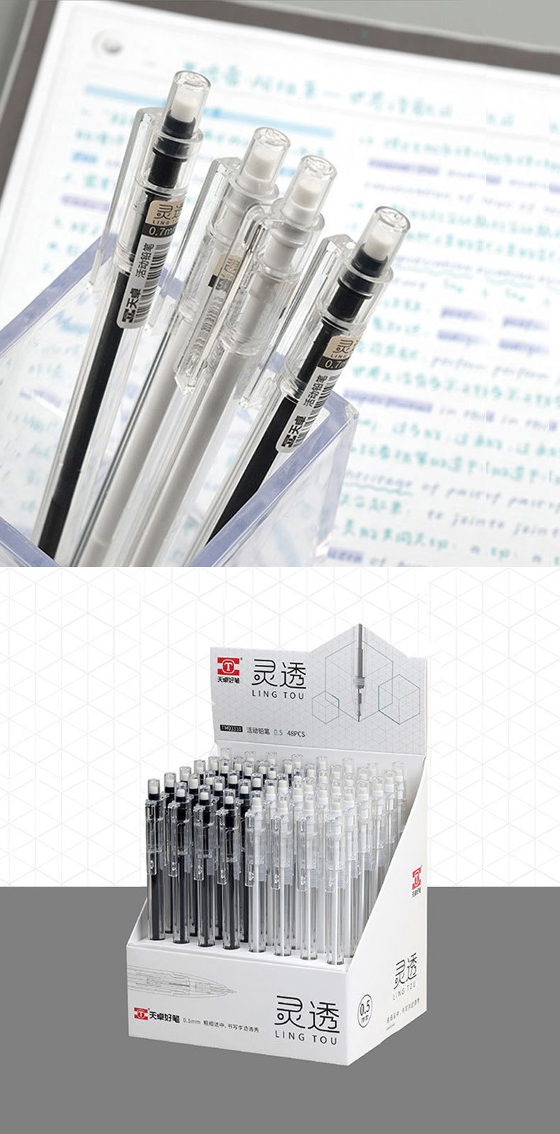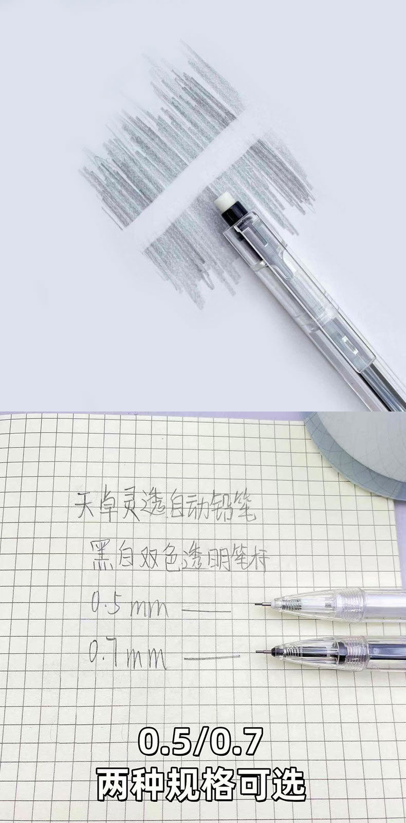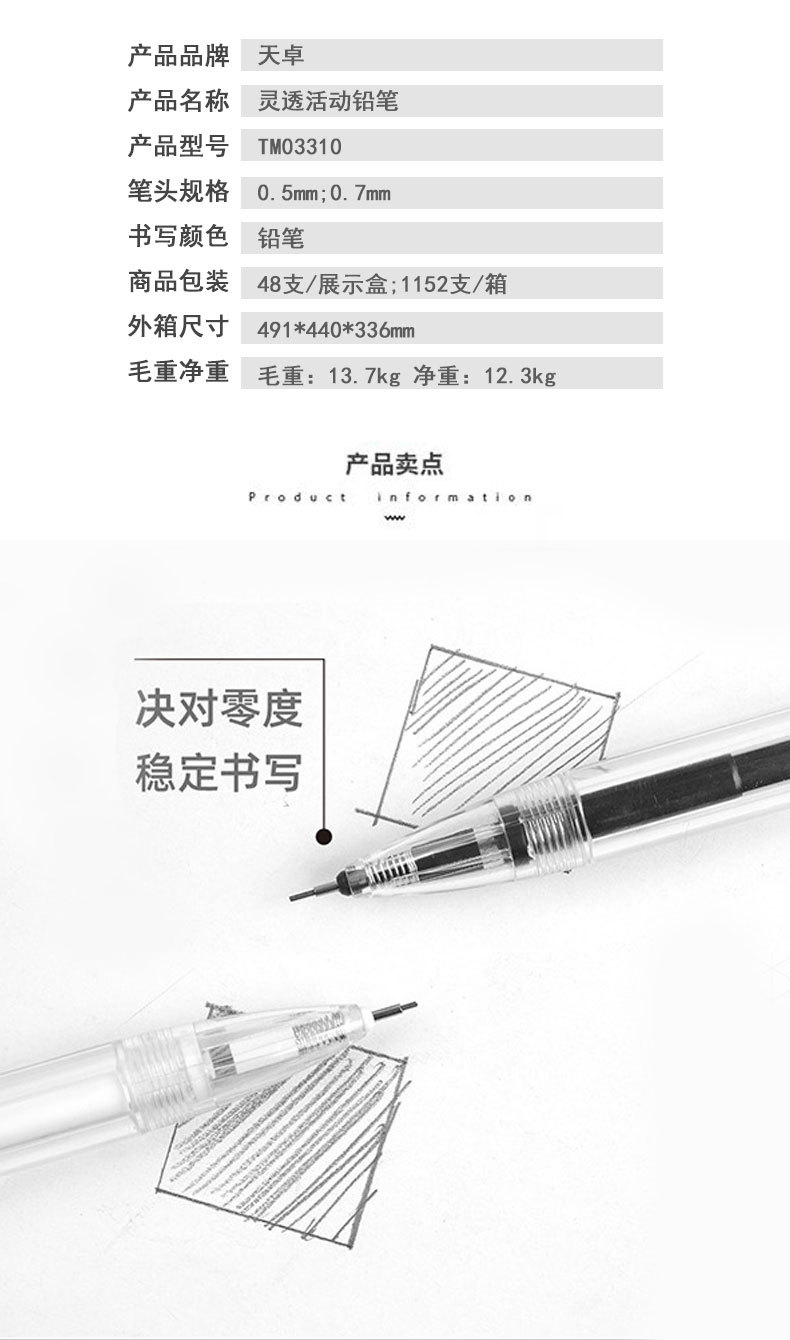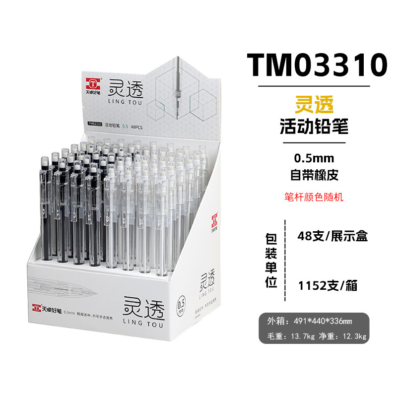 Tianzhuo 03310 자동 연필 간단하고 투명한 막대 프레스 연필 0.5/0.7mm 학생 샤프 펜슬스토어 가기