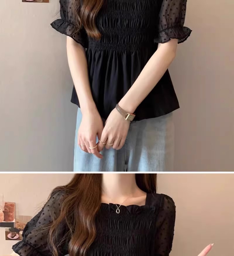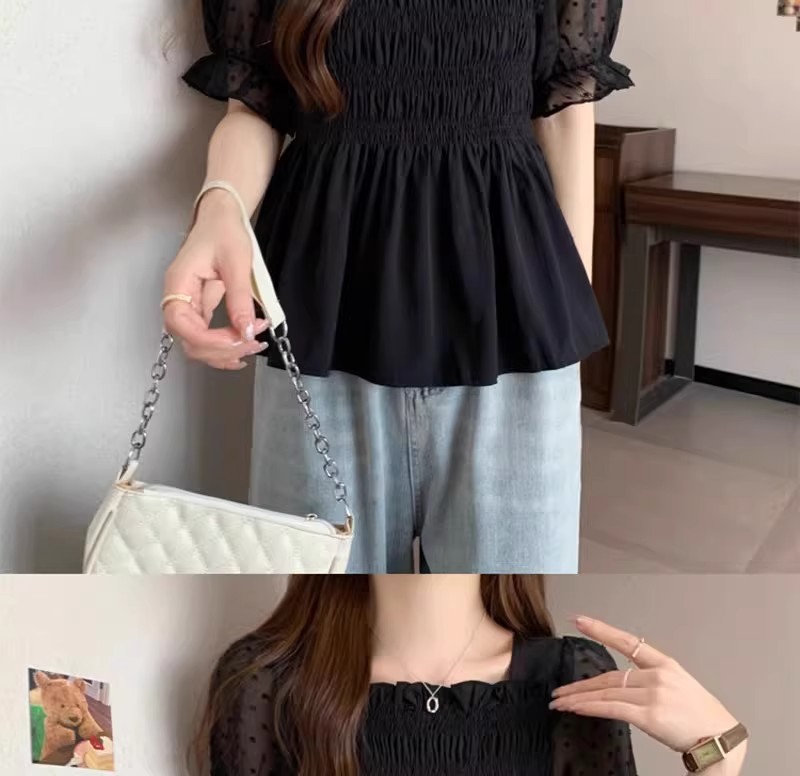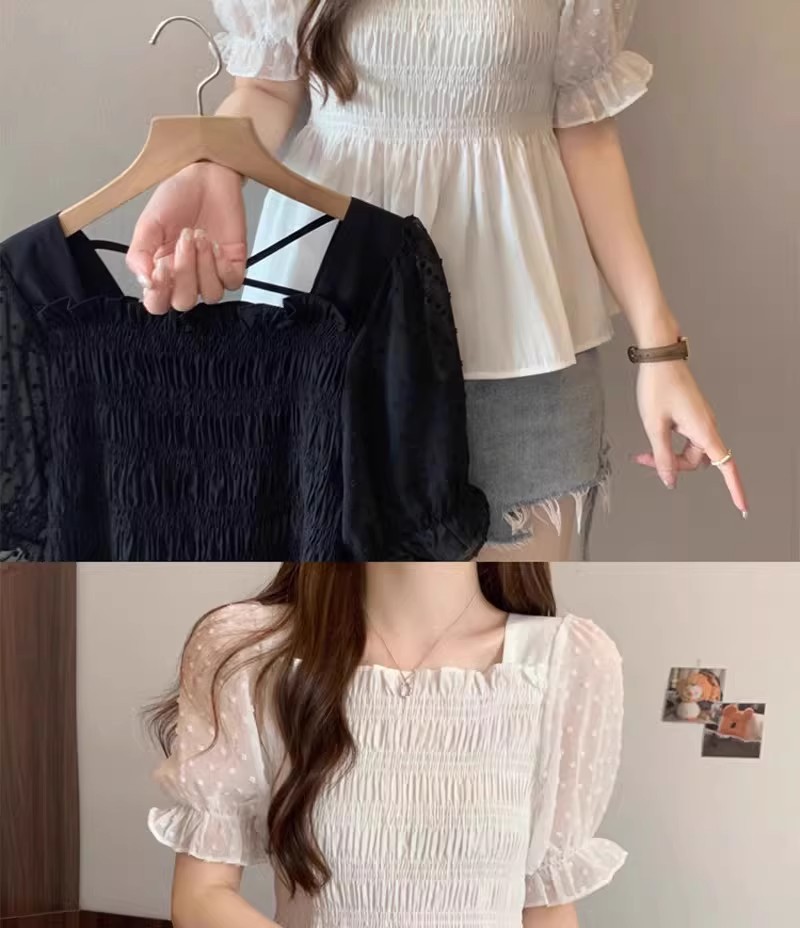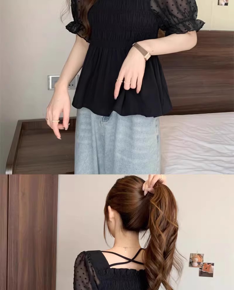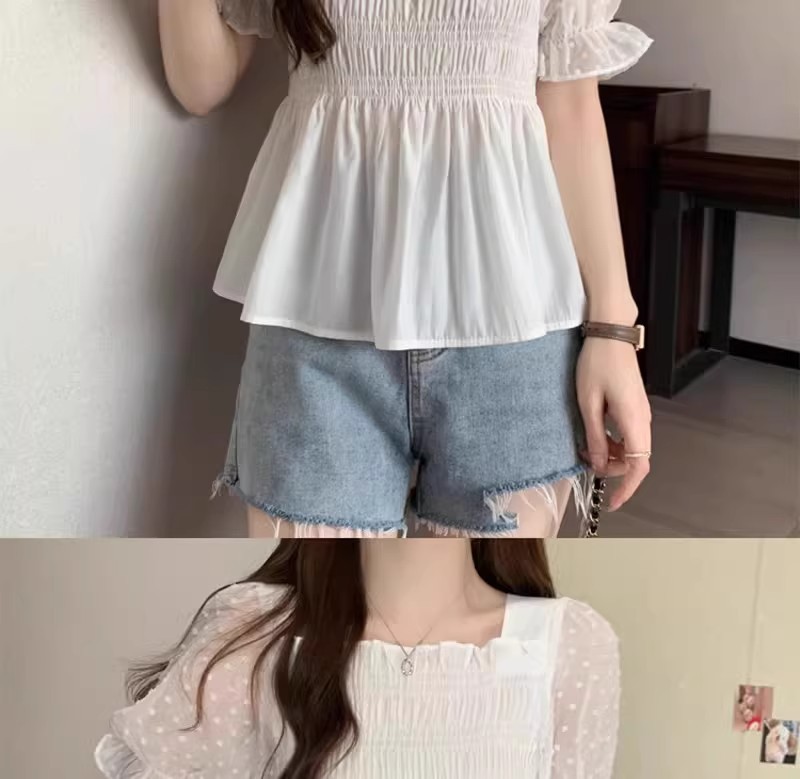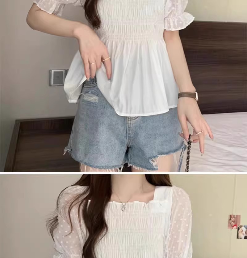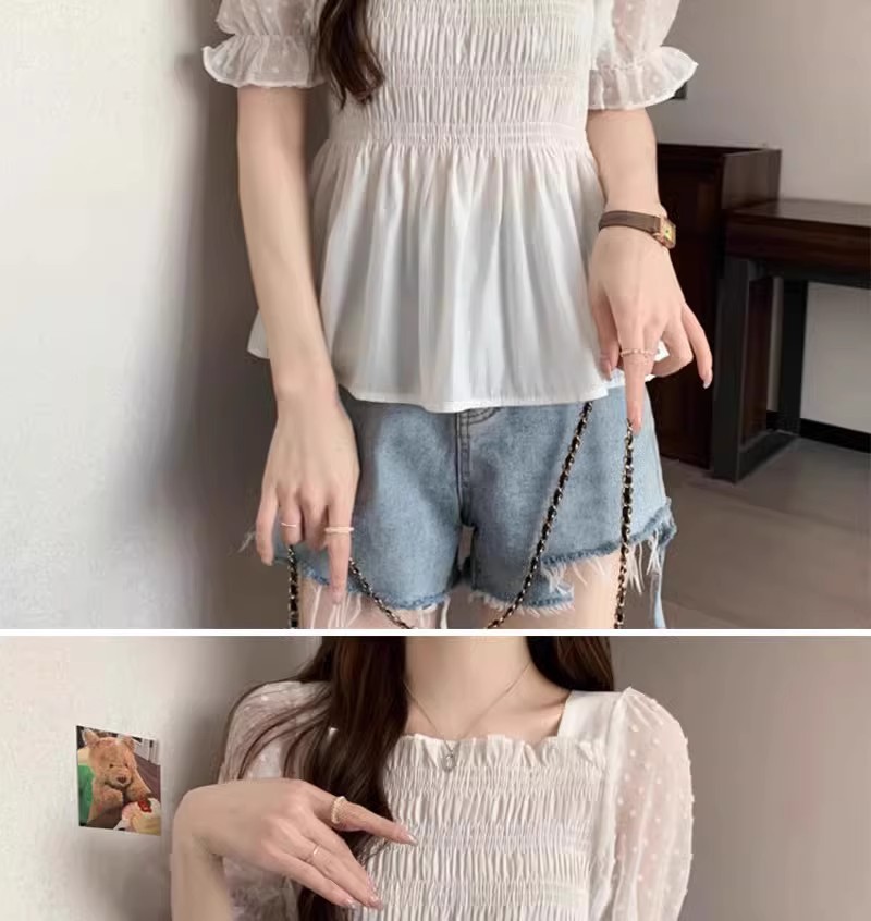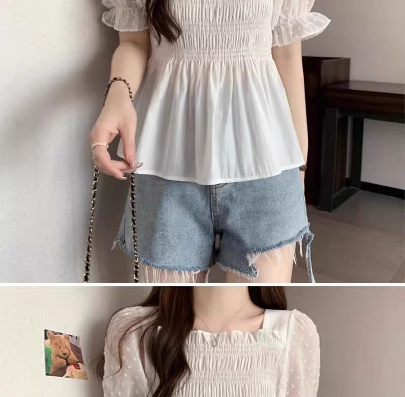 [오리지널 워크] 여성용 스퀘어 넥 반팔 셔츠 2025 여름 신작 크로스 백 디자인 퍼프 슬리브스토어 가기