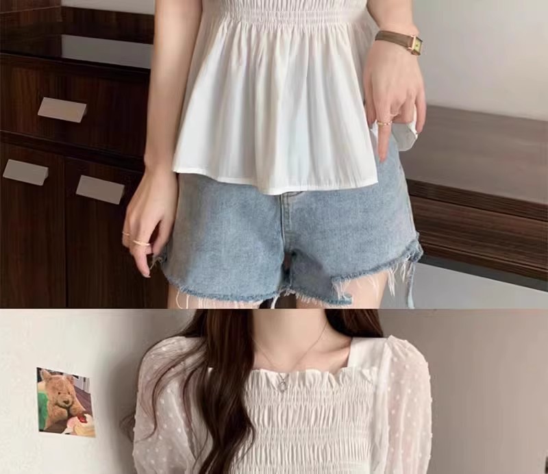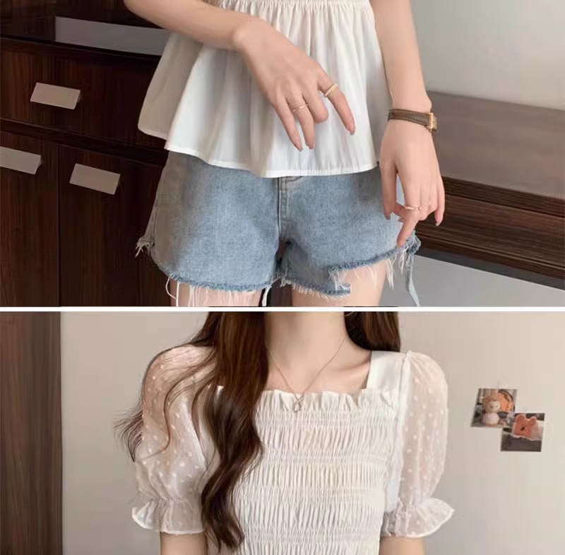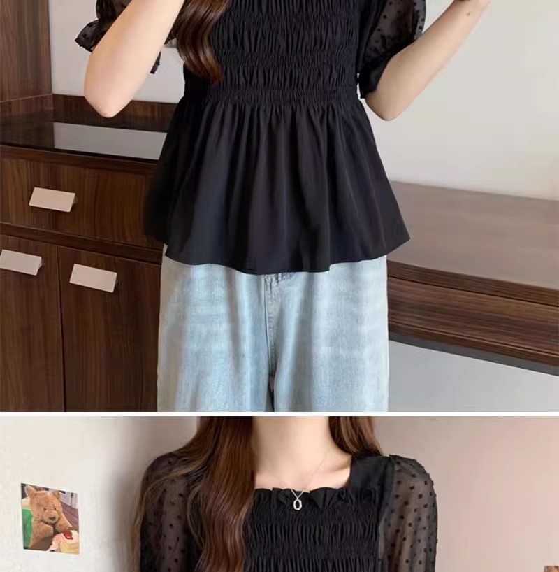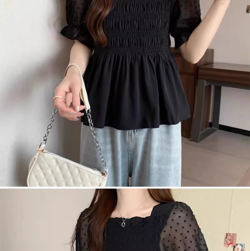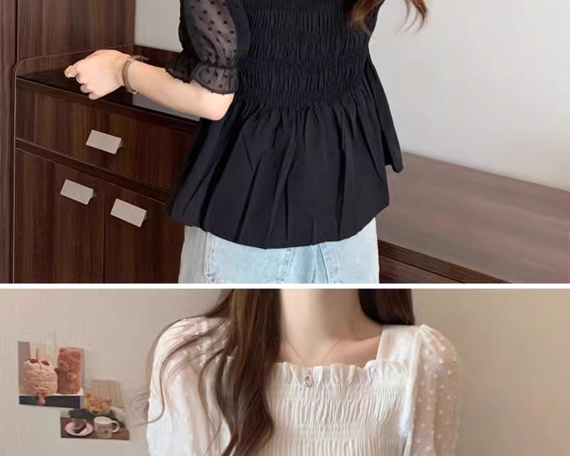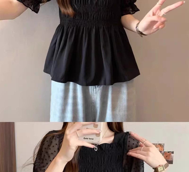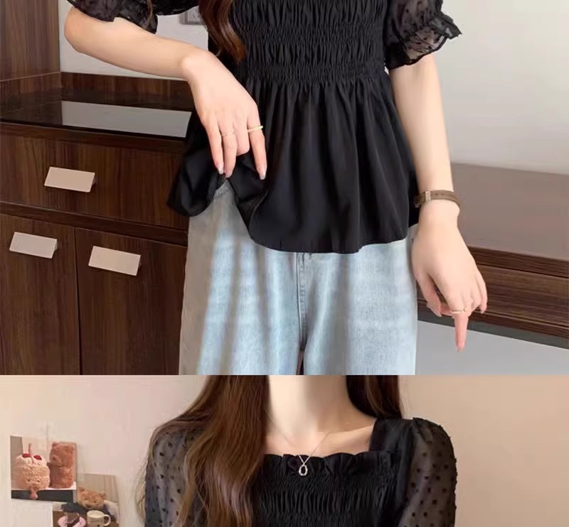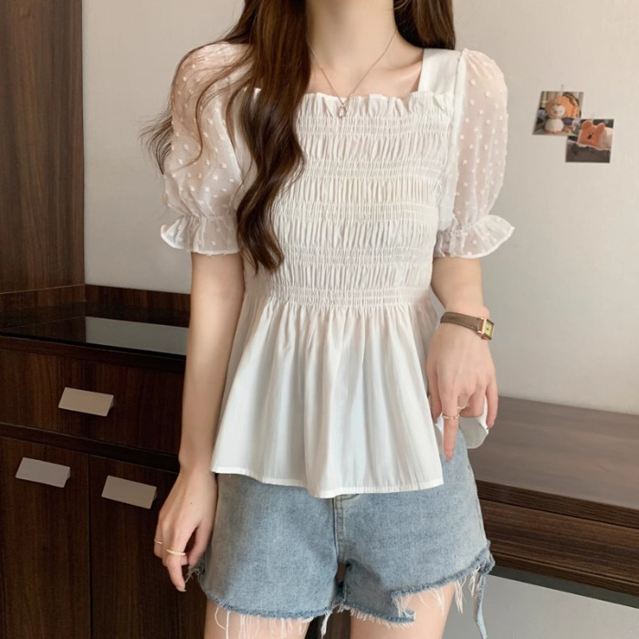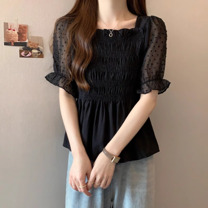 [오리지널 워크] 여성용 스퀘어 넥 반팔 셔츠 2025 여름 신작 크로스 백 디자인 퍼프 슬리브스토어 가기