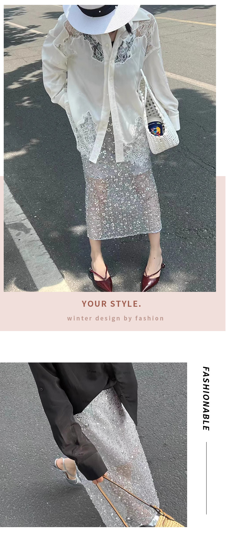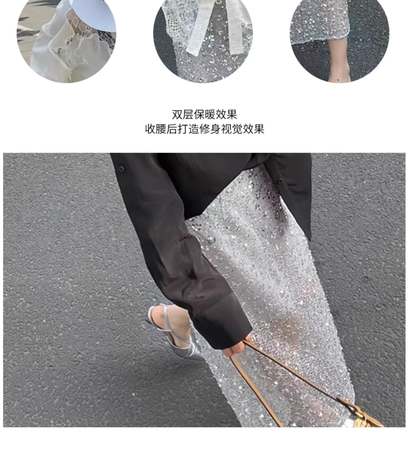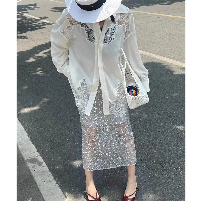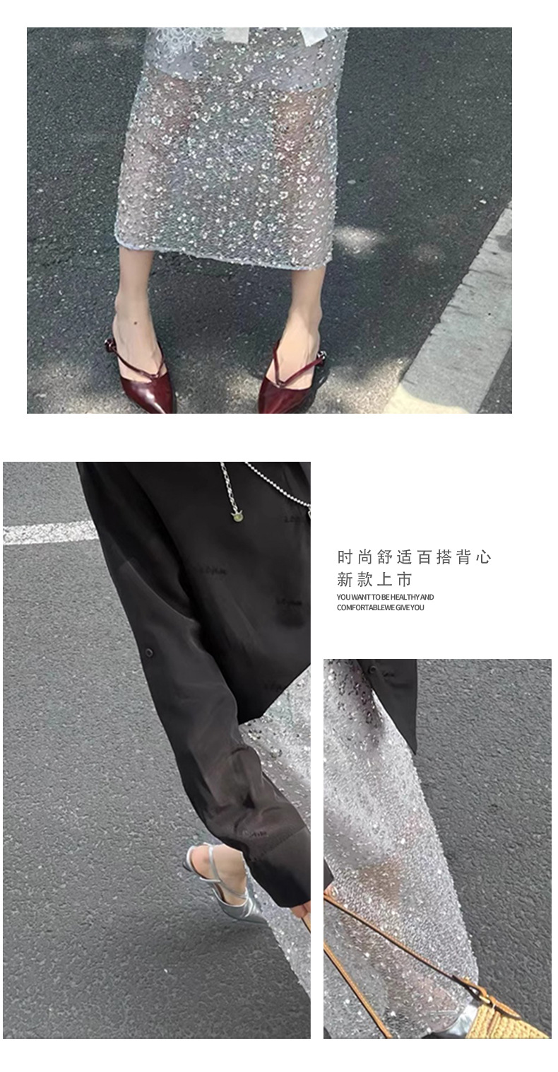고품질 틈새 디자인 헤비 스팽글 스커트 약간 시스루 여성스러운 스커트 상큼한 여름 스커트