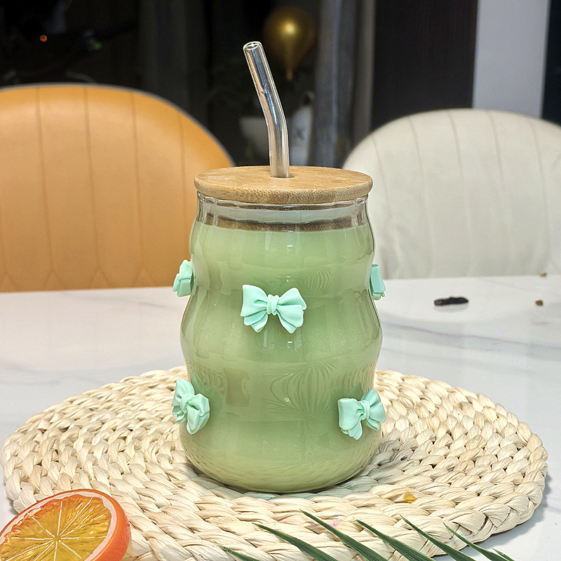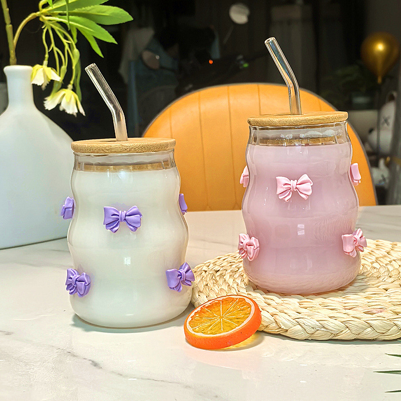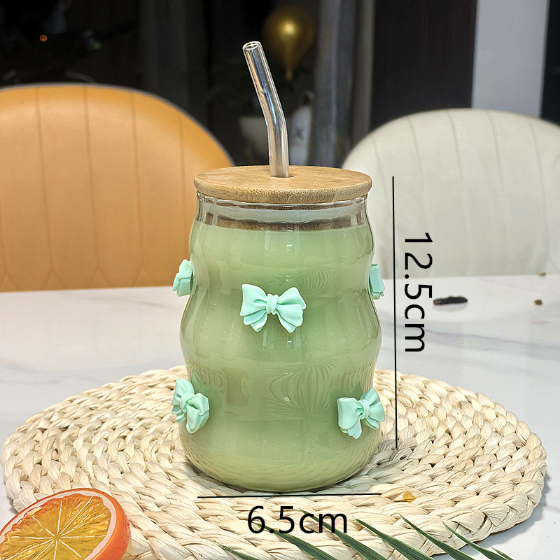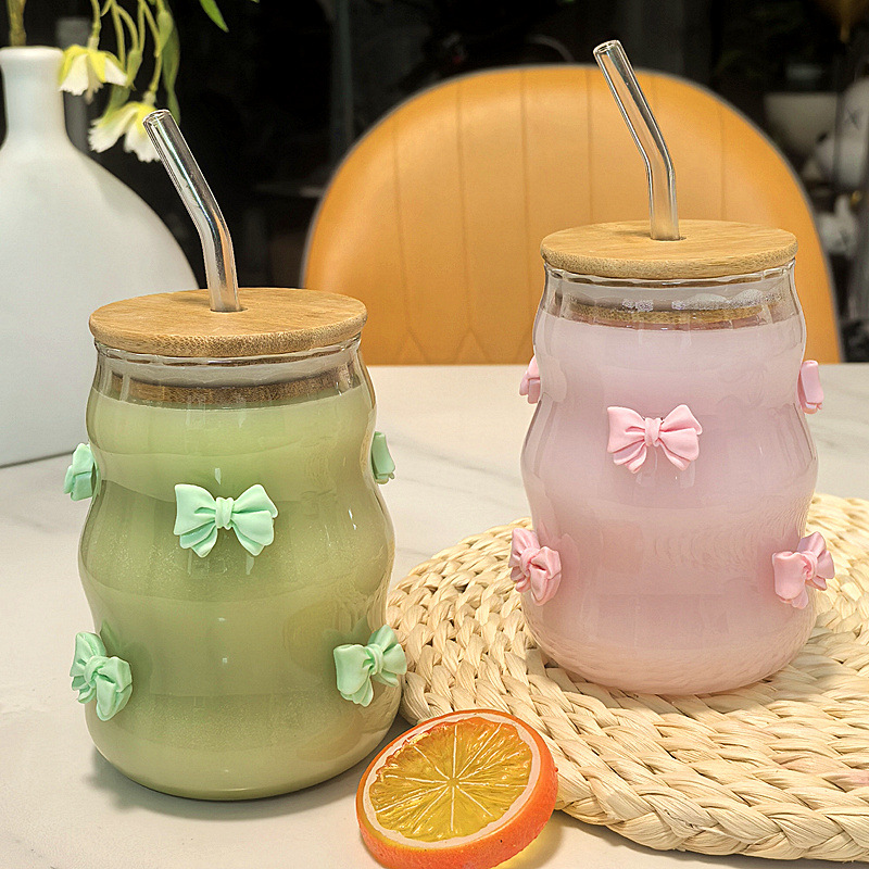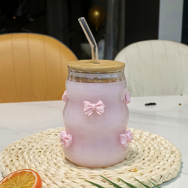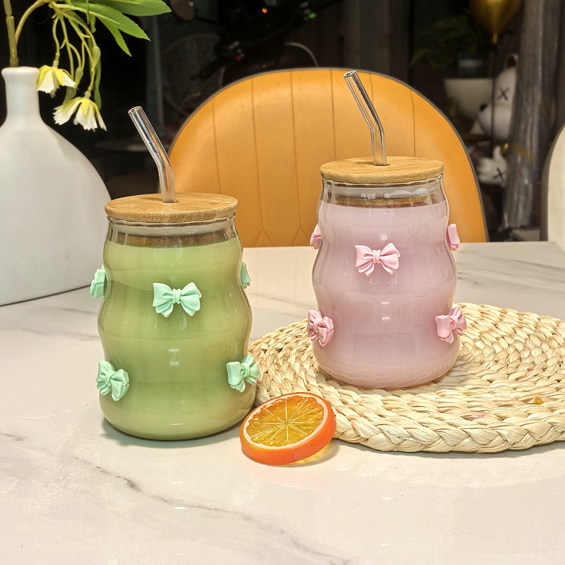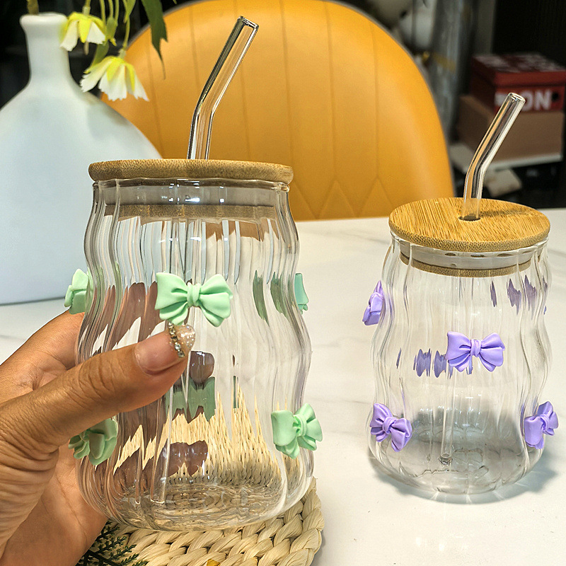 귀여운 나비 매듭 수직 스트로 컵 가정용 커피 컵 대나무 뚜껑이있는 주스 밀크 티 컵 고온 방지 유리 컵