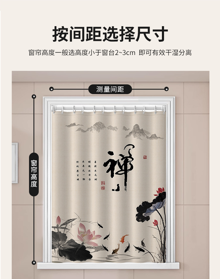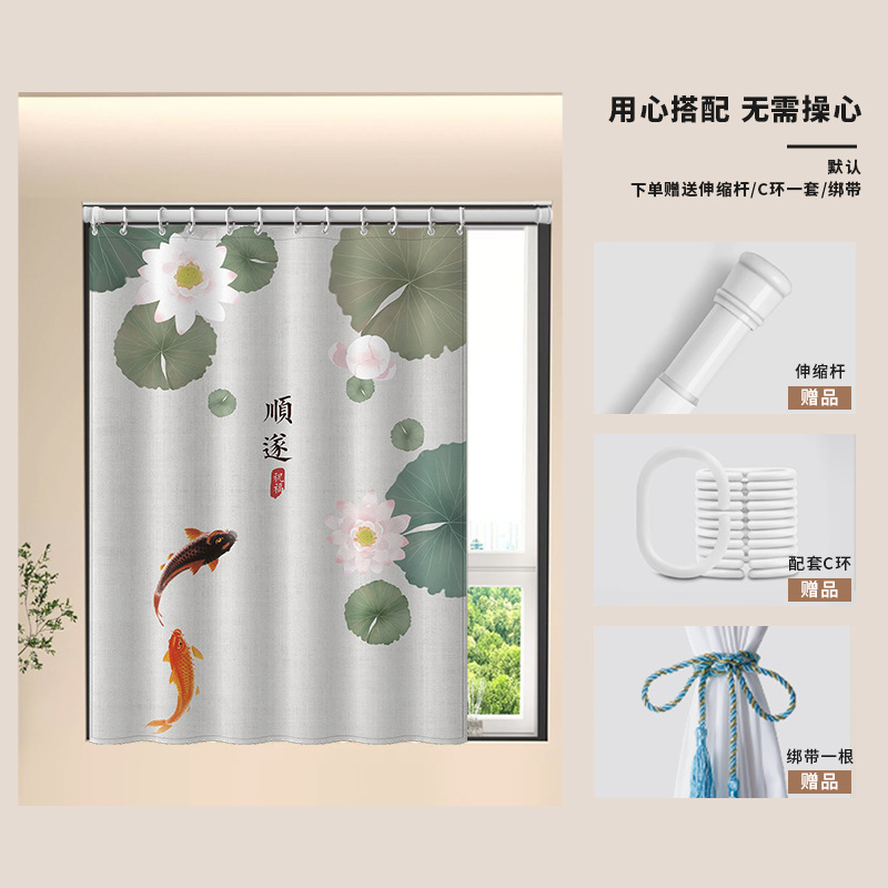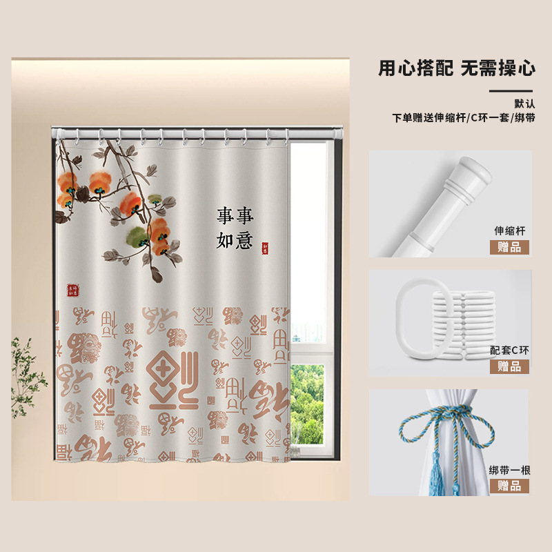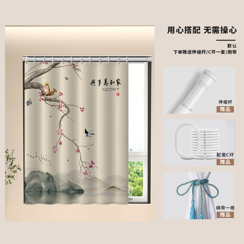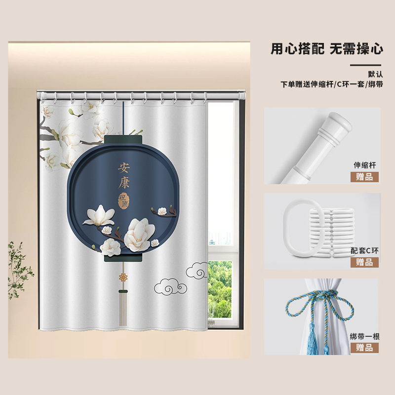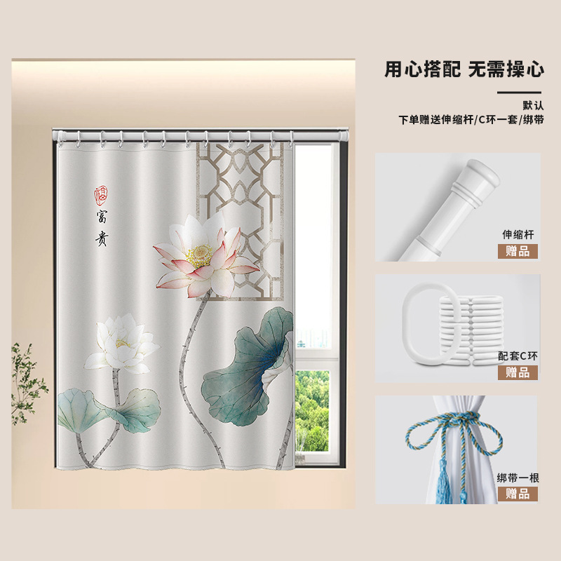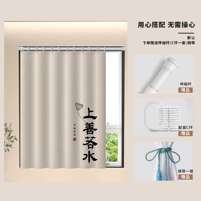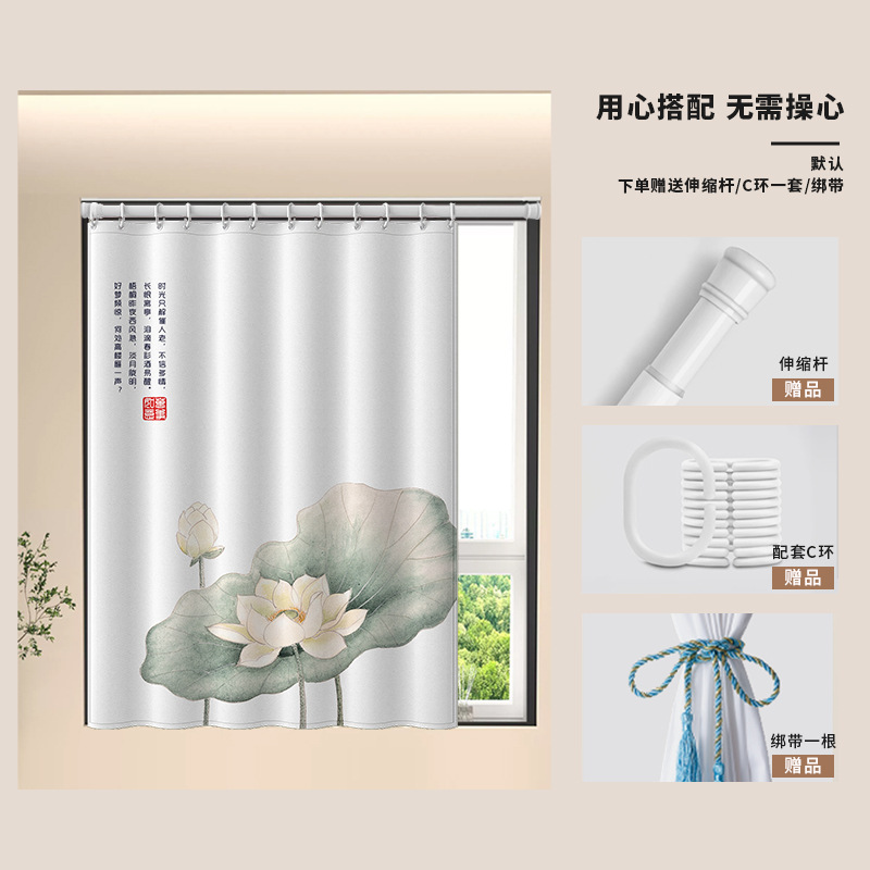 중국식 욕실 커튼, 펀치 없는 텔레스코픽 막대, 욕실 창 커튼, 방수 및 노출 방지 주방 차양