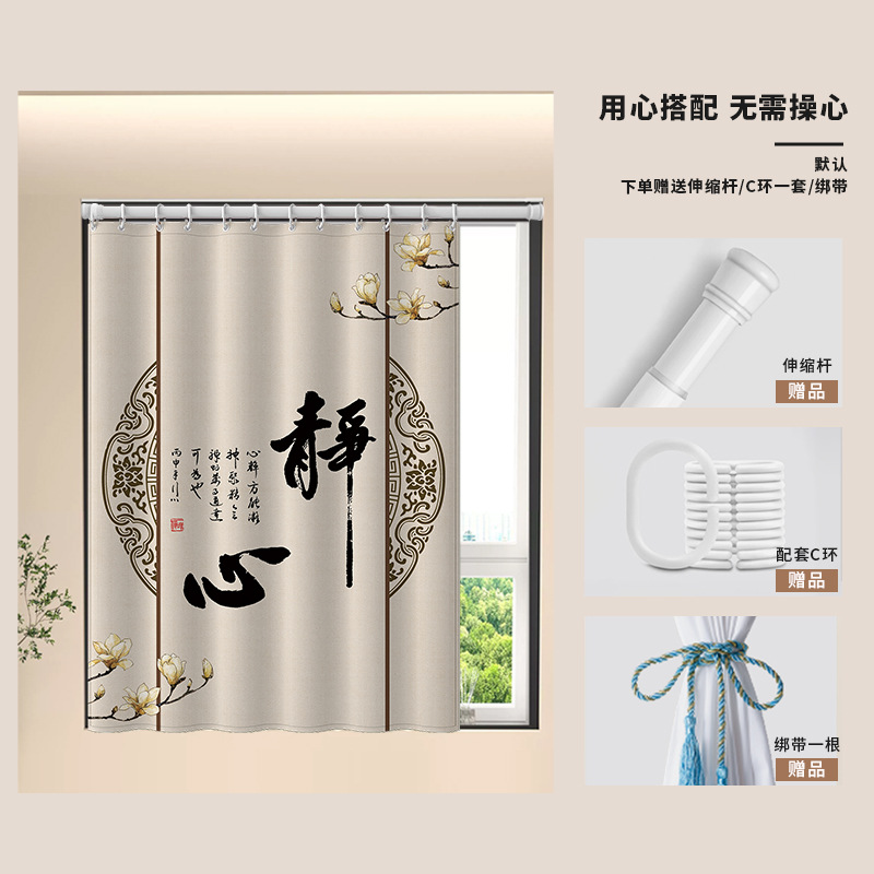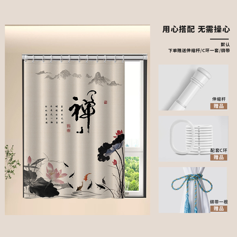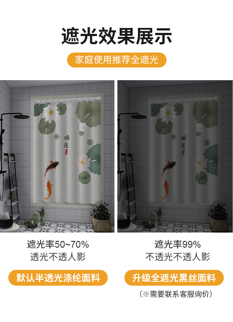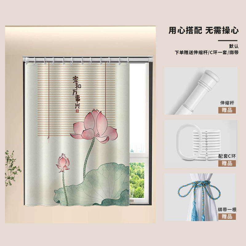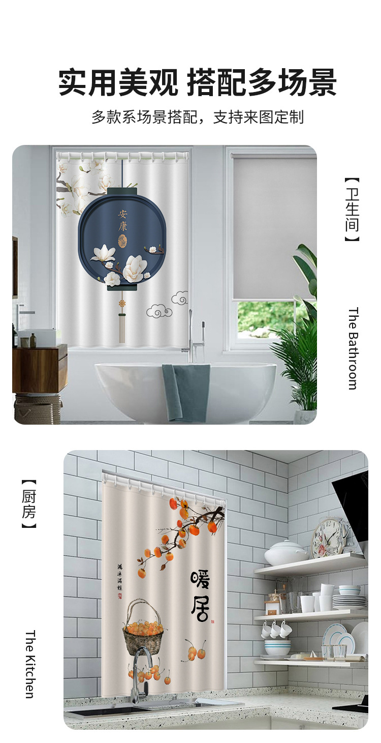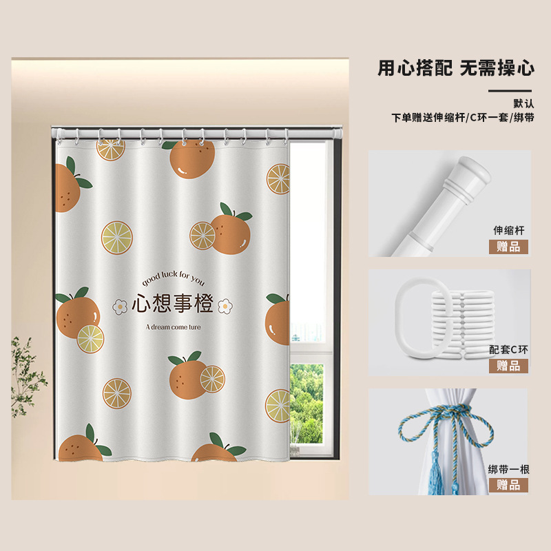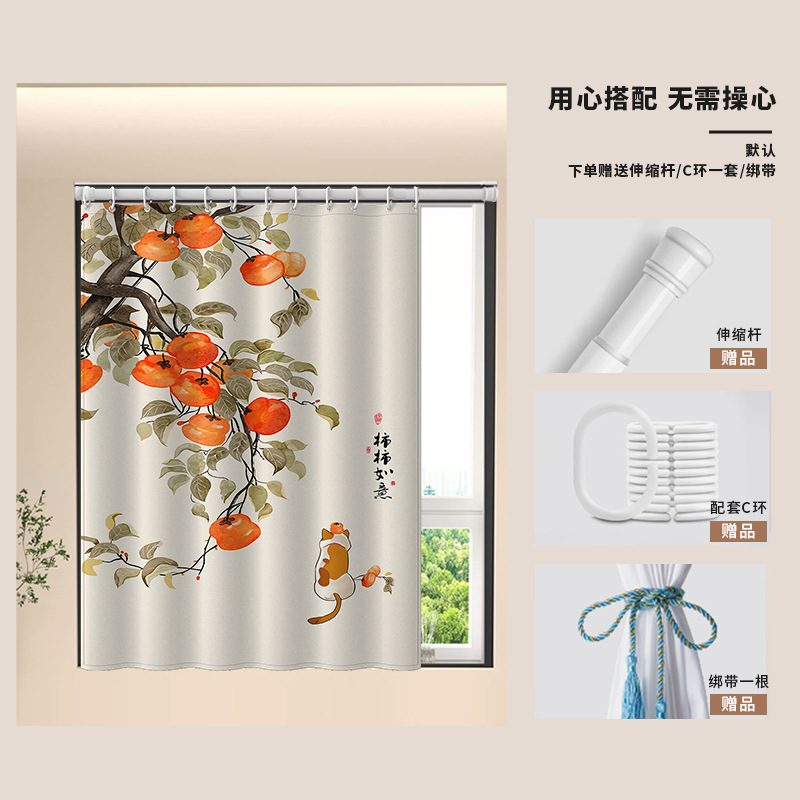 중국식 욕실 커튼, 펀치 없는 텔레스코픽 막대, 욕실 창 커튼, 방수 및 노출 방지 주방 차양