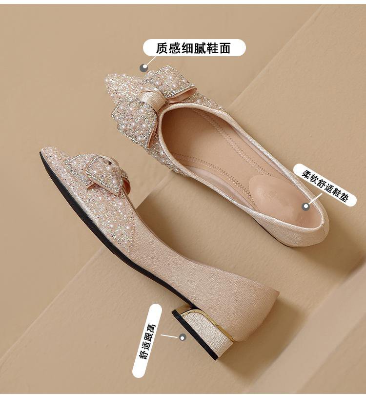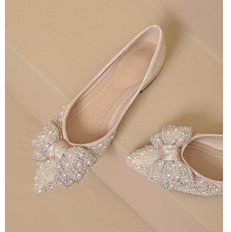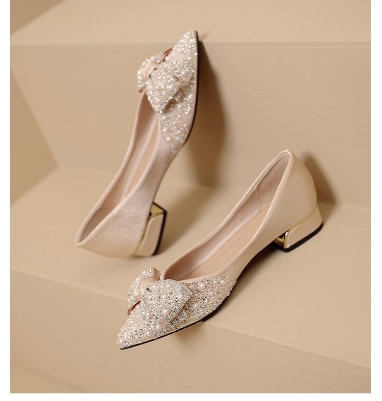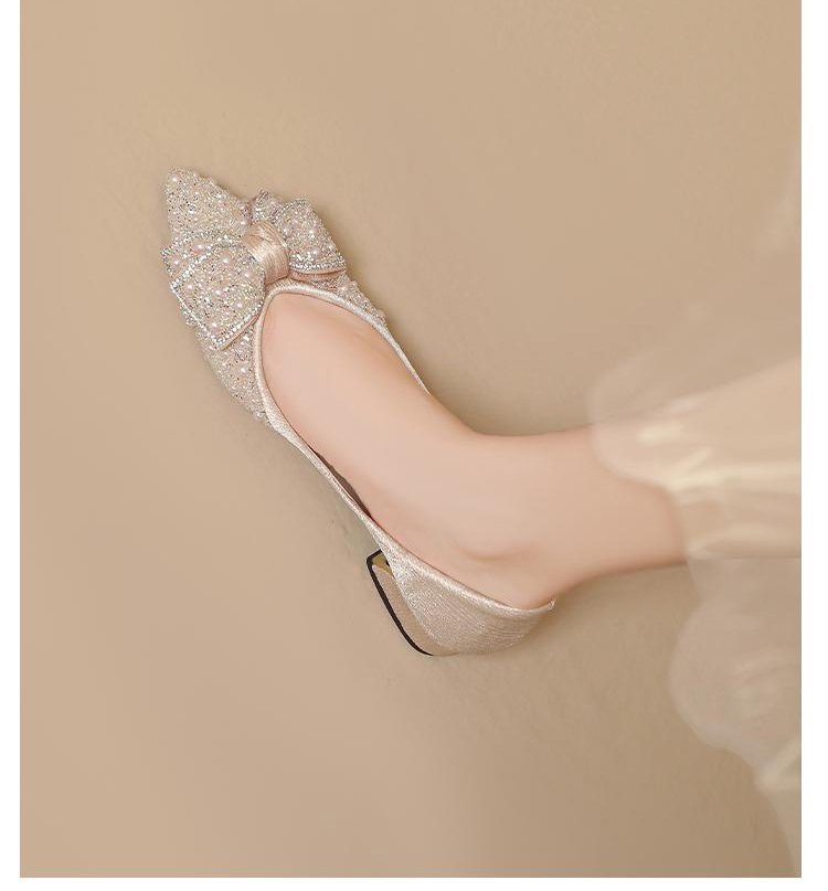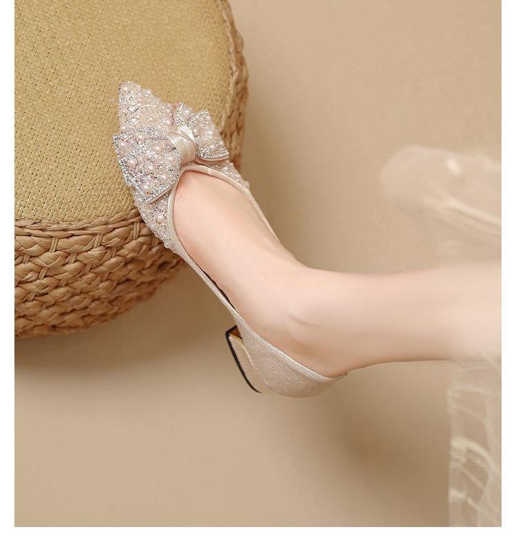 인기 있는 부드러운 밑창 2025 신발 새로운 스타일 진주 라인스톤 뾰족한 나비 매듭 프렌치 펌프스 진주 젠틀스토어 가기