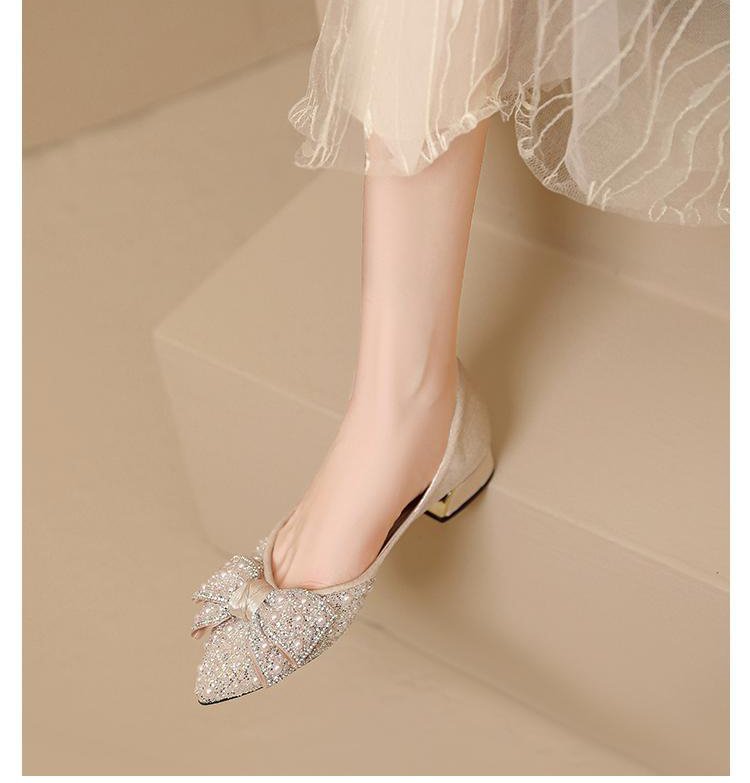 인기 있는 부드러운 밑창 2025 신발 새로운 스타일 진주 라인스톤 뾰족한 나비 매듭 프렌치 펌프스 진주 젠틀