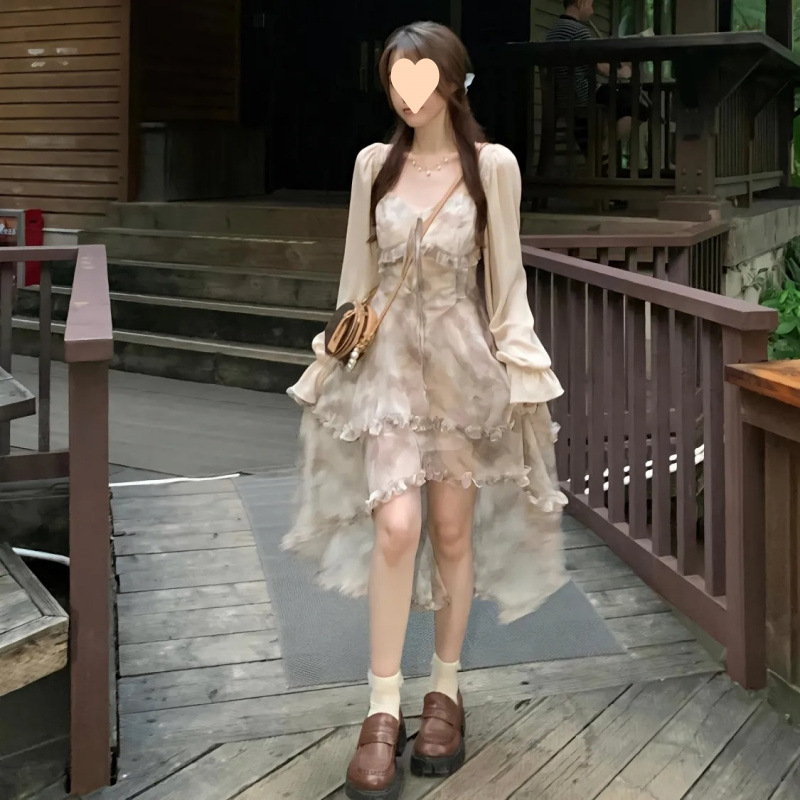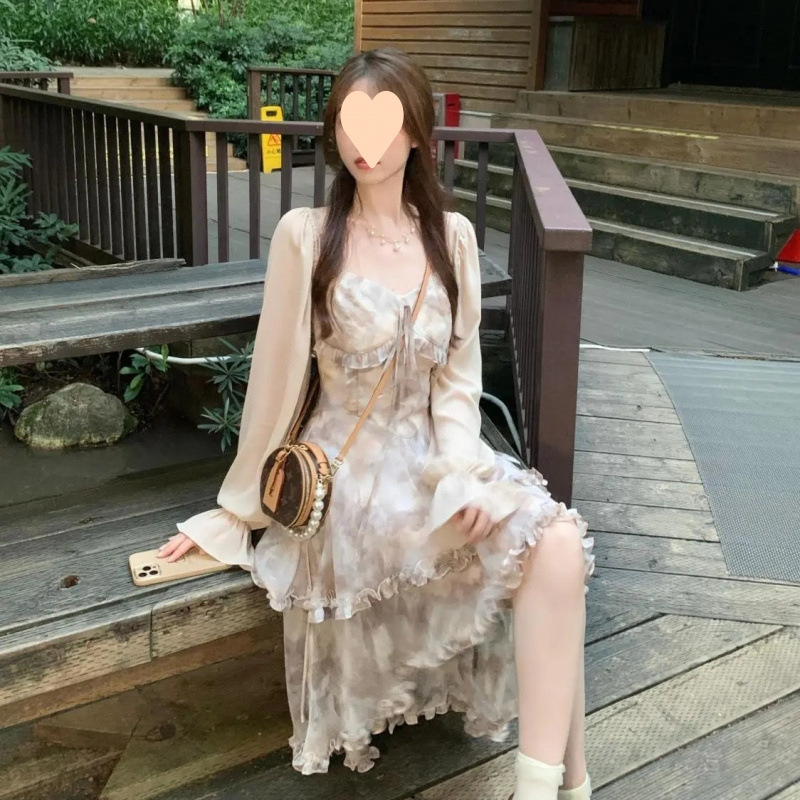 잉크 잉장 서스펜더 드레스, 우아하고 우아한 꽃무늬 롱 스커트, 여성용 달콤한 쉬폰 가디건 여름 슈트