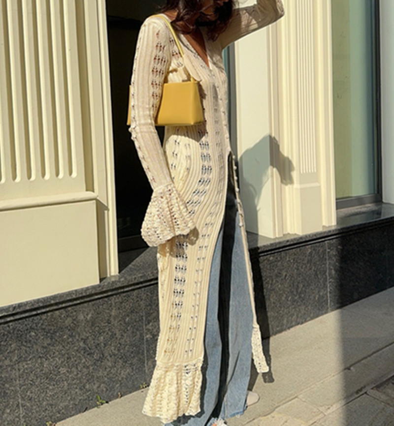유럽과 미국 스타일의 섹시한 여성들을 위한 레이스 장식 롱 니트 자켓, 디자인감 있는 러플 장식과 레이지 스타일의 플레어 슬리브 원피스스토어 가기