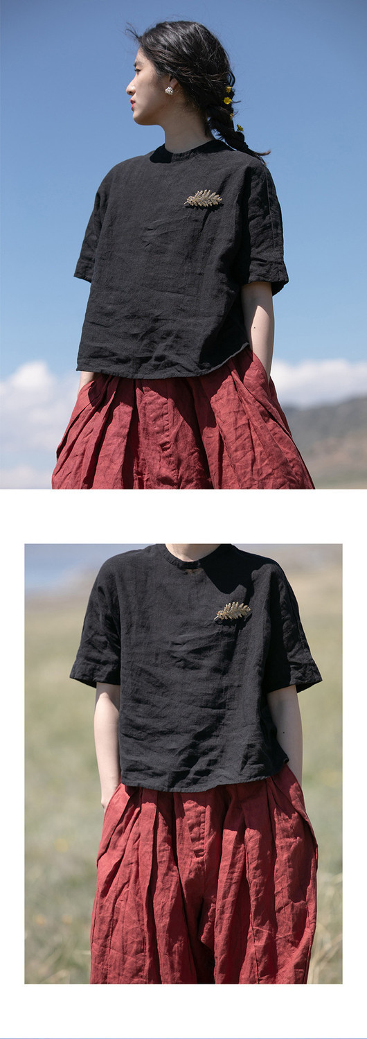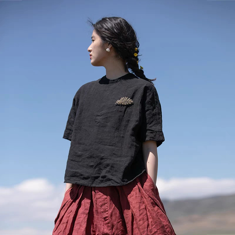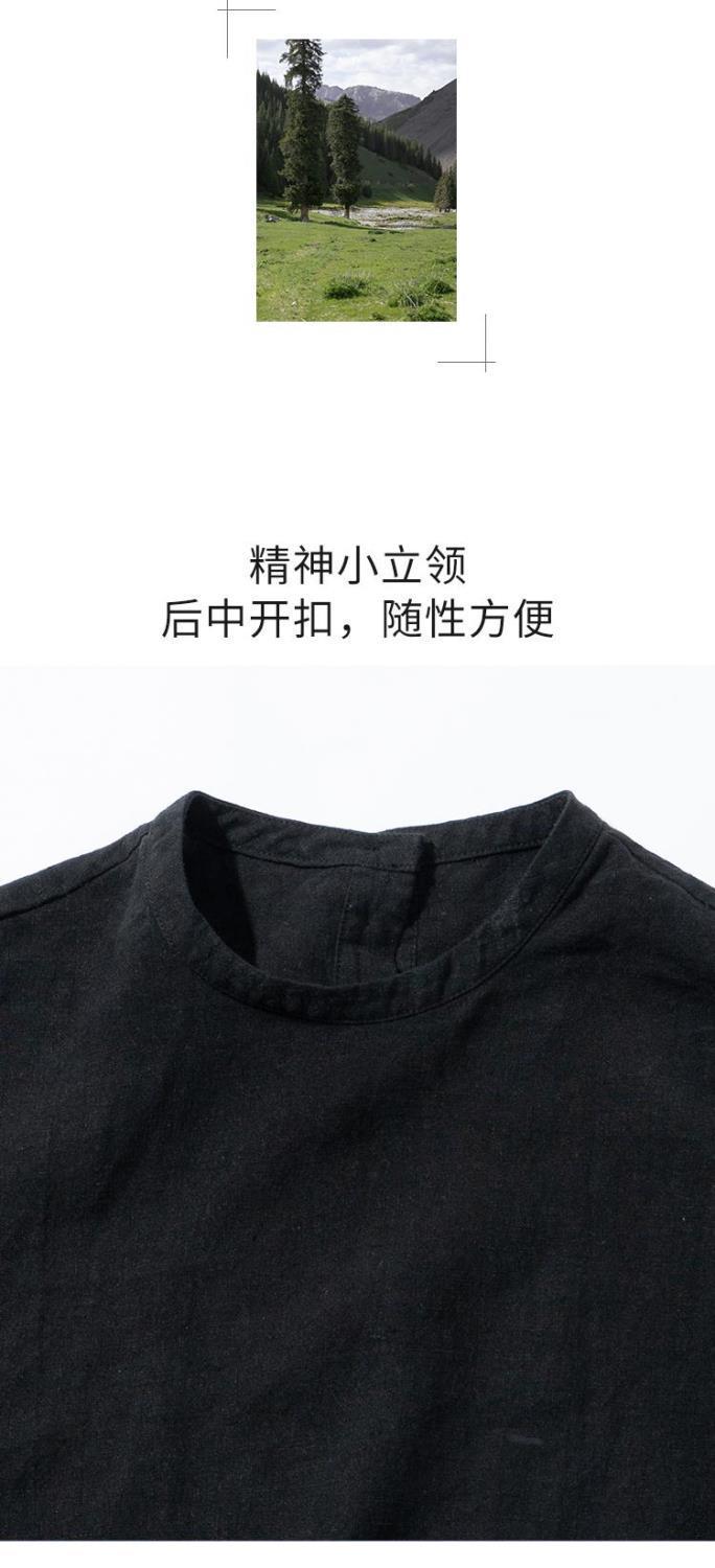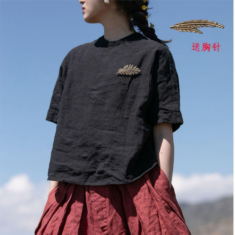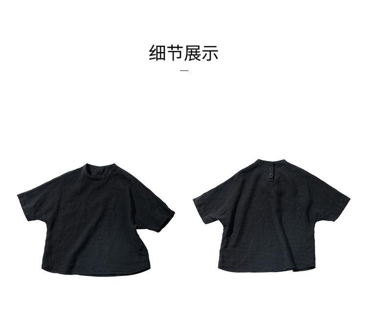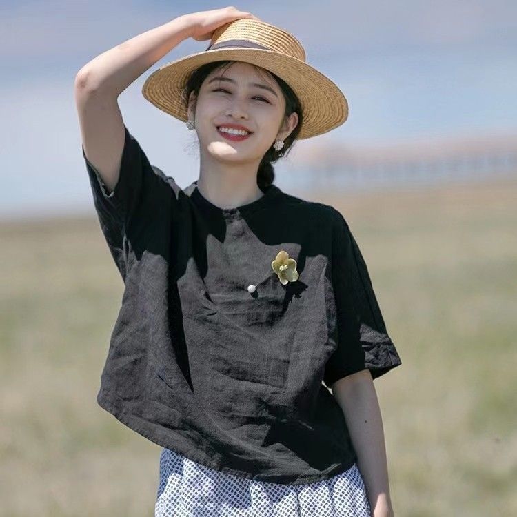 2025 여름 새로운 복고풍 블랙 스탠드 칼라 반팔 리넨 셔츠 여성 티셔츠 느슨한 다목적 예술적 셔츠 여성스토어 가기
