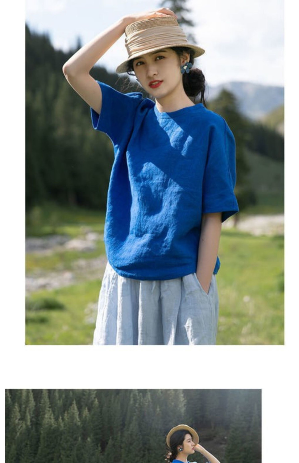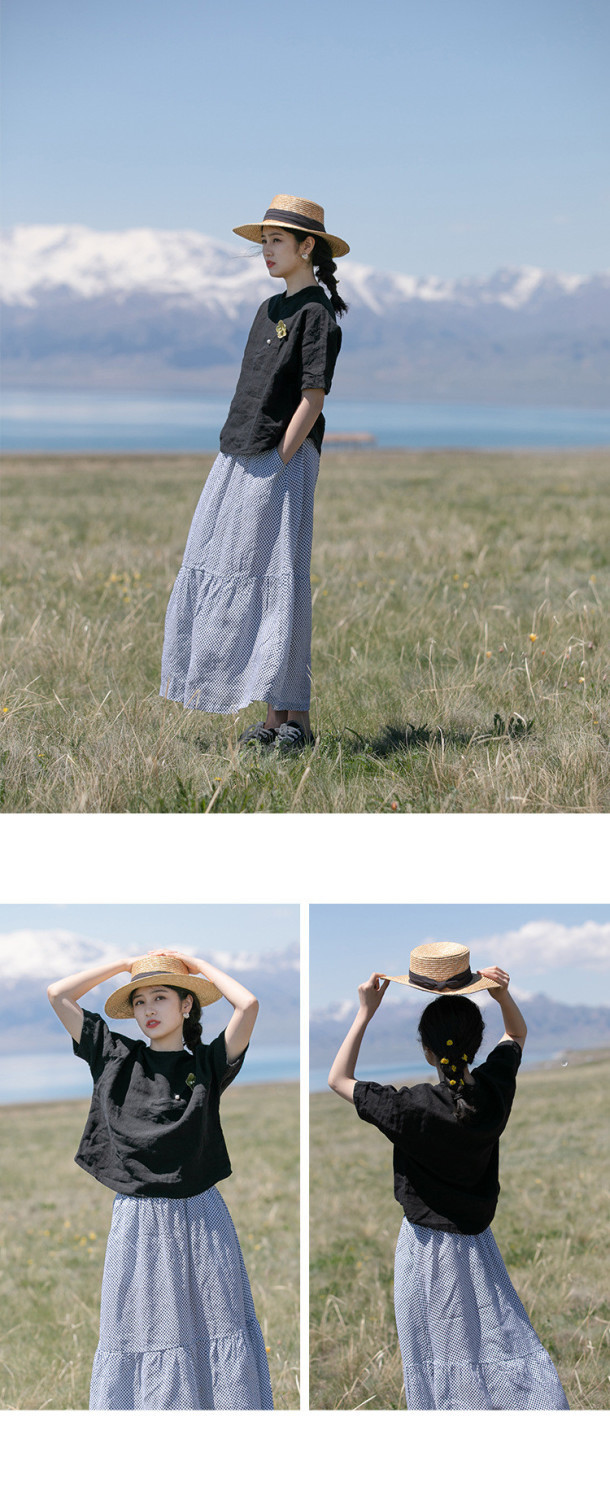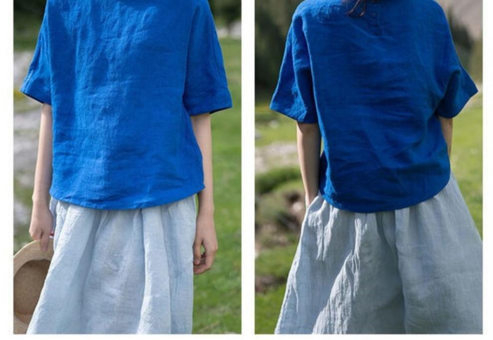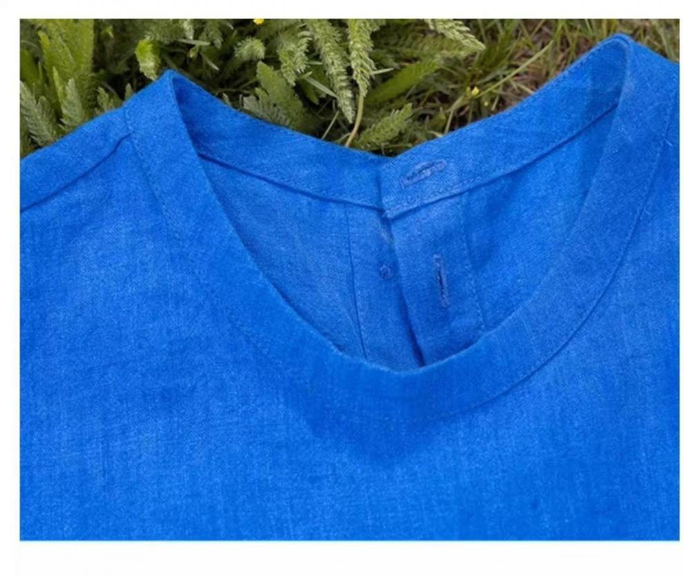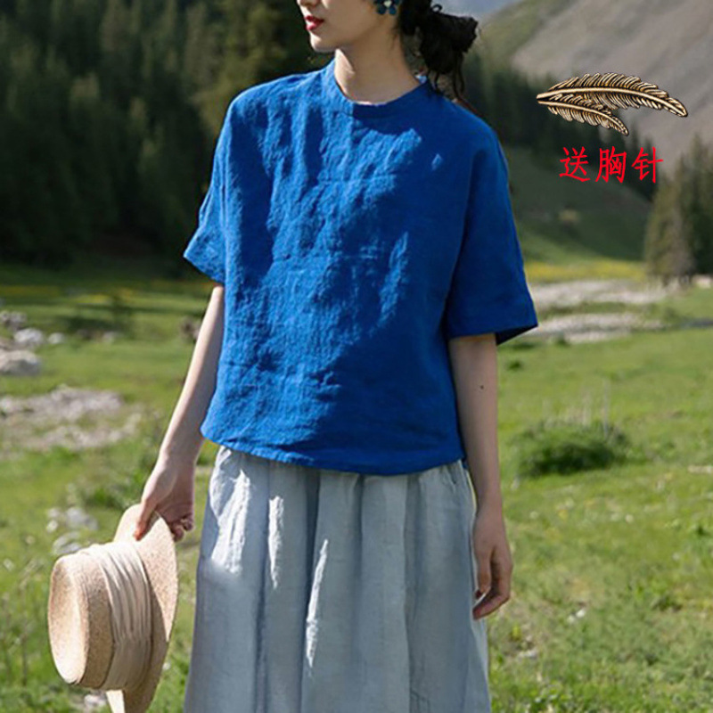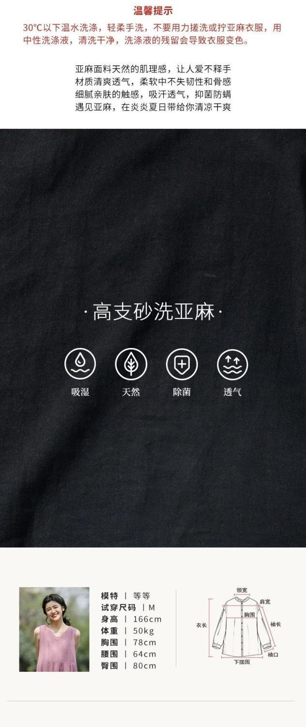 2025 여름 새로운 복고풍 블랙 스탠드 칼라 반팔 리넨 셔츠 여성 티셔츠 느슨한 다목적 예술적 셔츠 여성스토어 가기