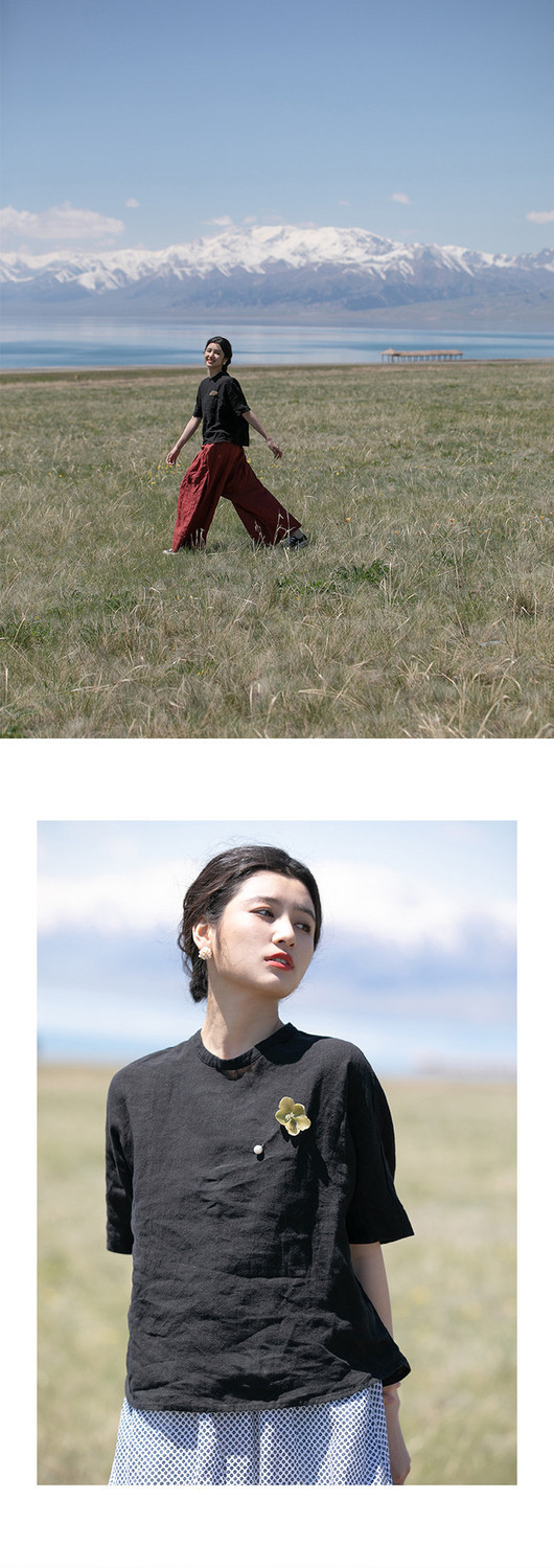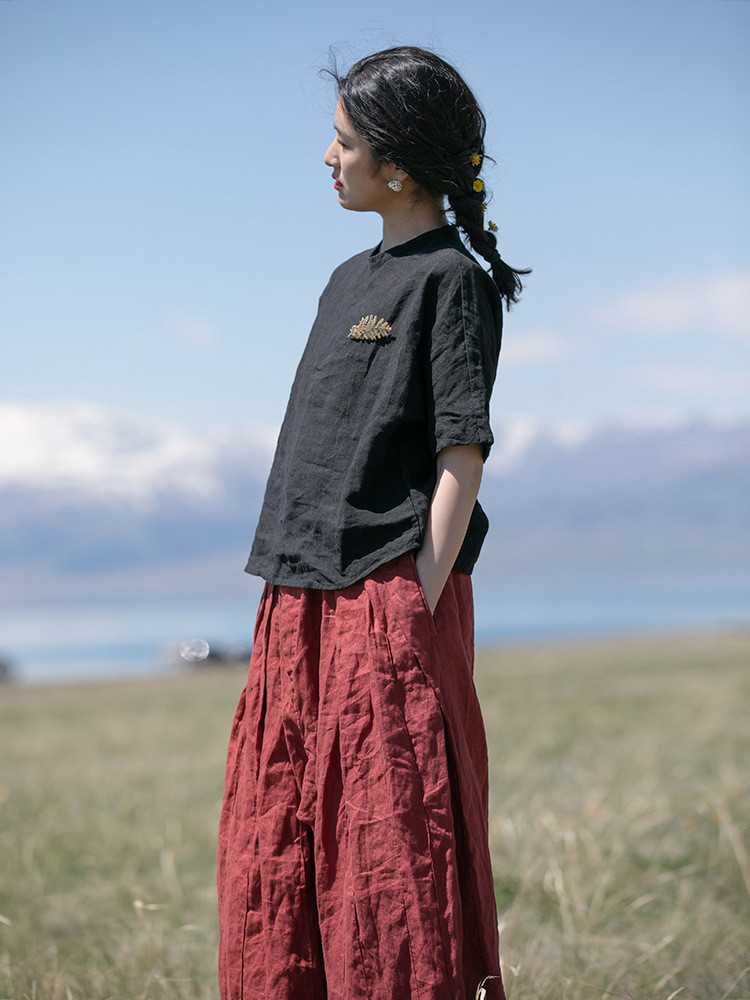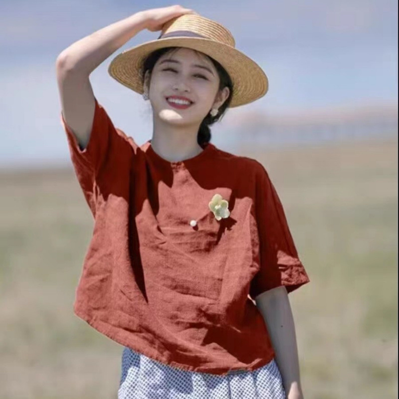 2025 여름 새로운 복고풍 블랙 스탠드 칼라 반팔 리넨 셔츠 여성 티셔츠 느슨한 다목적 예술적 셔츠 여성