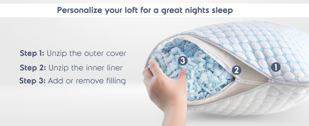 Premium shredded memory foam is easily removable, allowing you to customize the pillow to your sleep position preferences