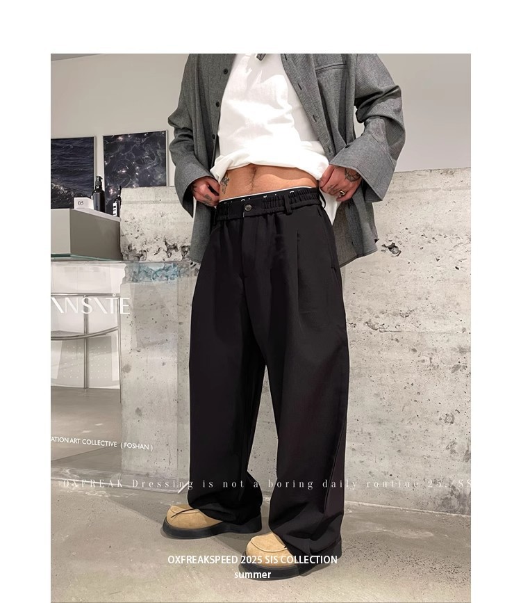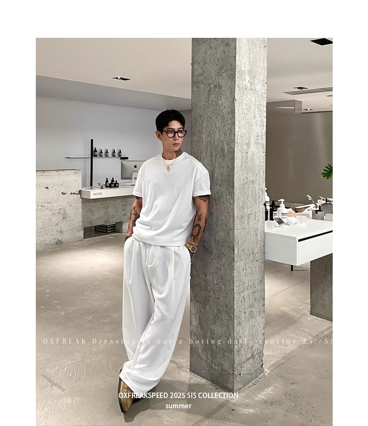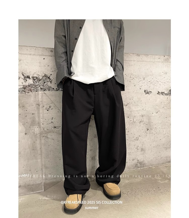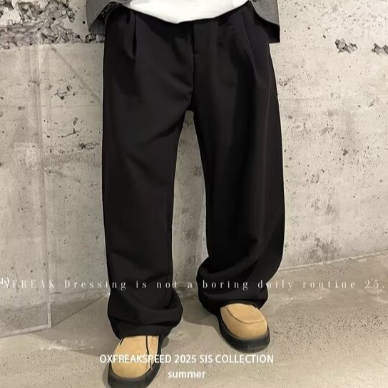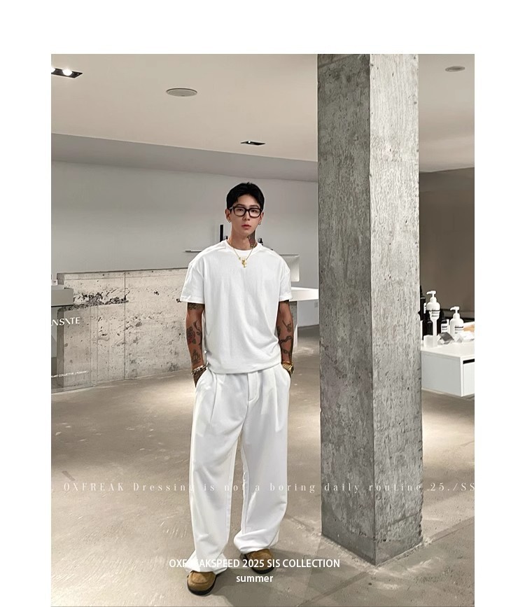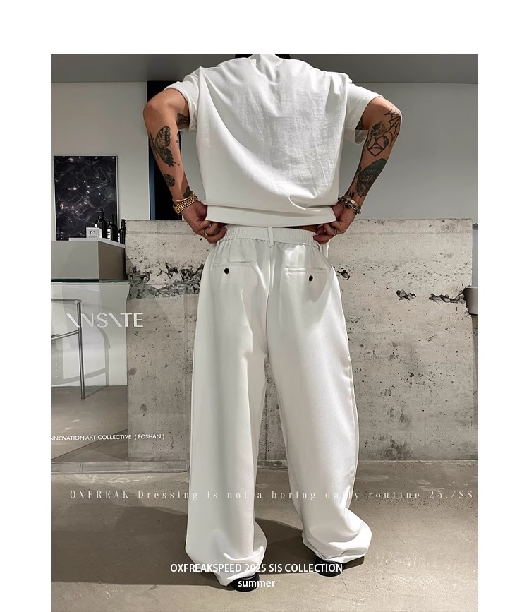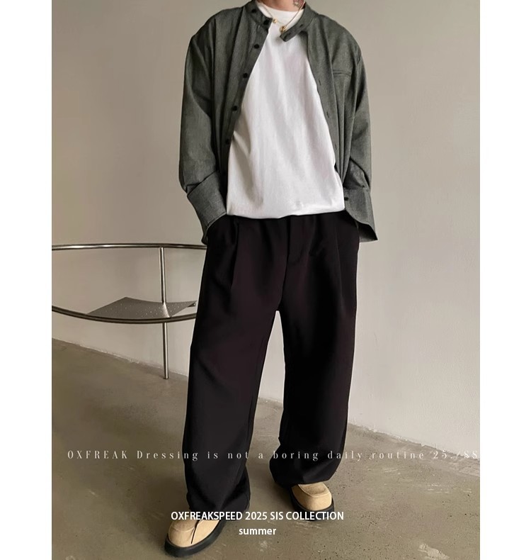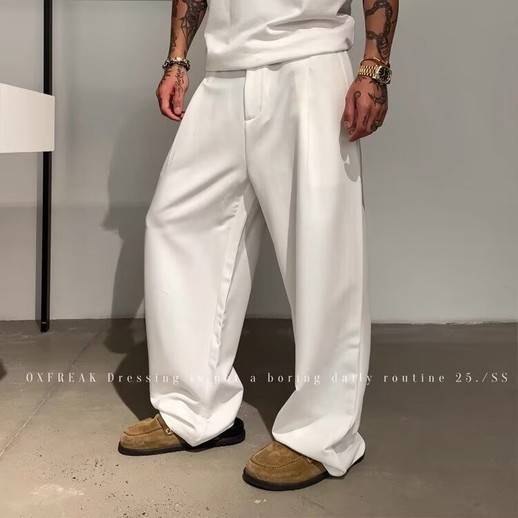 올드머니 스타일 "통근 주름 방지 원단" 싱글 플리츠 화이트 캐주얼 팬츠 남성 루즈 와이드 팬츠스토어 가기